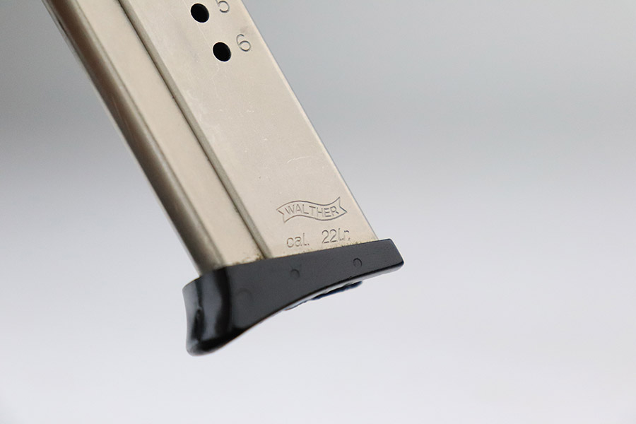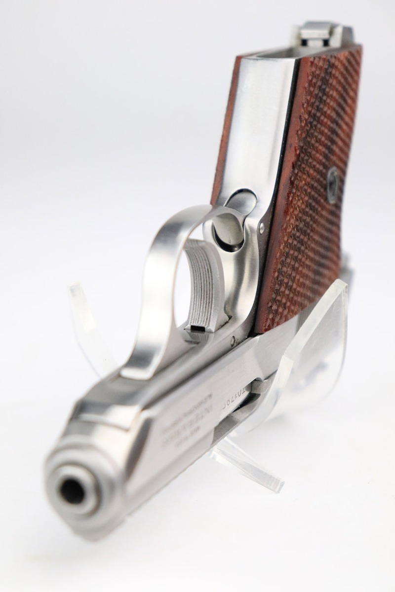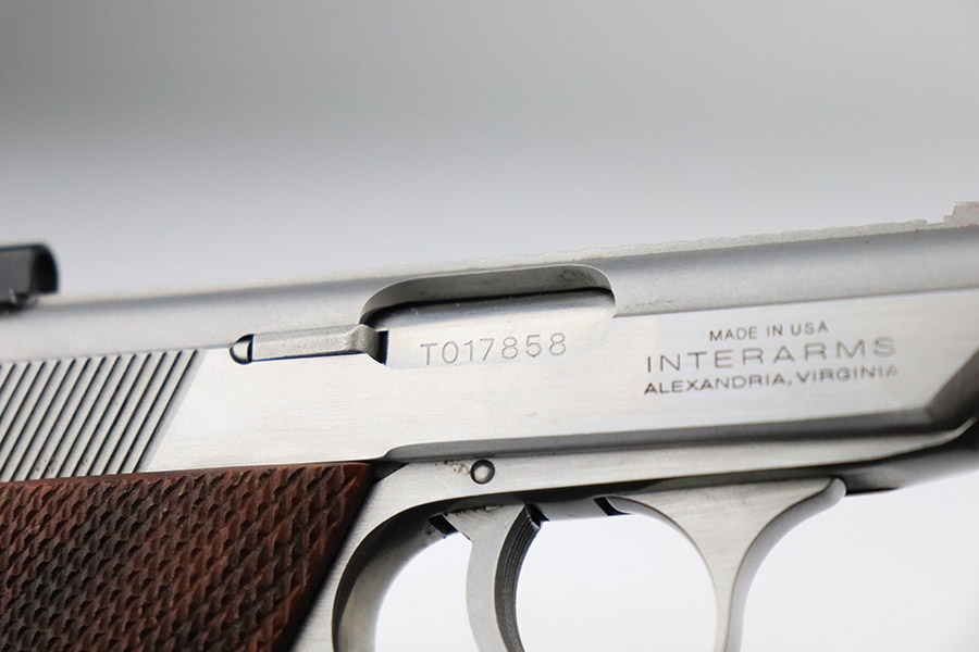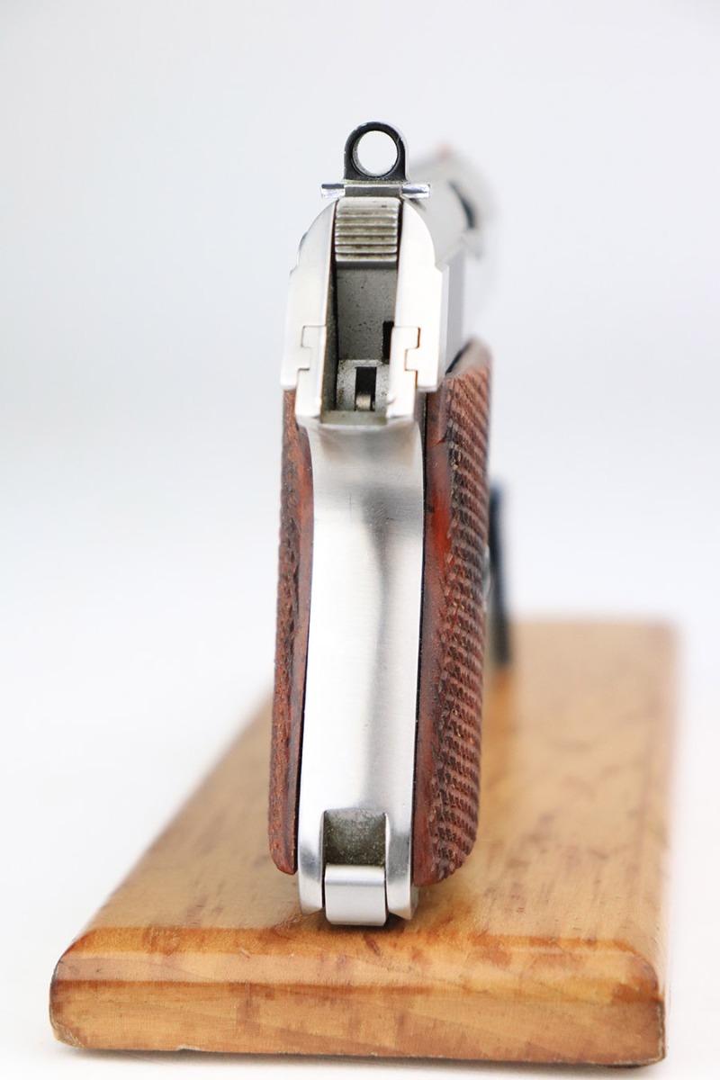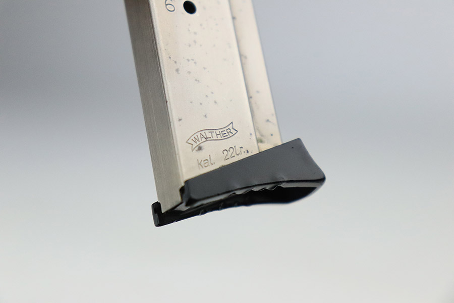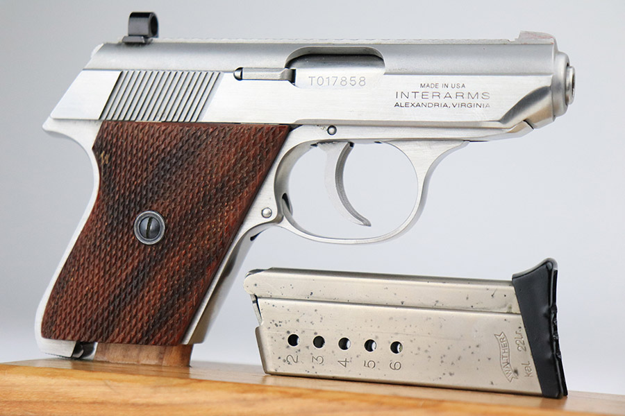 11/17/22 – This is an excellent example of a Walther Model TPH made in the US in the late 1980’s early 1990’s. Chambered in .22 LR. It is all matching and comes with its original matching box, original matching test target, owners manual, and one finger extension magazine. There are some small notches in the plastic mag base. The gun itself has a stainless finish and is in excellent condition. There are just some tiny scratches and handling marks along both sides of the slide. Comes with minty wood grips. The bore is near-mint.