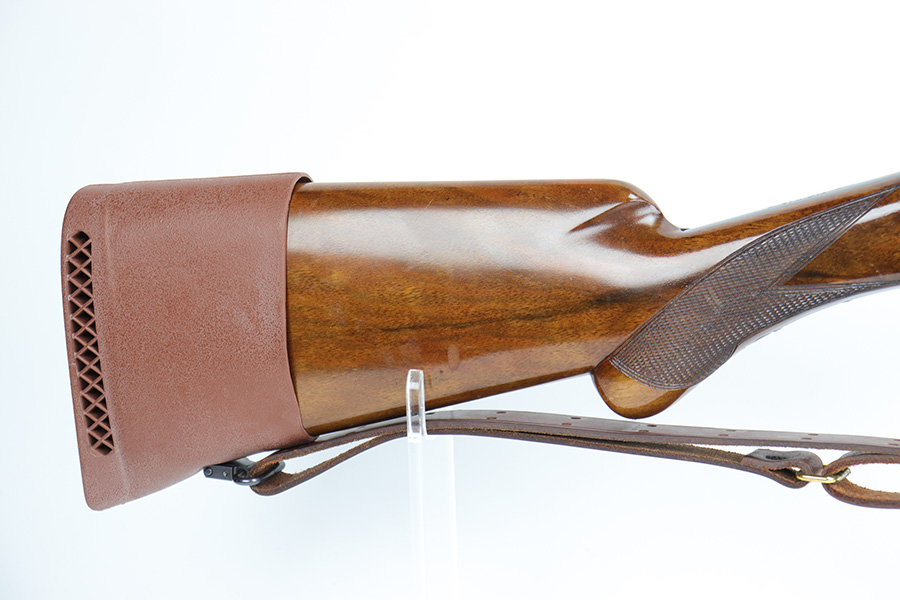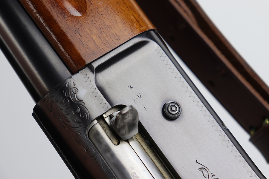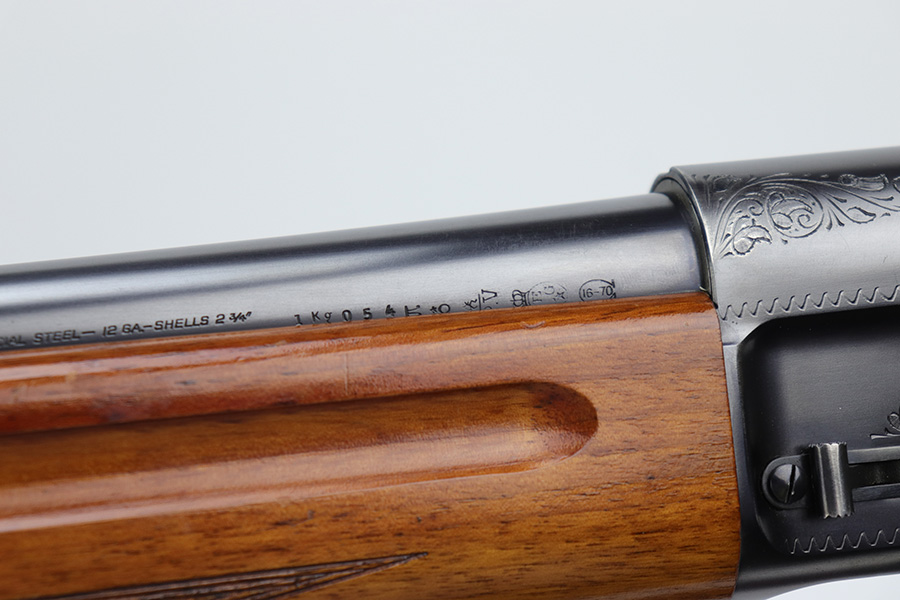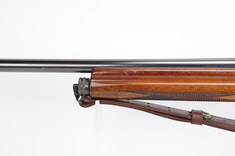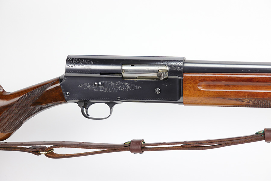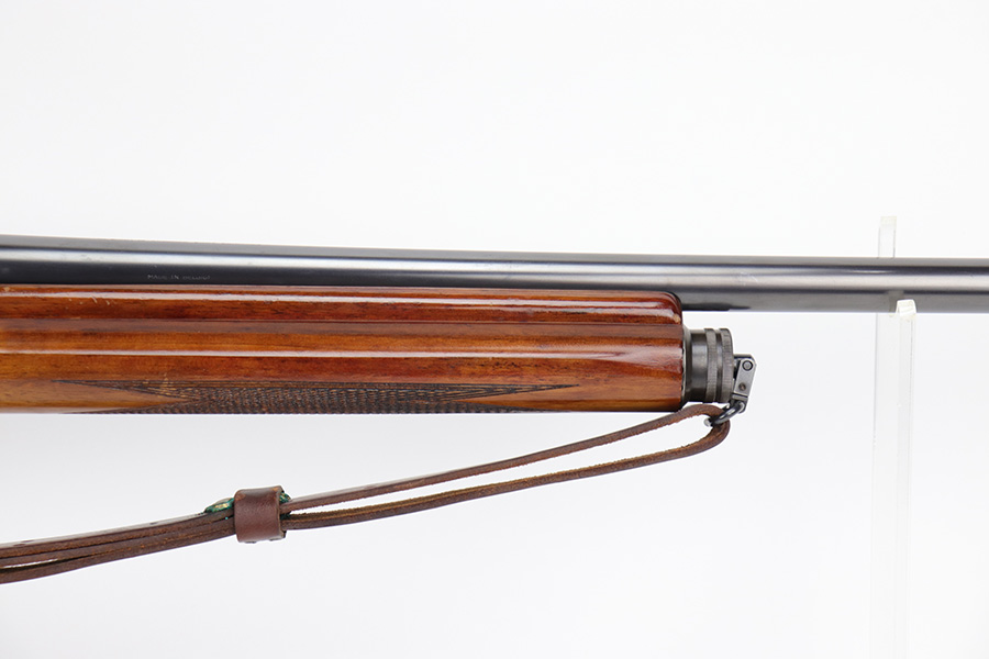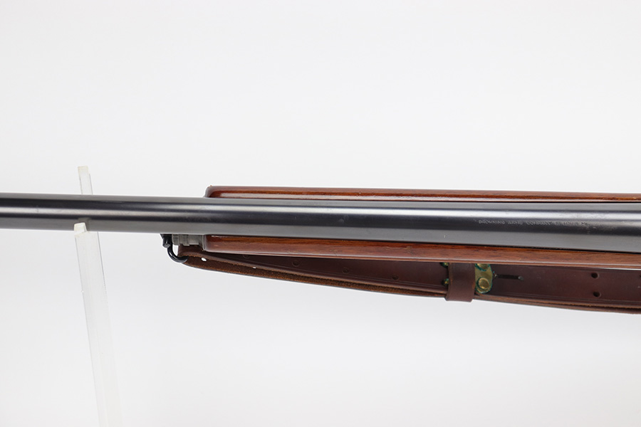 7/18/23 – This is an excellent example of a Browning A5 Light Twelve semi-auto shotgun, manufactured in Belgium in 1957 and chambered in 12 GA. All matching with the proper Belgian proofs throughout. It has retained about 97% of its rich bluing with just some small spots of wear on the top of the receiver and on the top of the barrel (around where it meets the receiver). Excellent wood furniture with just some minor scratches and handling marks here and there. Comes with a very nice rubber butt pad and leather sling. Near-mint bore.