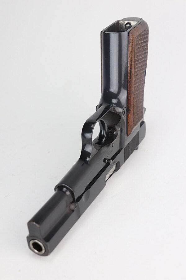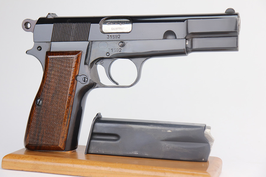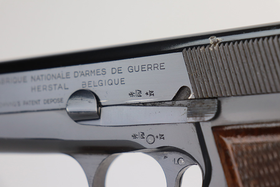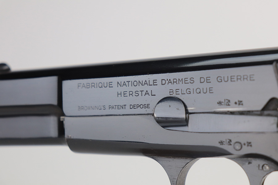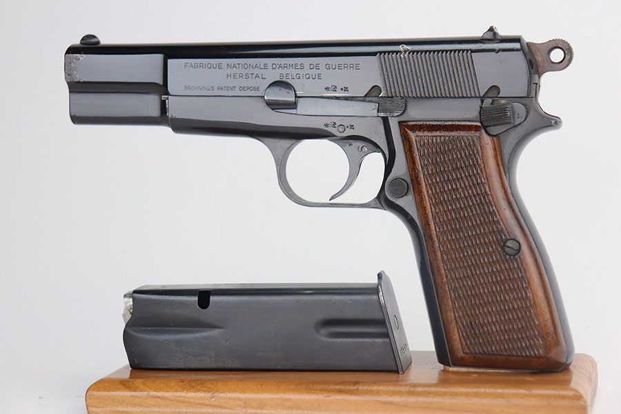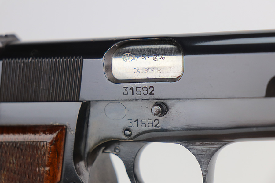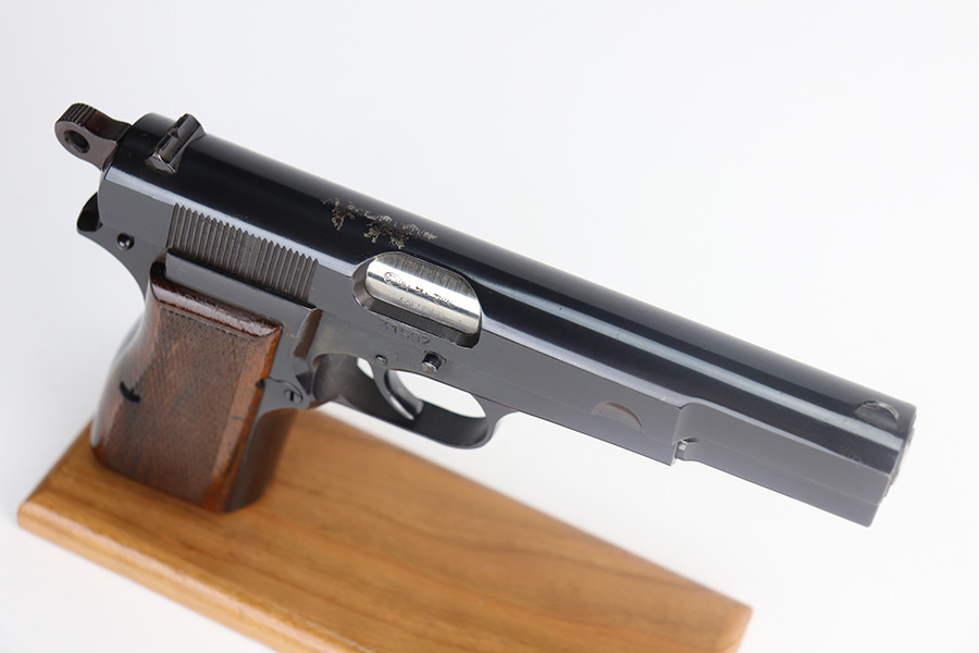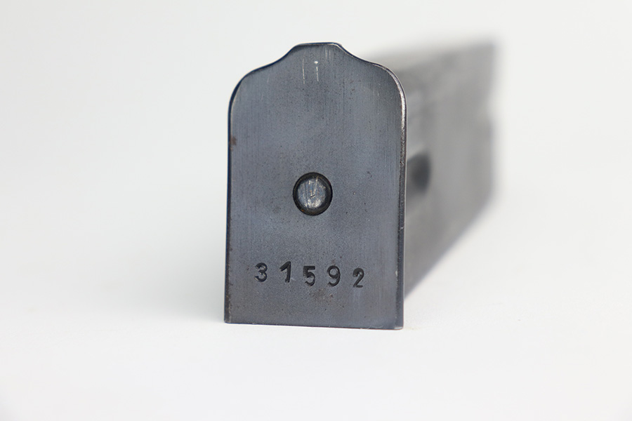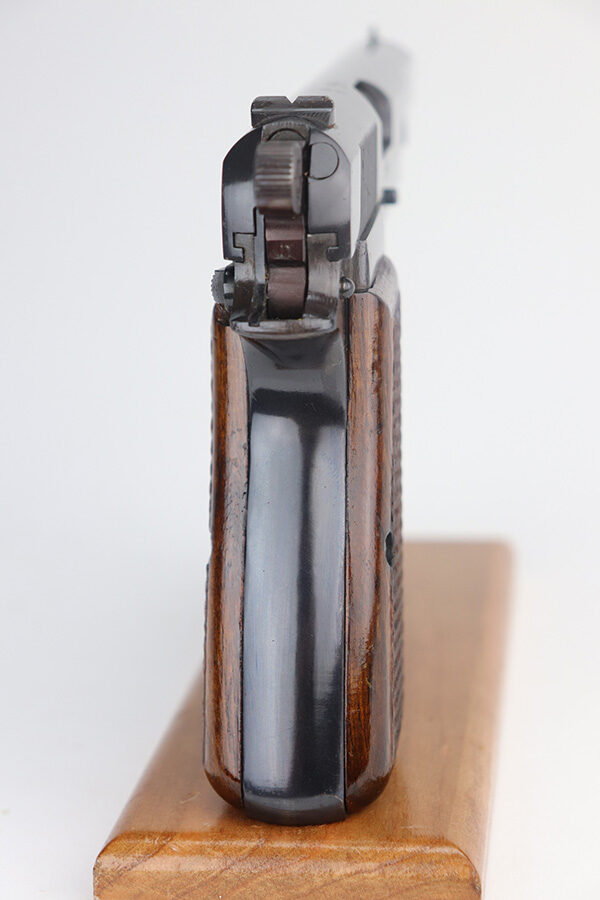 5/27/21 – This is an excellent example of an FN Browning Hi Power that was issued to the West German Police in the 1950’s. It comes with a matching police-numbered magazine. The gun has retained about 96-97% of its original high polish finish. There are small areas of splotchy discoloration and pitting on the top of the slide and around the muzzle. Excellent wood grips. Excellent bore – shiny with strong rifling.