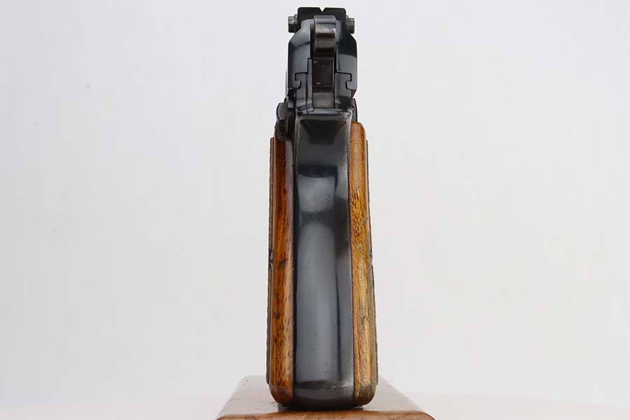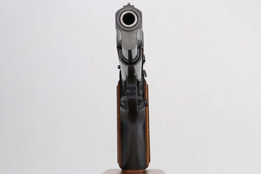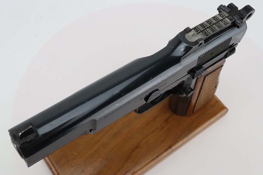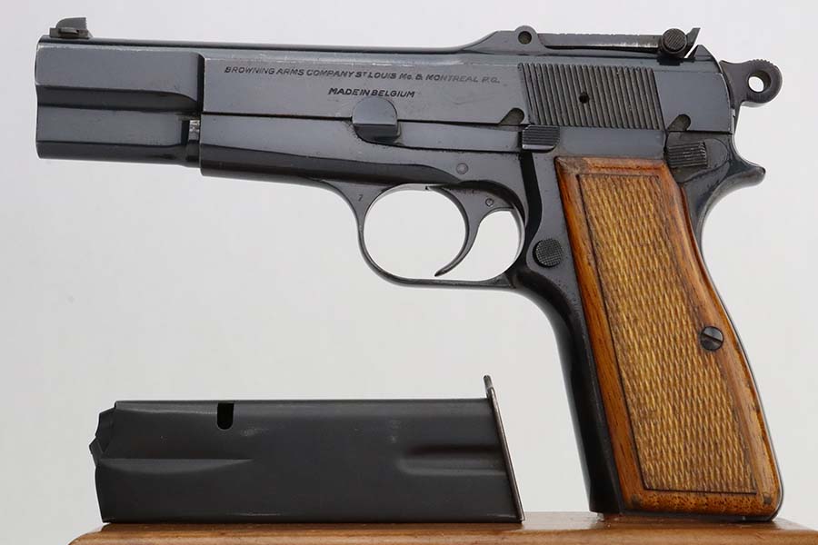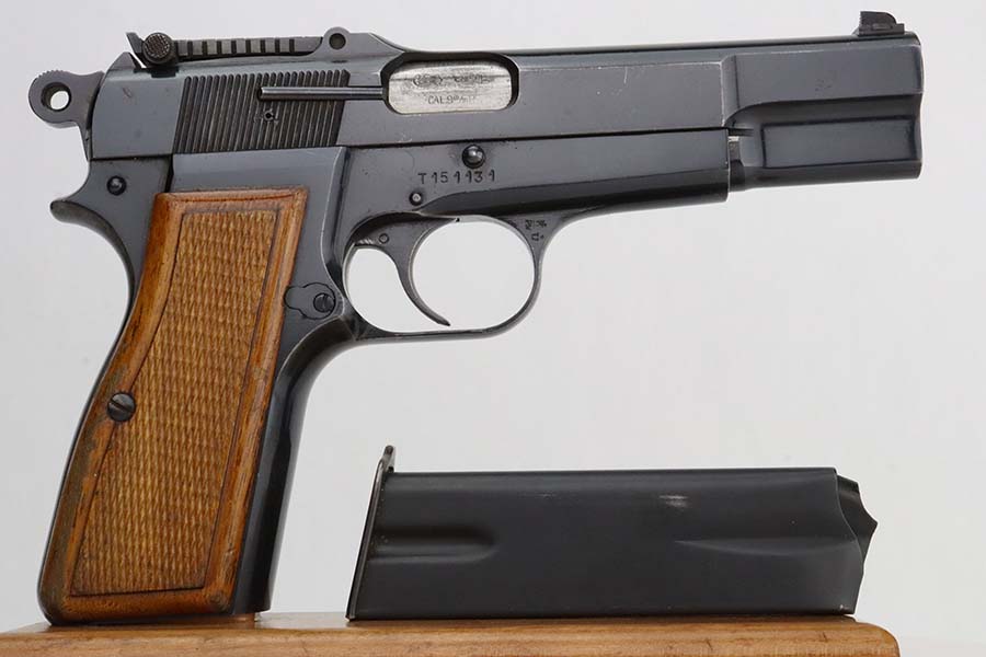 3/4/24 – This is an excellent Browning Hi Power with a T-Series serial manufactured in 1966. The “T Series” guns are regarded by collectors as being the last run of FN’s high polish guns with a quality factory fit and finish. This one has retained about 98% of its original finish with very minor high edge wear and some tiny scratches on both sides of the slide. Minty blonde wood grips. Comes with one proper magazine. Mint bore.