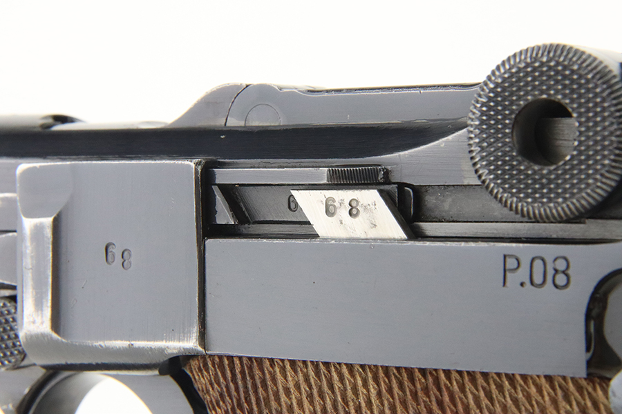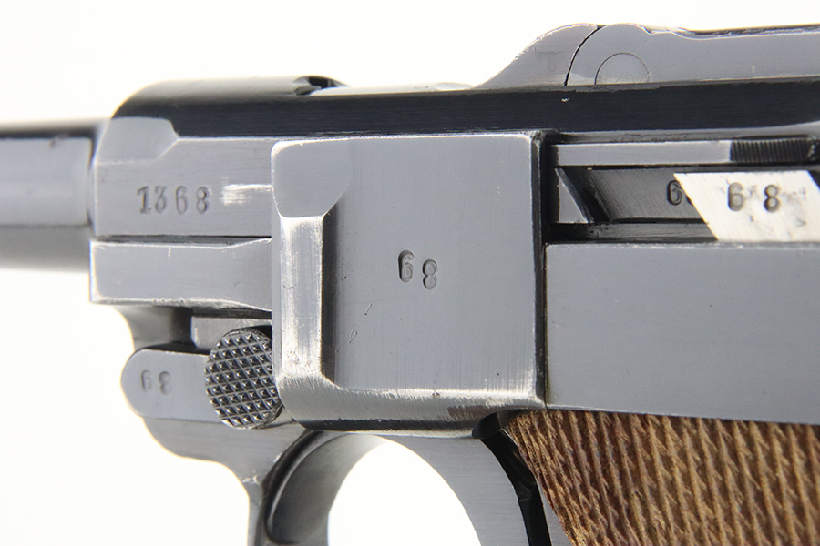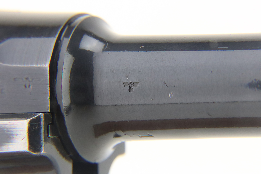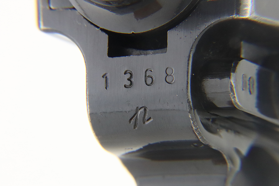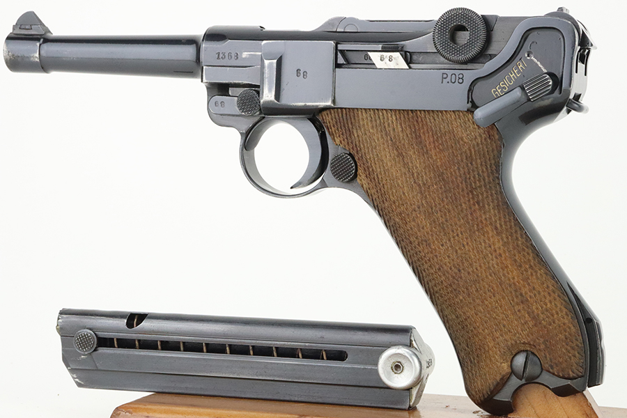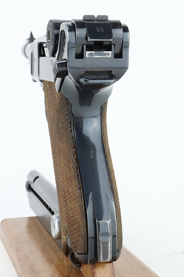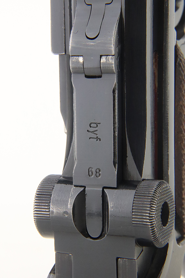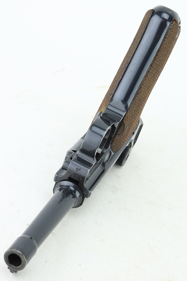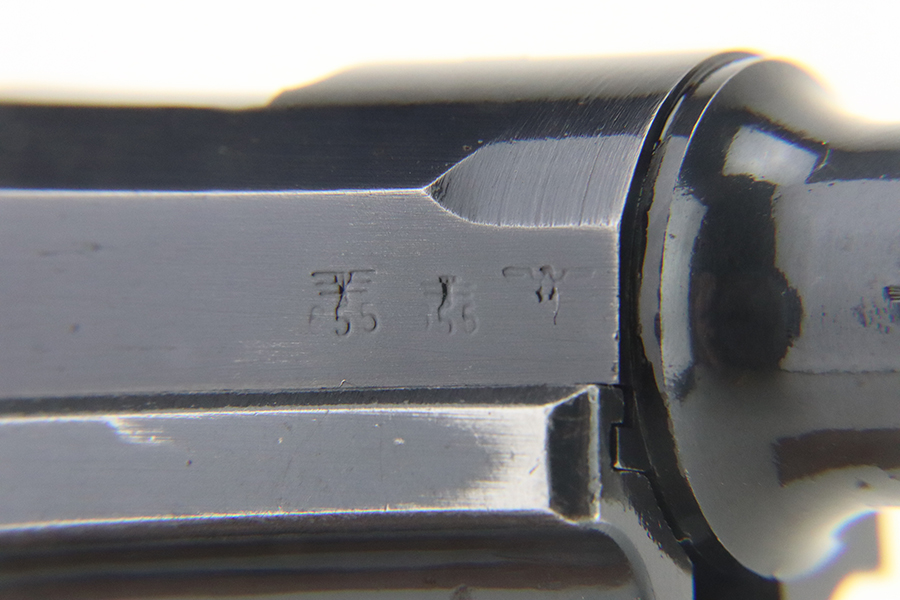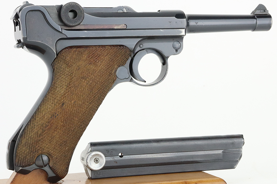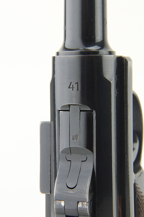5/17/24 – This is an excellent example of a BYF 41 Mauser Luger issued to the Nazi military in 1941. It is all matching with the proper “Eagle 655” military acceptance proofs. It comes with a matching-numbered magazine, but it has been force-matched. It also comes with the original copy of the capture document, listing this gun by serial number. The gun has retained about 97% of its original finish with minor high edge and muzzle wear. Fitted with excellent matching-numbered wood grips. The bore has good rifling, but there is pin-pricking throughout.