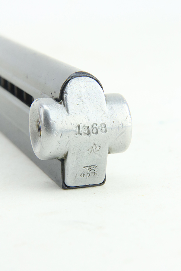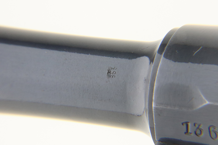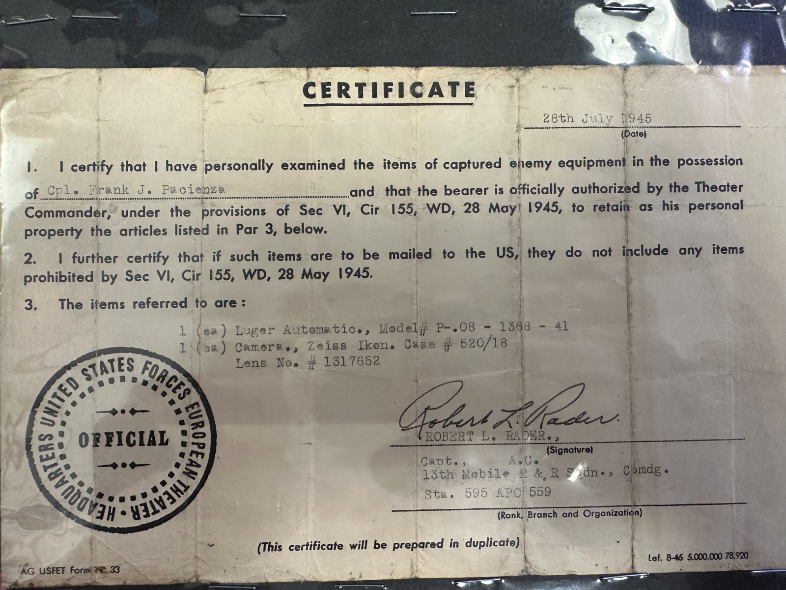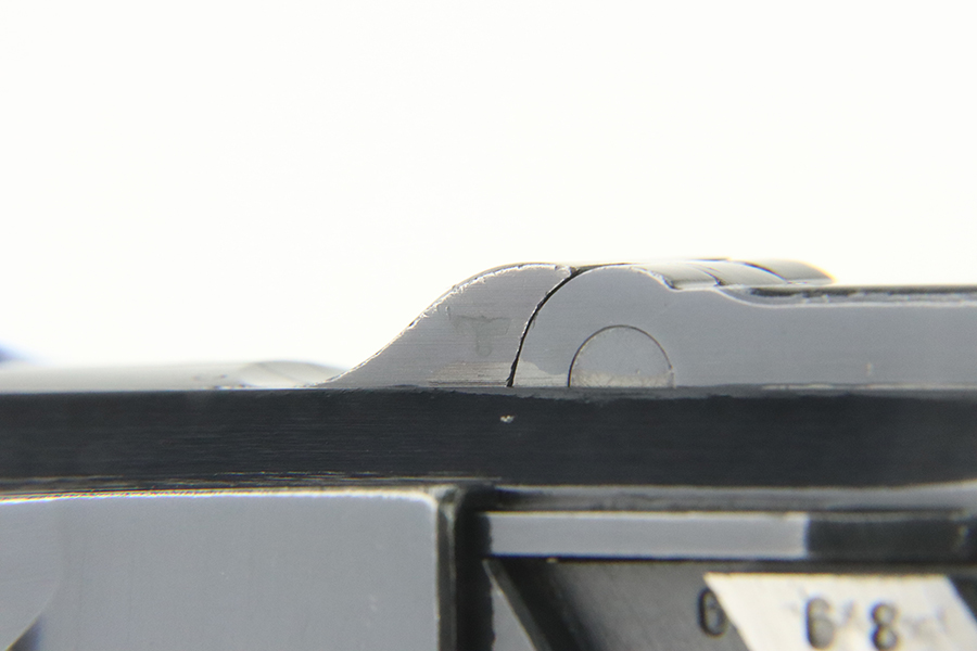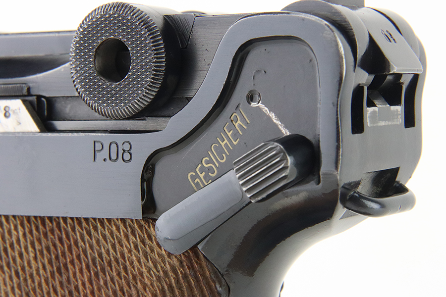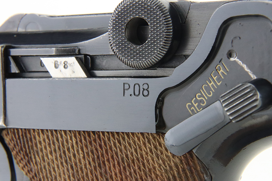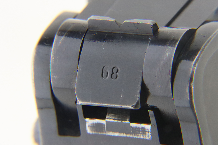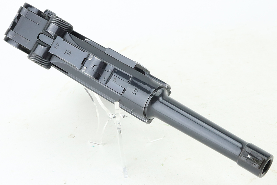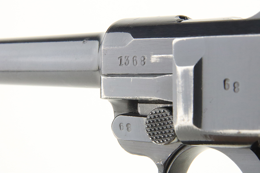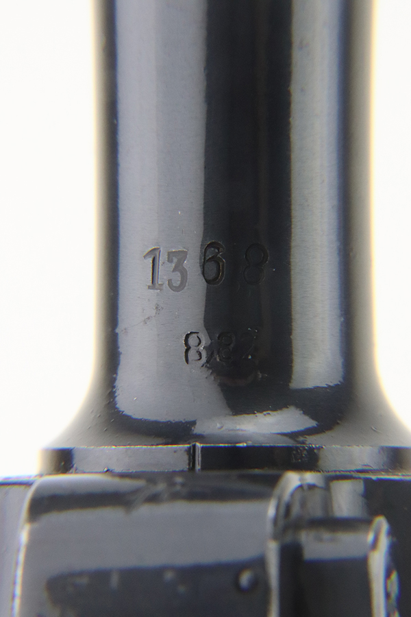 5/17/24 – This is an excellent example of a BYF 41 Mauser Luger issued to the Nazi military in 1941. It is all matching with the proper “Eagle 655” military acceptance proofs. It comes with a matching-numbered magazine, but it has been force-matched. It also comes with the original copy of the capture document, listing this gun by serial number. The gun has retained about 97% of its original finish with minor high edge and muzzle wear. Fitted with excellent matching-numbered wood grips. The bore has good rifling, but there is pin-pricking throughout.
