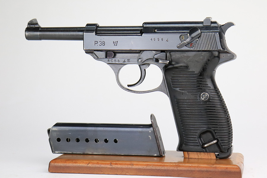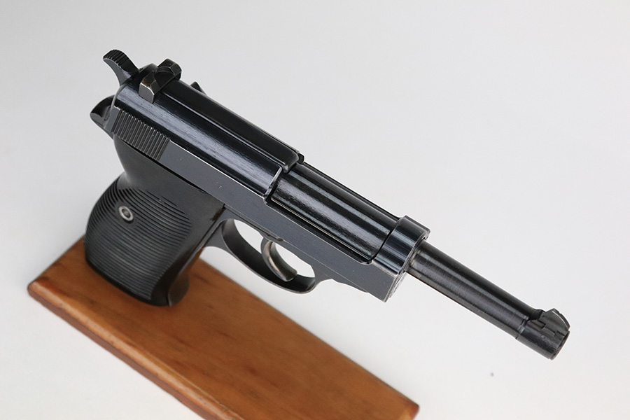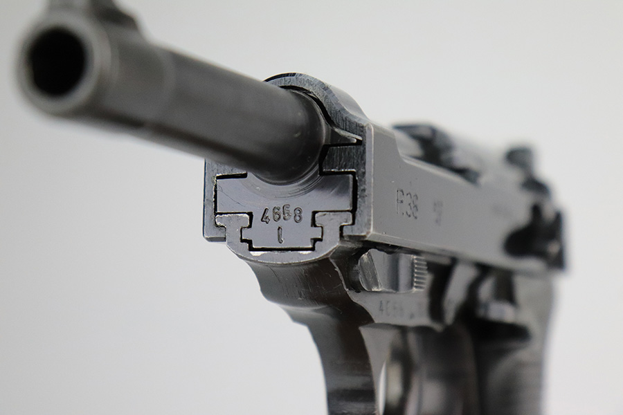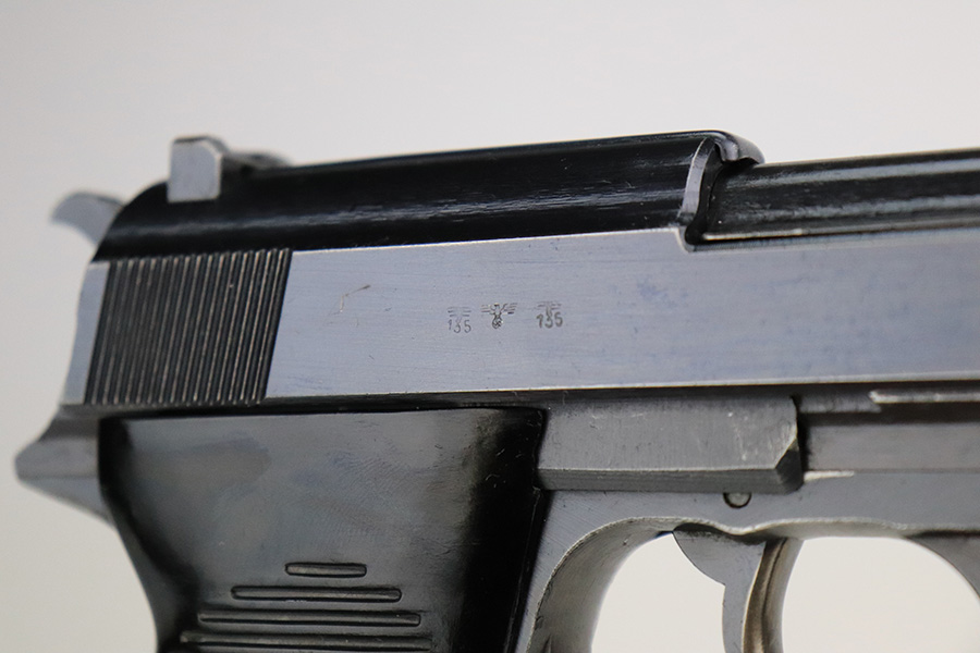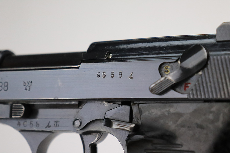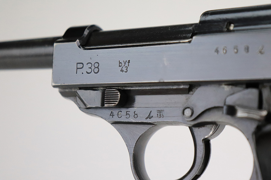 7/7/22 – This is an excellent example of a BYF 43 Mauser P.38 issued to the Nazi military in 1943. It is all matching and has the proper “Eagle 135” military proofs throughout. It has retained about 97% of its original finish. There is very minor wear around some of the high edges, a few light handling marks along the slide, and some very minor thinning on the front strap. Comes with excellent bakelite grips and an “Eagle 135” marked magazine. The bore has strong rifling, but there is light freckling throughout. De-cocker is functional.