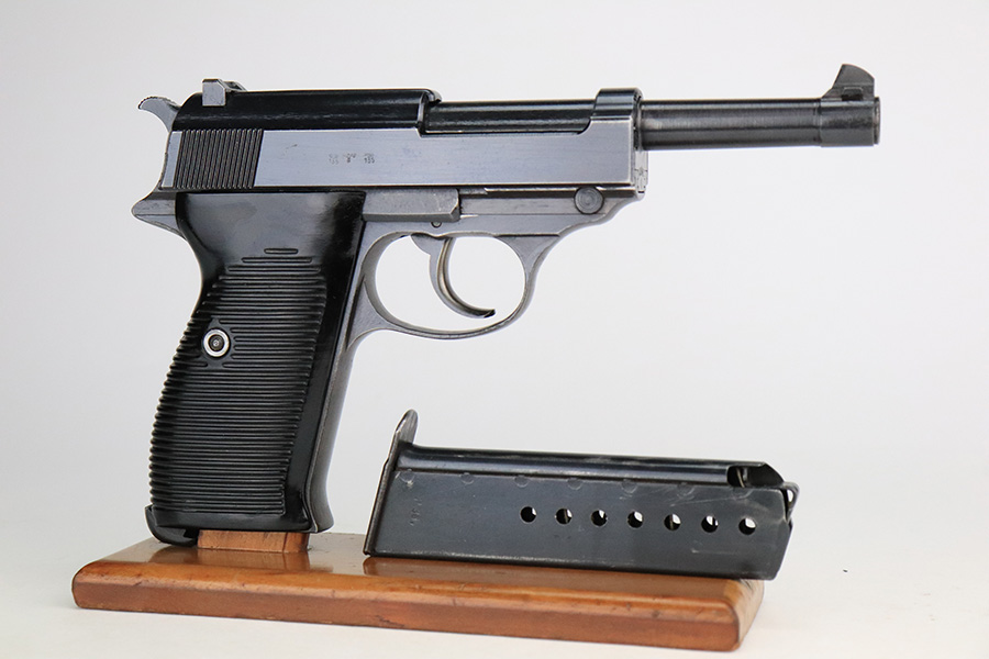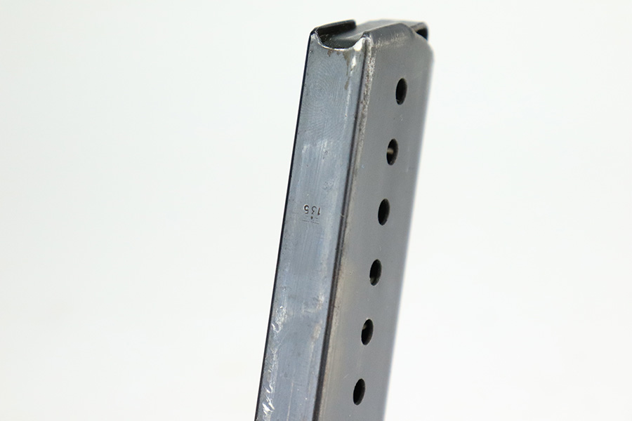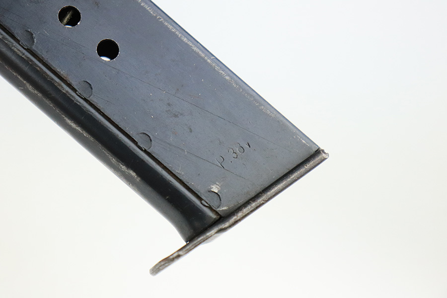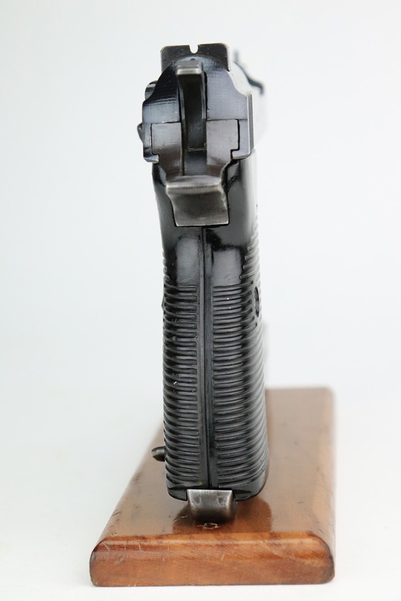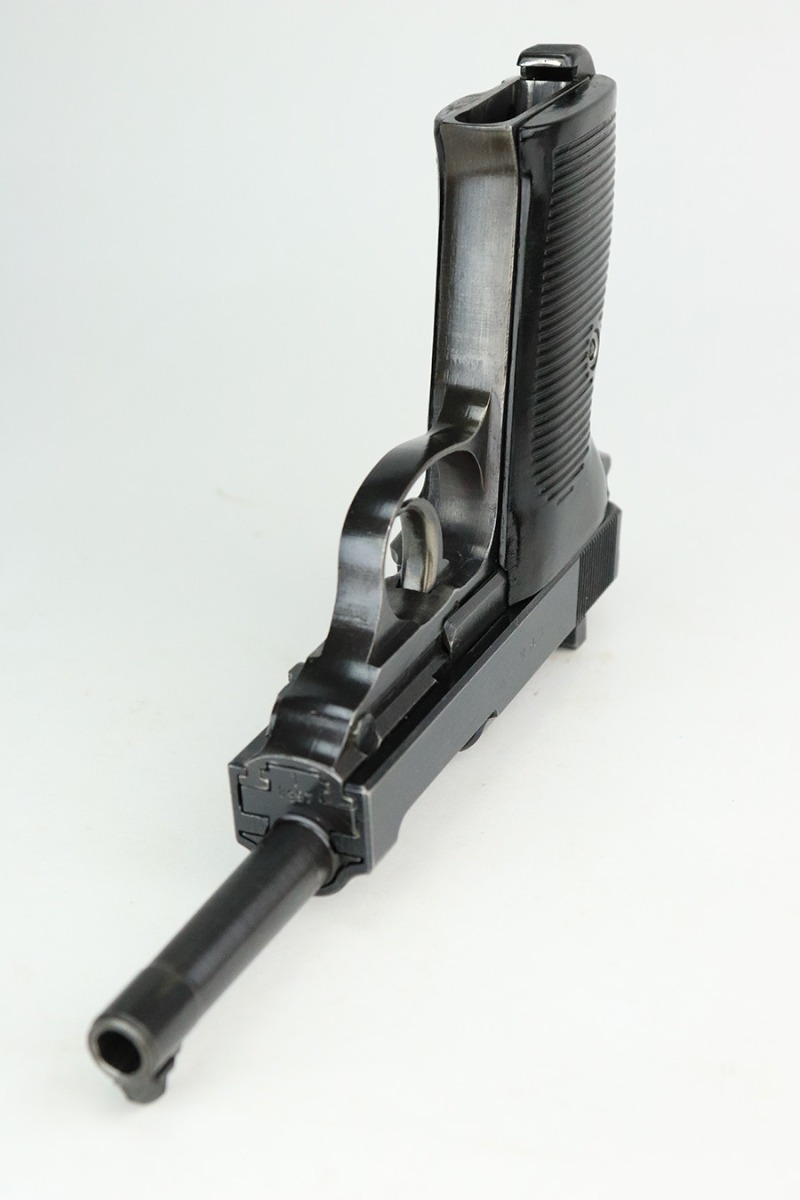7/7/22 – This is an excellent example of a BYF 43 Mauser P.38 issued to the Nazi military in 1943. It is all matching and has the proper “Eagle 135” military proofs throughout. It has retained about 97% of its original finish. There is very minor wear around some of the high edges, a few light handling marks along the slide, and some very minor thinning on the front strap. Comes with excellent bakelite grips and an “Eagle 135” marked magazine. The bore has strong rifling, but there is light freckling throughout. De-cocker is functional.