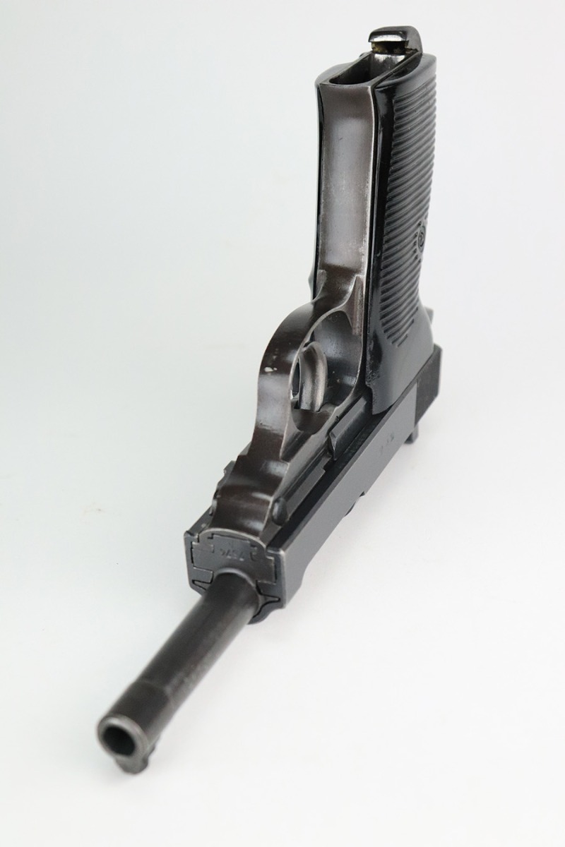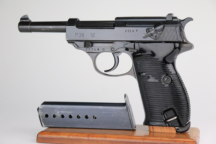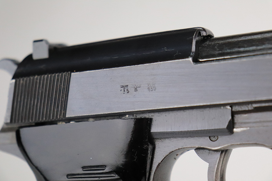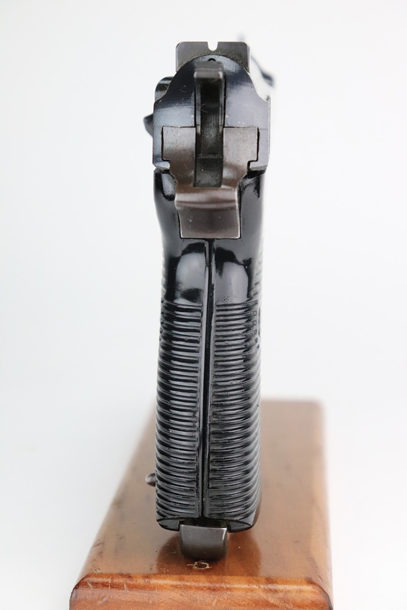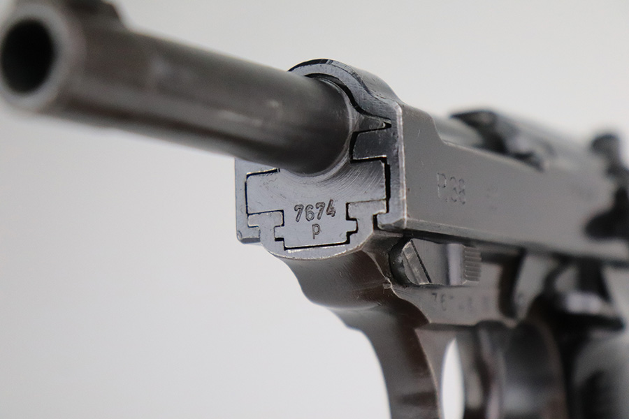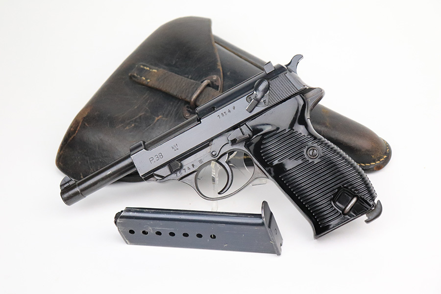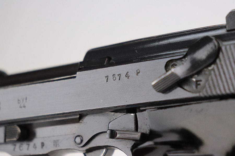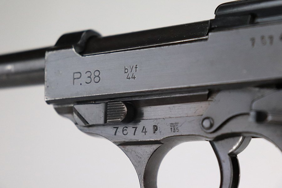7/12/22 – This is an excellent example of a BYF 44 Mauser P.38 issued to the Nazi military in 1944. It is all matching and has the proper “Eagle 135” military acceptance proofs throughout. It comes as a rig with waffen-proofed hard shell holster and a jvd magazine. There is no visible date on the holster, and the bottom stitching on the left belt loop is missing. The gun itself has retained about 95% of its original finish. Most of the wear is on the front strap. There are hints of wear around the high edges of the slide, some minor pin-pricking around the muzzle, and some tiny dots of discoloration along the barrel. There is a number lightly scratched into the underside of the trigger guard. Comes with nice period-correct black plastic grips that have been cut down at the top. The bore has good rifling, but there are tiny pits throughout. De-cocker is functional.