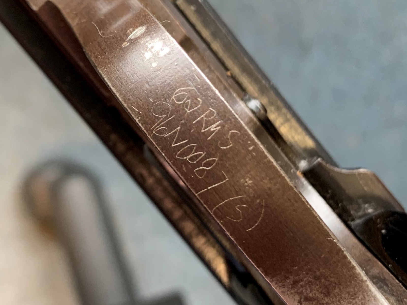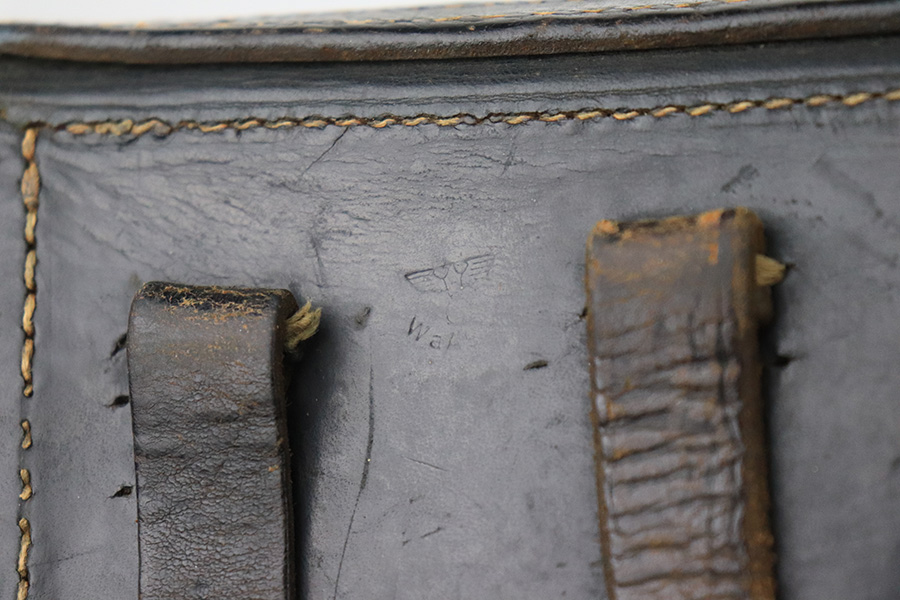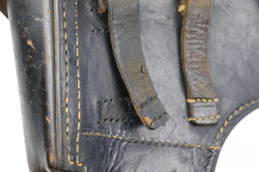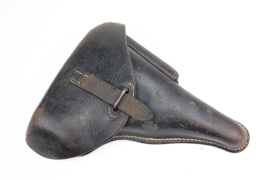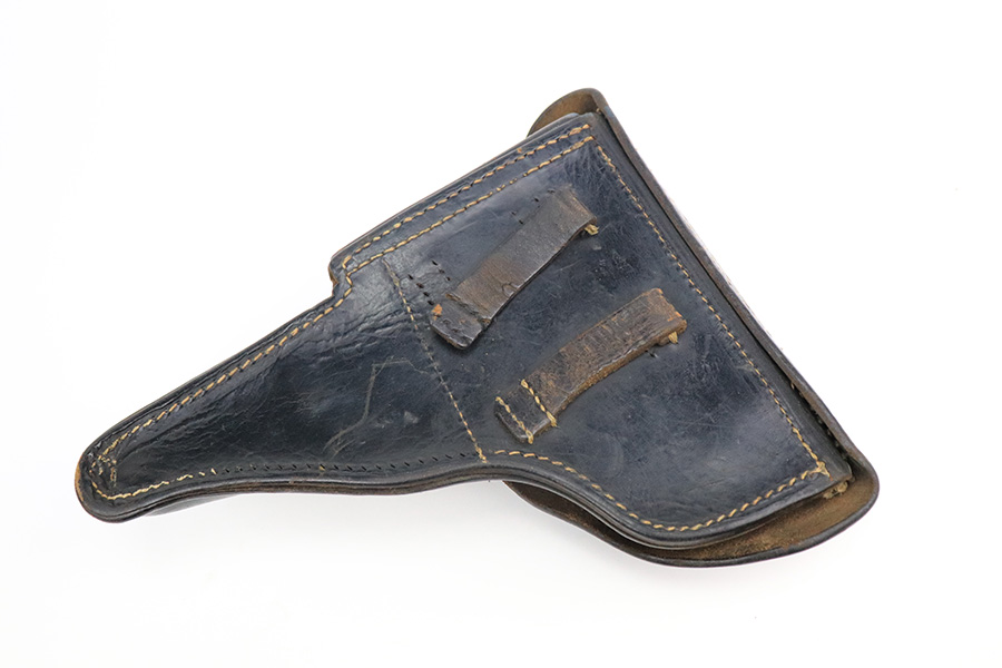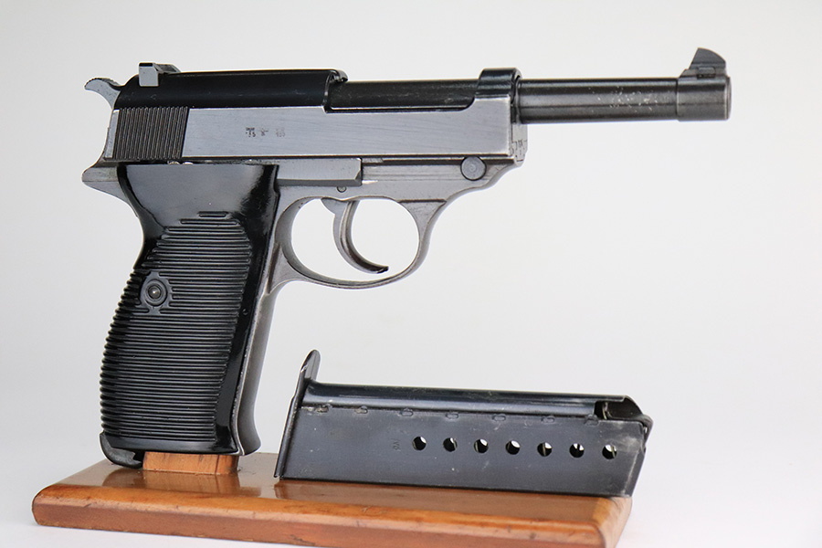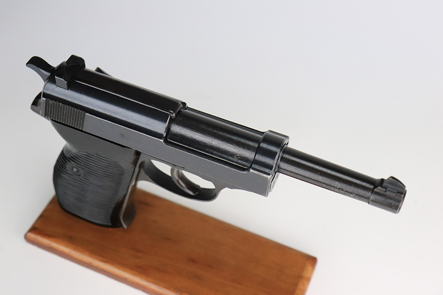 7/12/22 – This is an excellent example of a BYF 44 Mauser P.38 issued to the Nazi military in 1944. It is all matching and has the proper “Eagle 135” military acceptance proofs throughout. It comes as a rig with waffen-proofed hard shell holster and a jvd magazine. There is no visible date on the holster, and the bottom stitching on the left belt loop is missing. The gun itself has retained about 95% of its original finish. Most of the wear is on the front strap. There are hints of wear around the high edges of the slide, some minor pin-pricking around the muzzle, and some tiny dots of discoloration along the barrel. There is a number lightly scratched into the underside of the trigger guard. Comes with nice period-correct black plastic grips that have been cut down at the top. The bore has good rifling, but there are tiny pits throughout. De-cocker is functional.