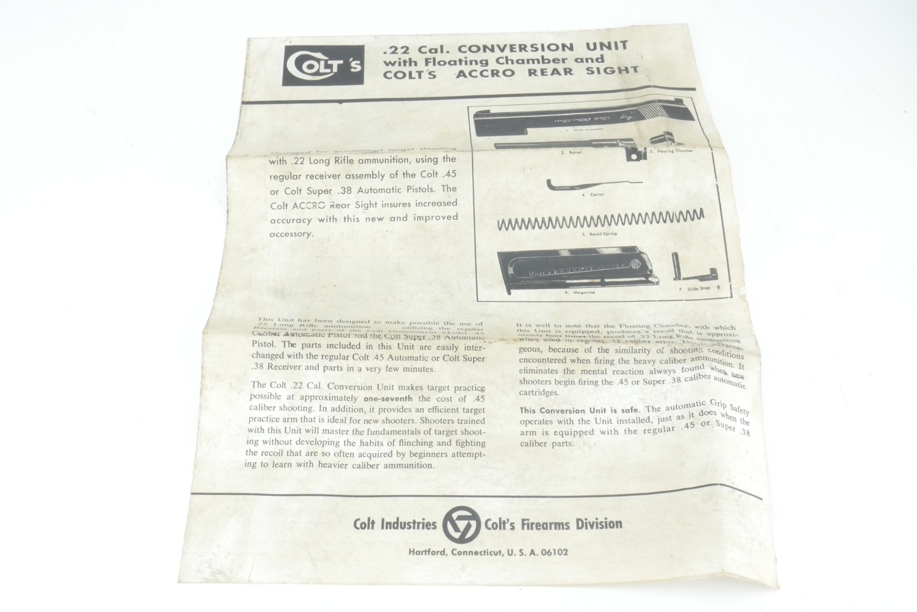 07/31/2024 – For sale is a Colt .22lr conversion kit made for 1911 handguns. The slide has a very nice polished blued finish and is marked with the Colt logo on the side. The barrel is bore is very bright with great rifling. The kit comes with its original box, manual, a 22 caliber magazine, and a replacement spring.
