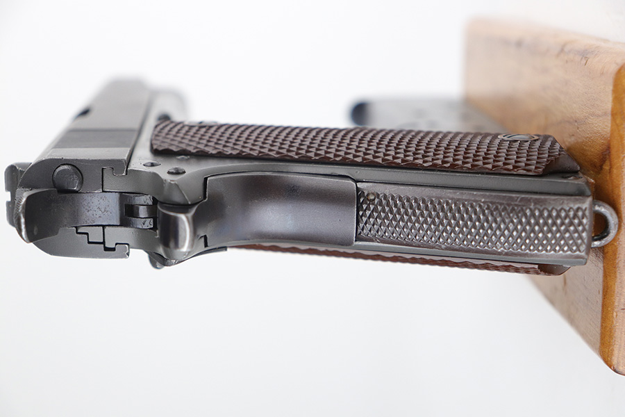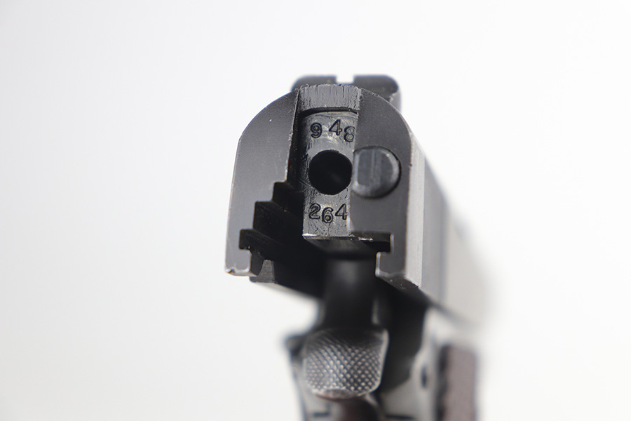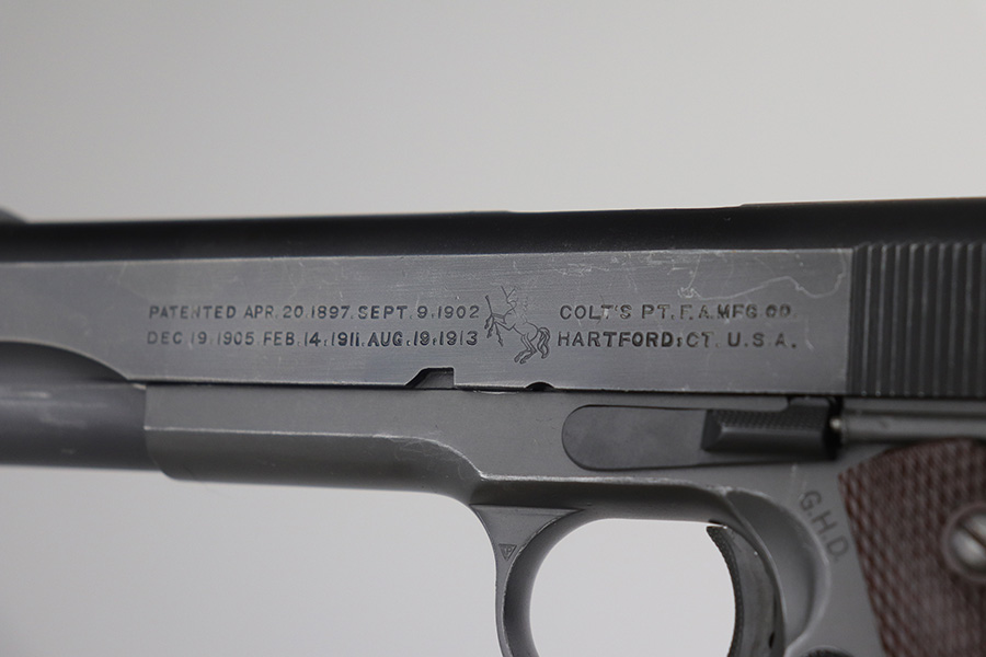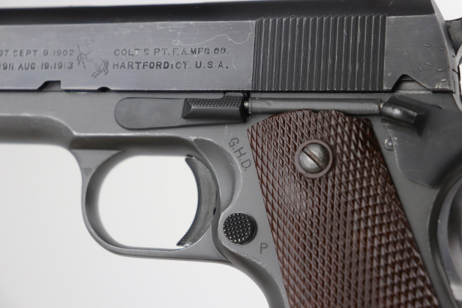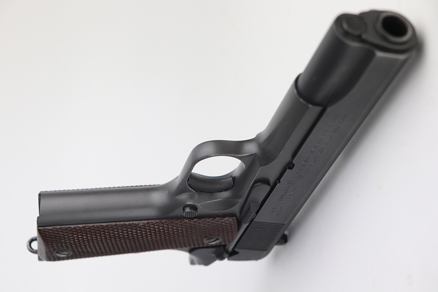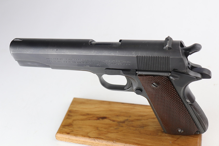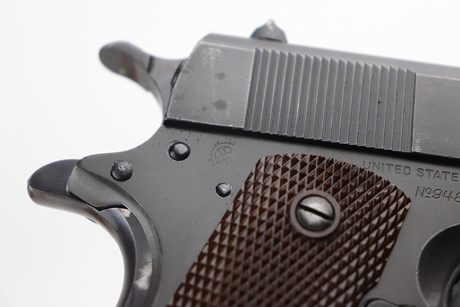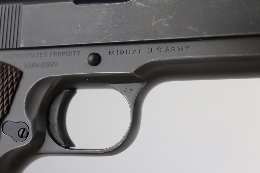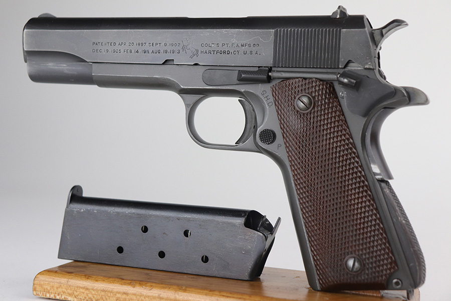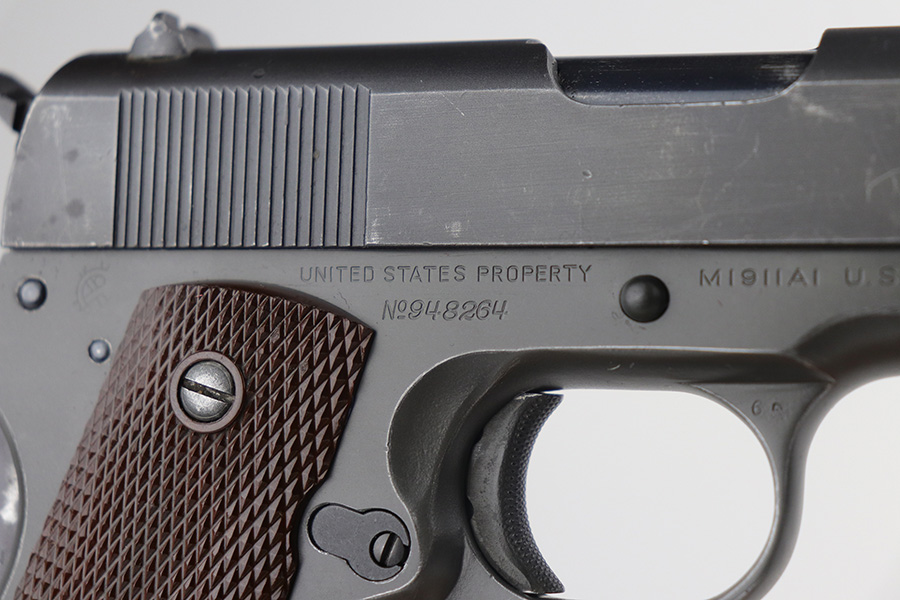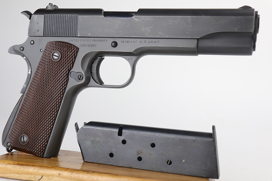 11/18/21 – This is an excellent Colt 1911A1 that was made in 1943 and issued to the U.S. Army. It has a matching numbered slide and proper Colt barrel with large G under the lug. Correct GHD inspector mark on frame, and ‘P’ proofs on slide and frame. Terrific, shiny bore. Sharply checkered grips with no defects. ‘L’ marked magazine.