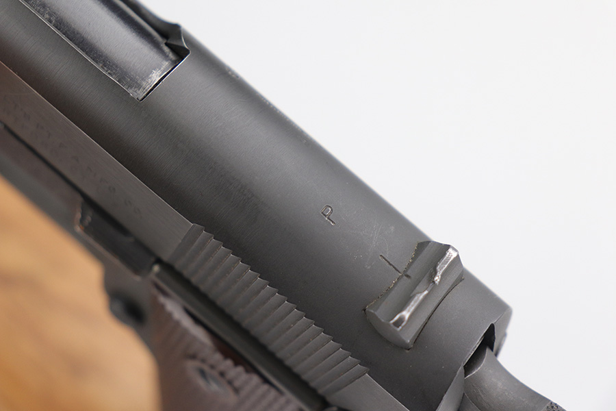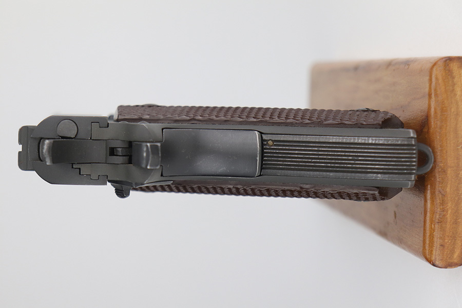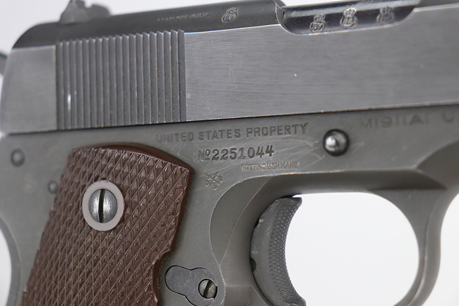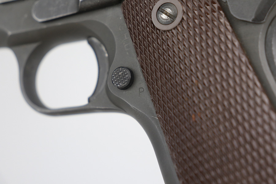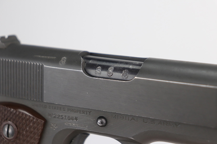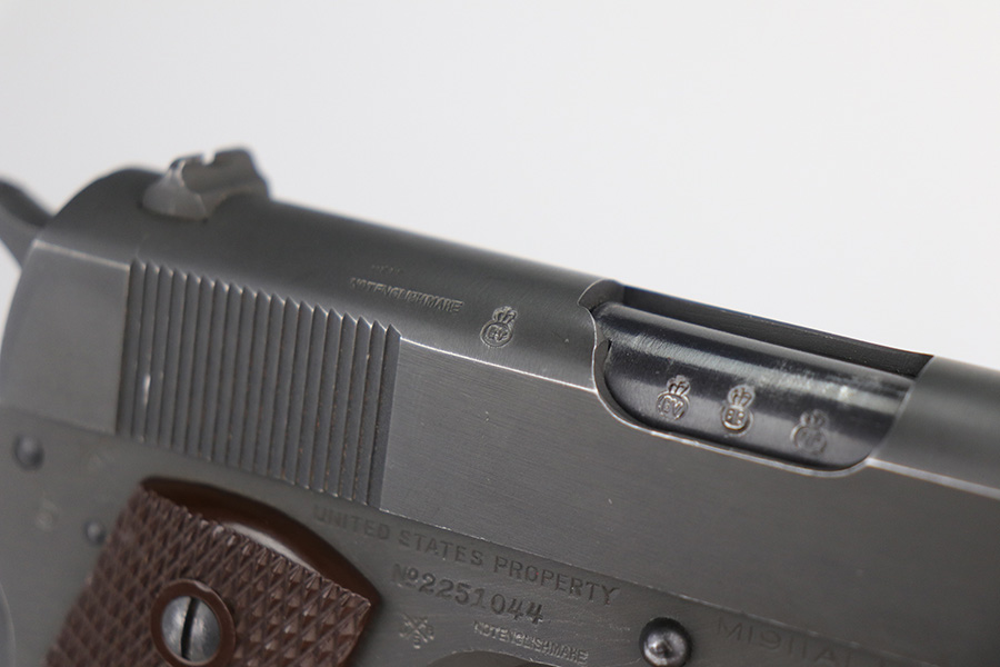 2/21/23 – This is an excellent example of a Colt Model 1911A1 manufactured in 1945. It is all-correct, has the proper “United States Property” marking, and the proper US military cross-canon cartouche. This one, however, has British proofs throughout, indicating it was part of the WW2 British Lend-Lease Program. Barrel is marked with a P on one side of the lug, and a square C on the other. It has retained about 97% of its parkerized finish with hints of wear on the high edges of the slide and around the muzzle. Comes with excellent grips and an unmarked magazine. Strong bore but there is a little frost in the grooves.