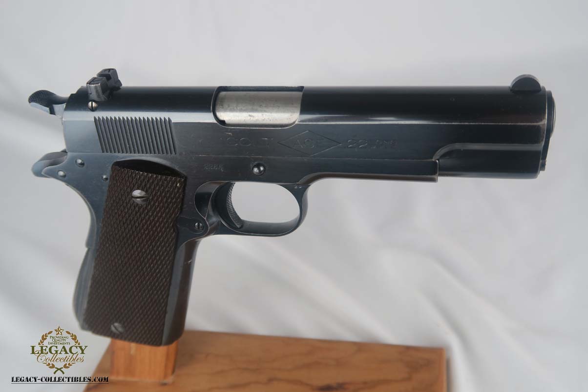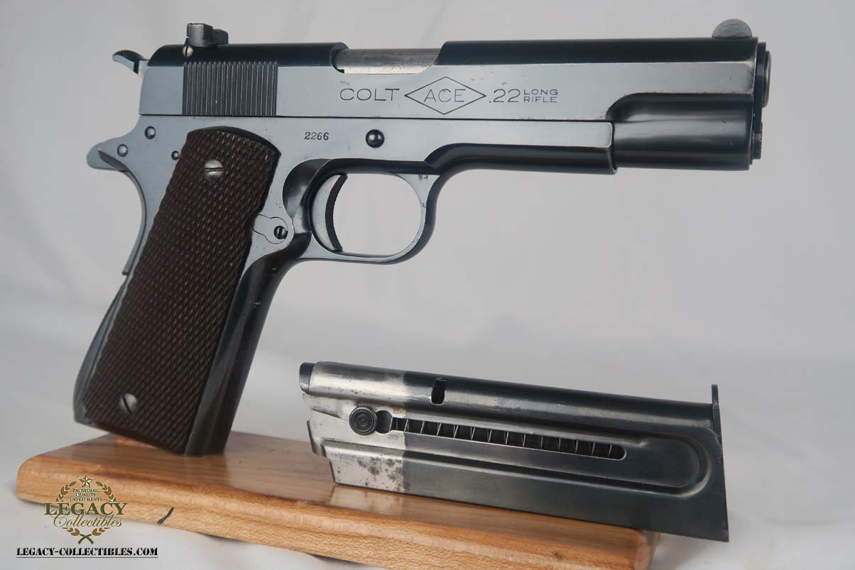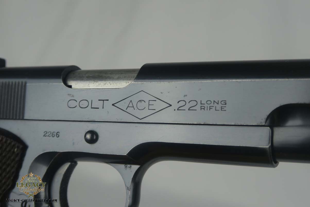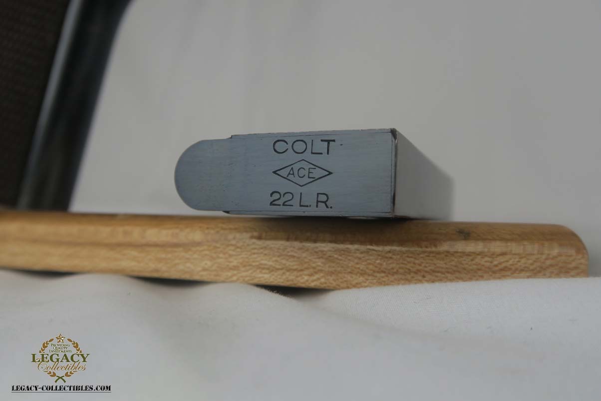 7/31/17 – This an excellent, early Colt model Ace. It is a first year production (1931), and in all original configuration. The bluing is excellent and rates at about 96-97%, with edge wear and some wear on the front strap. Excellent and proper magazine and grips. Mint bore. The Colt Ace or Colt Service Model Ace is a firearm that was designed to allow inexpensive and low-recoil practice while maintaining the feel of a military model 1911.