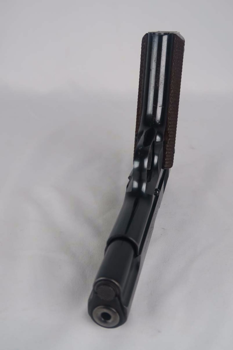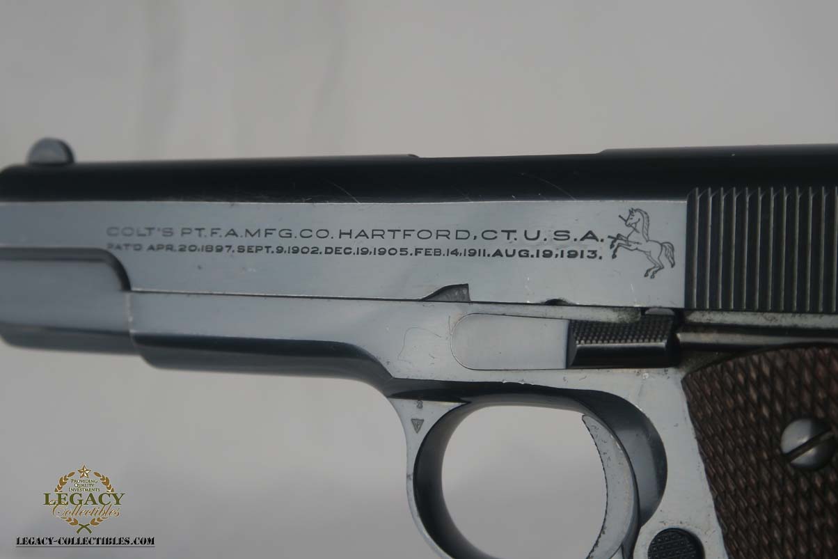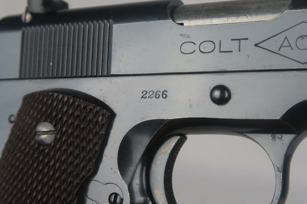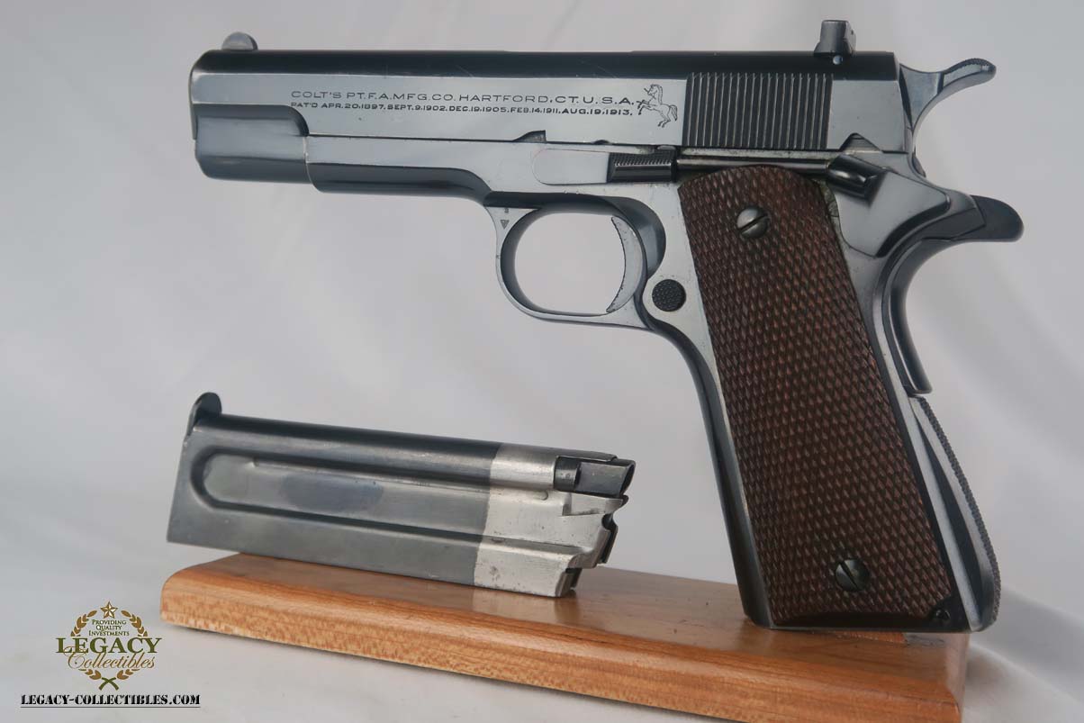 7/31/17 – This an excellent, early Colt model Ace. It is a first year production (1931), and in all original configuration. The bluing is excellent and rates at about 96-97%, with edge wear and some wear on the front strap. Excellent and proper magazine and grips. Mint bore. The Colt Ace or Colt Service Model Ace is a firearm that was designed to allow inexpensive and low-recoil practice while maintaining the feel of a military model 1911.
