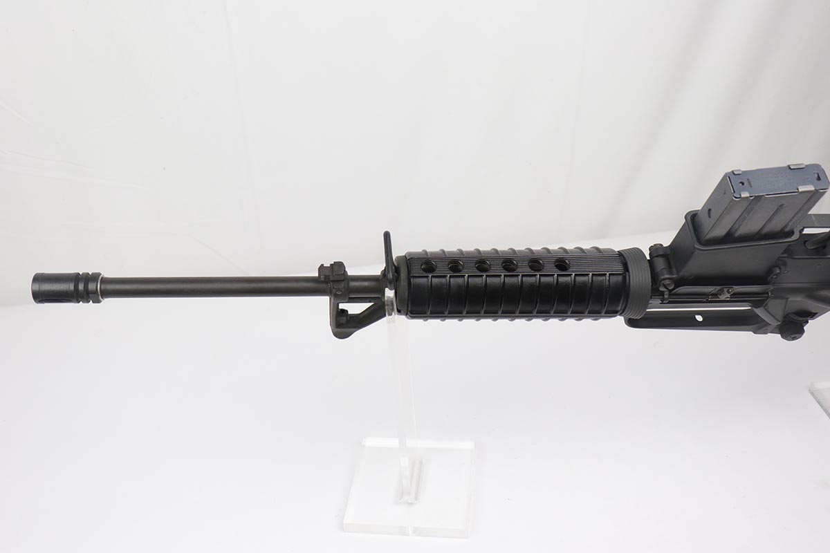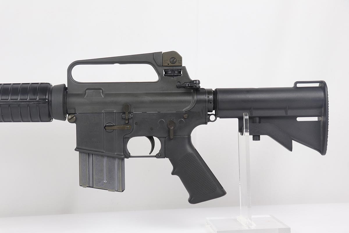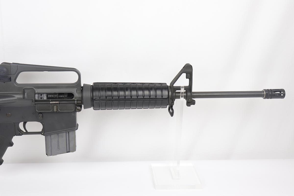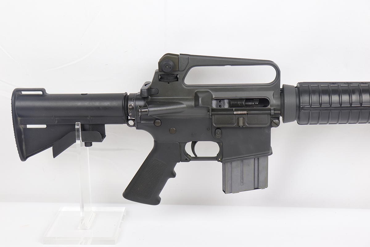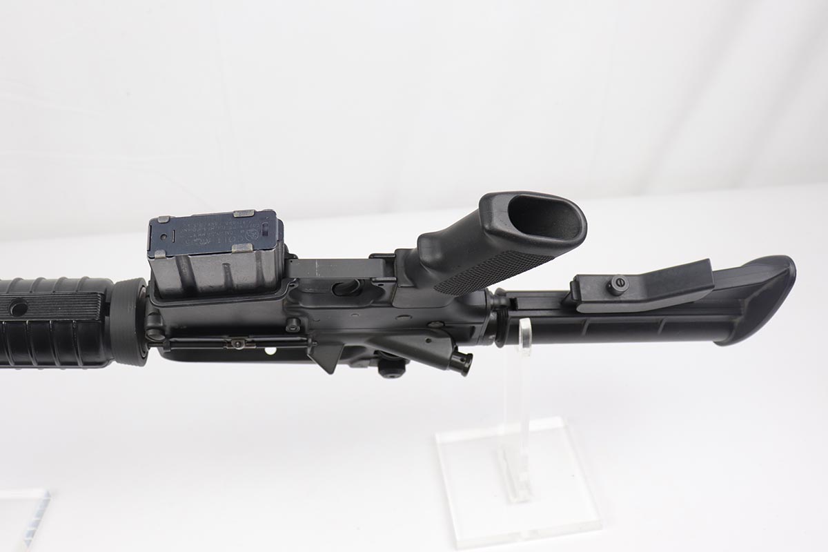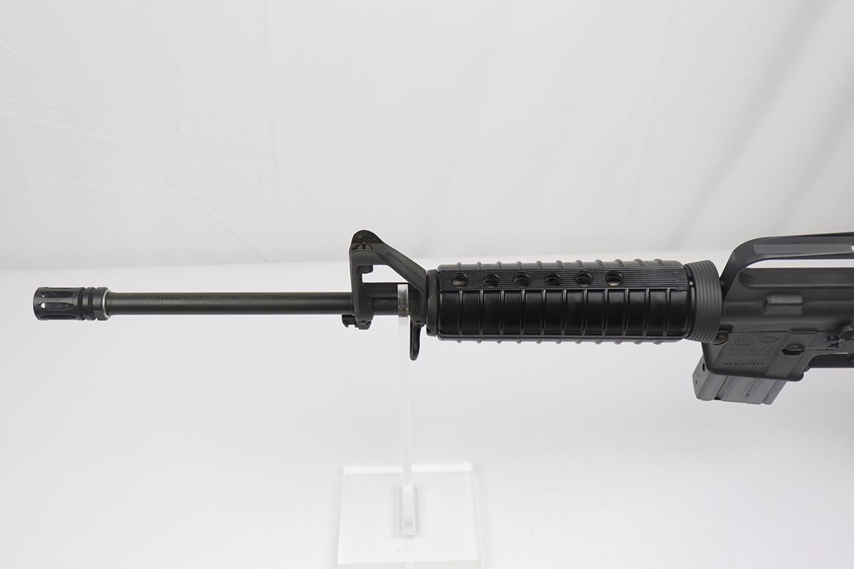 2/16/24 – This is an excellent example of a pre-ban AR15 “government carbine”, made in the 1980s. The gun has just a few spots of light “storage” wear from shifting inside the box. Only minor scuff marks on the receiver. It is a desirable shorter barrel length and also has an adjustable shoulder stock. With minty bore, sharp markings, great furniture, it is a scarce pre-ban “green label gun”.