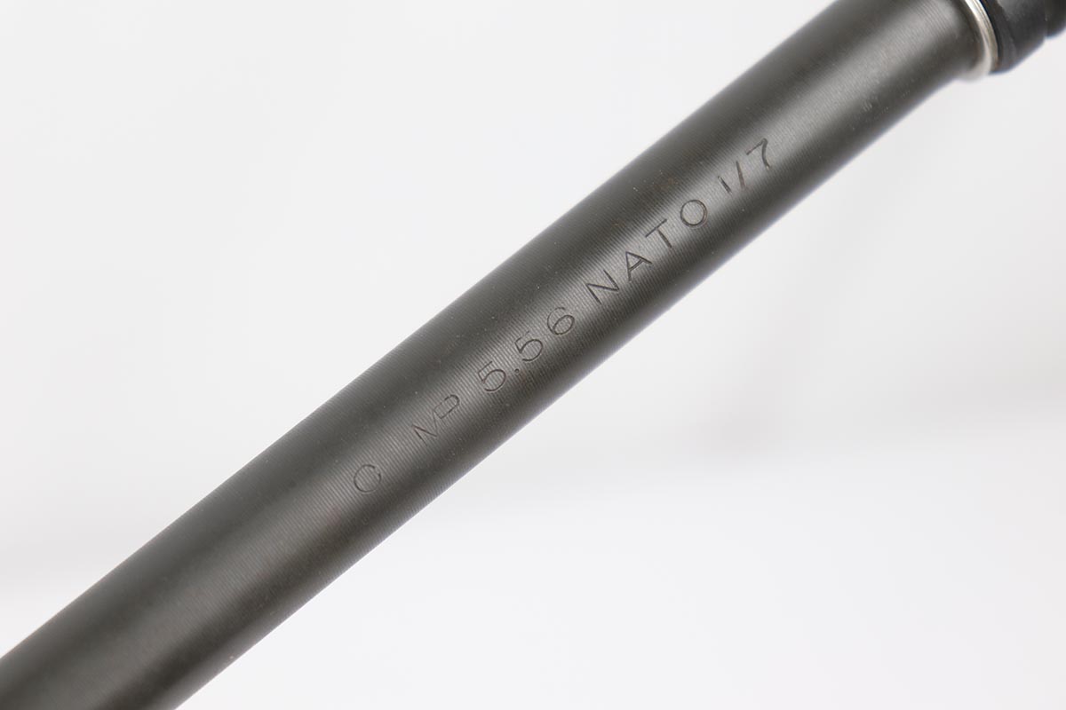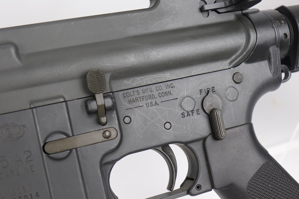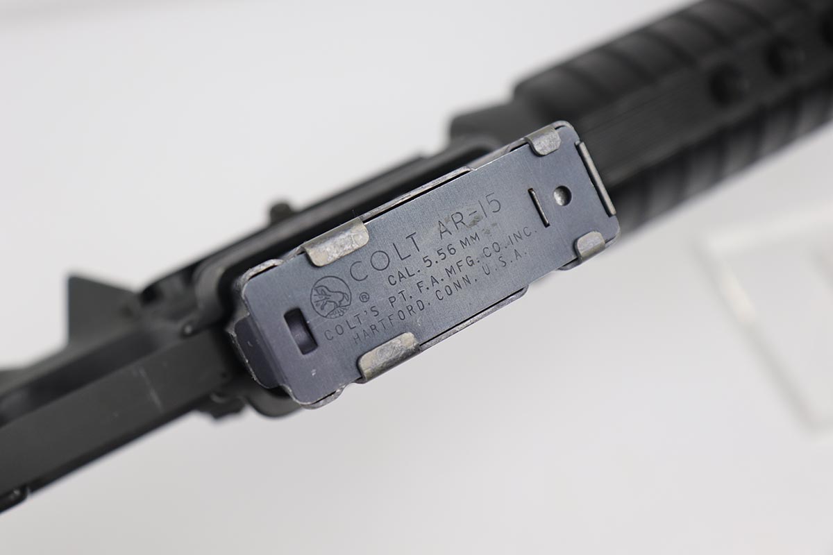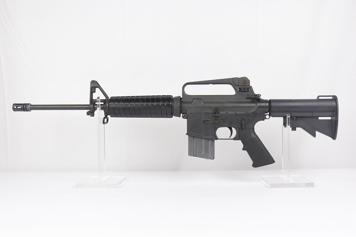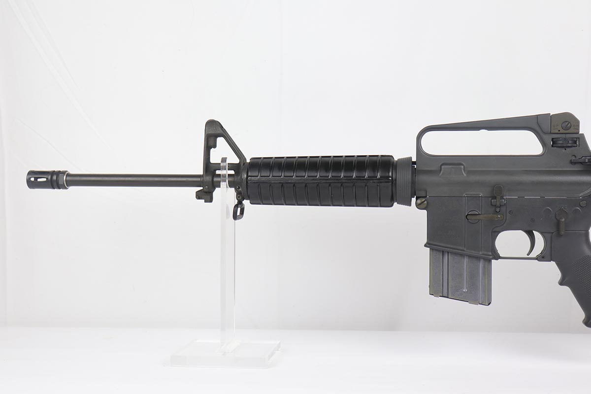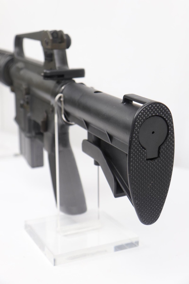 2/16/24 – This is an excellent example of a pre-ban AR15 “government carbine”, made in the 1980s. The gun has just a few spots of light “storage” wear from shifting inside the box. Only minor scuff marks on the receiver. It is a desirable shorter barrel length and also has an adjustable shoulder stock. With minty bore, sharp markings, great furniture, it is a scarce pre-ban “green label gun”.