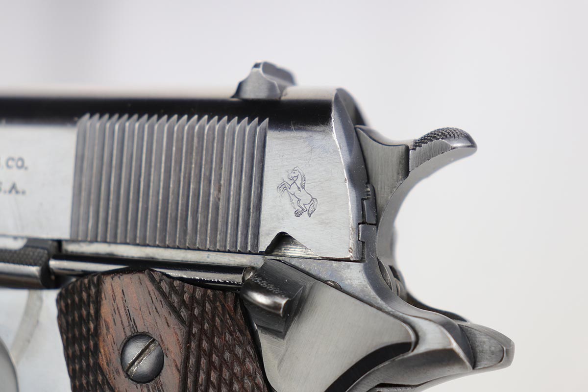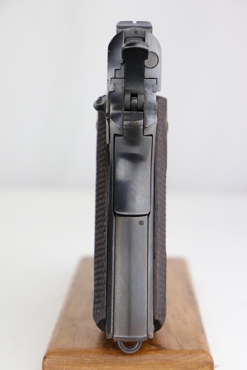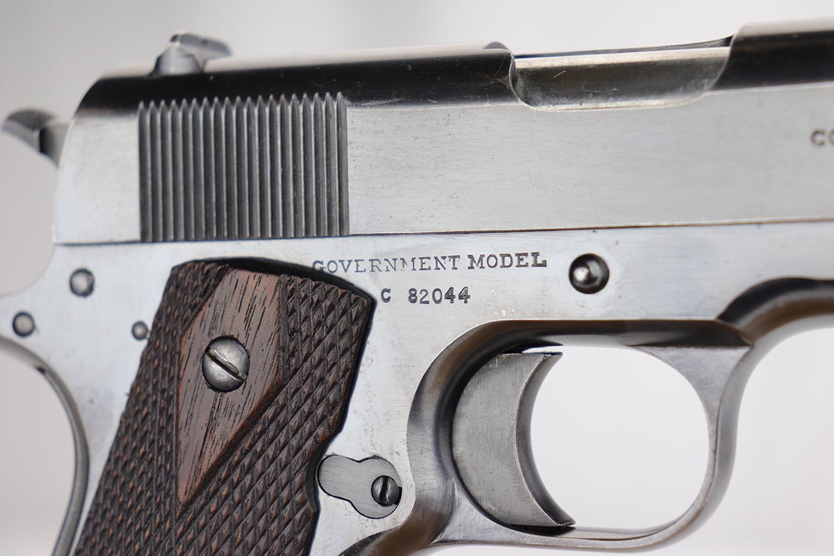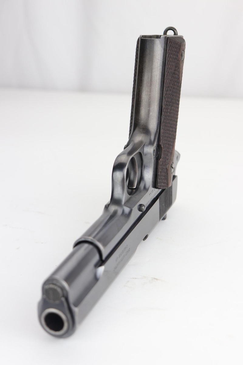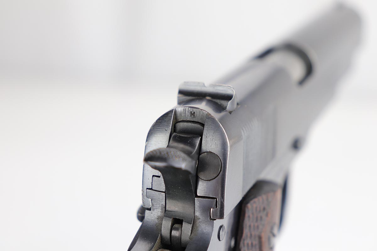 1/14/20 – This is an excellent example of an early and original Colt Government Model 1911, made in 1917. There’s minor rub wear on the muzzle and high edges of the slide, but most of the finish loss is on the front strap. There is also a pronounced “idiot” mark on the frame and slide from takedown. Excellent grips with only minor handling wear. Nice, two-tone magazine. ‘H’ marked slide. Excellent bore.