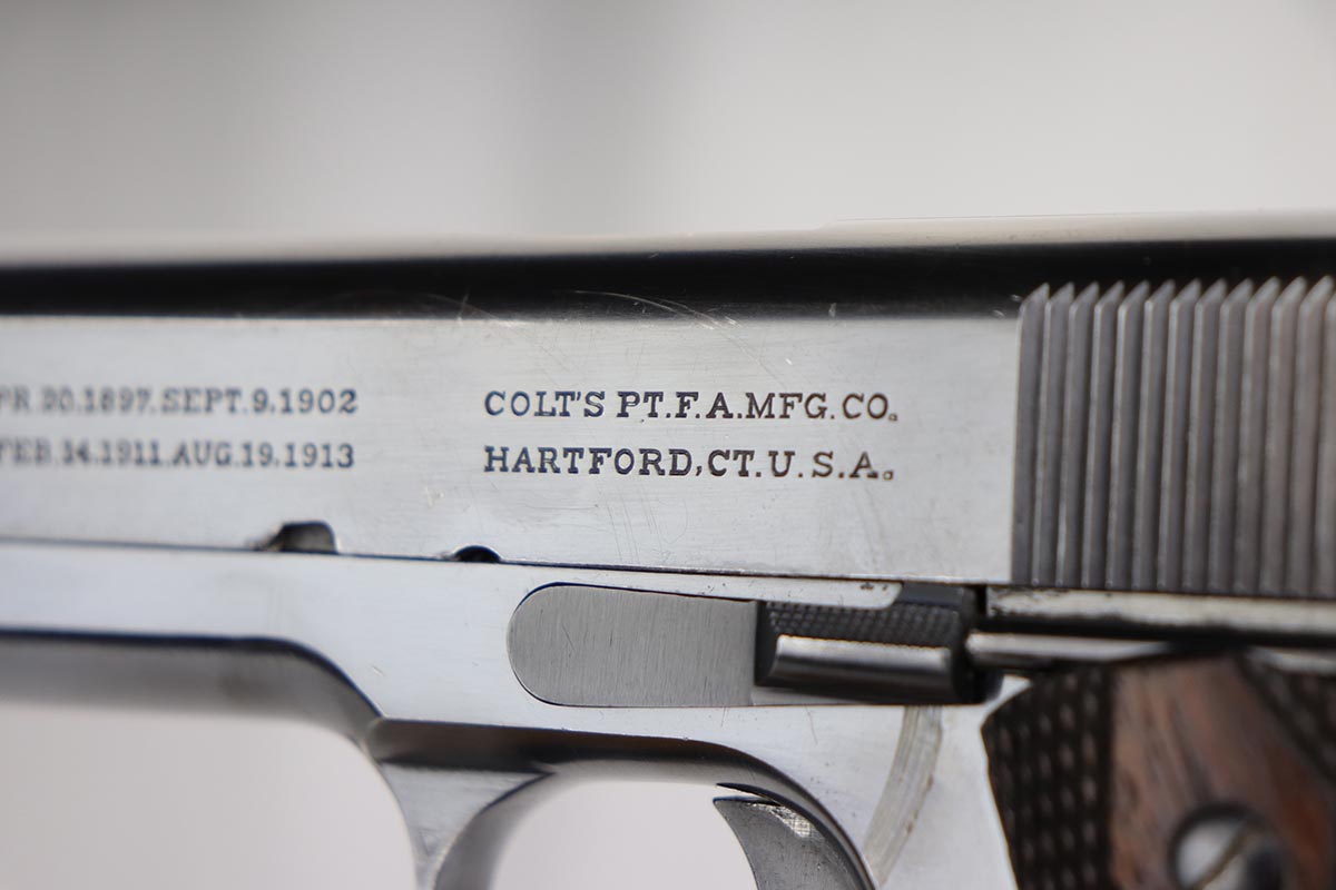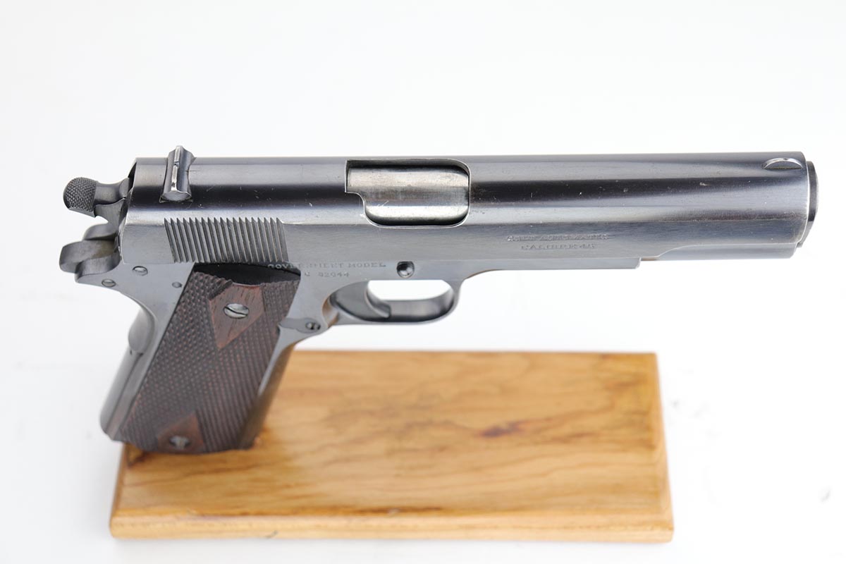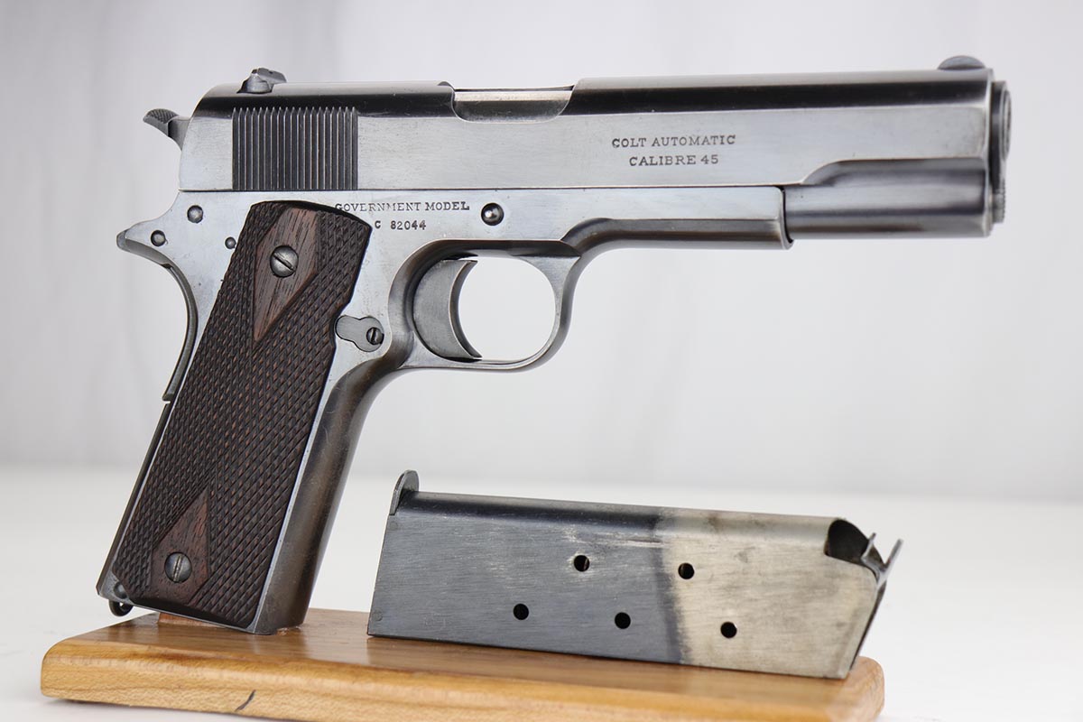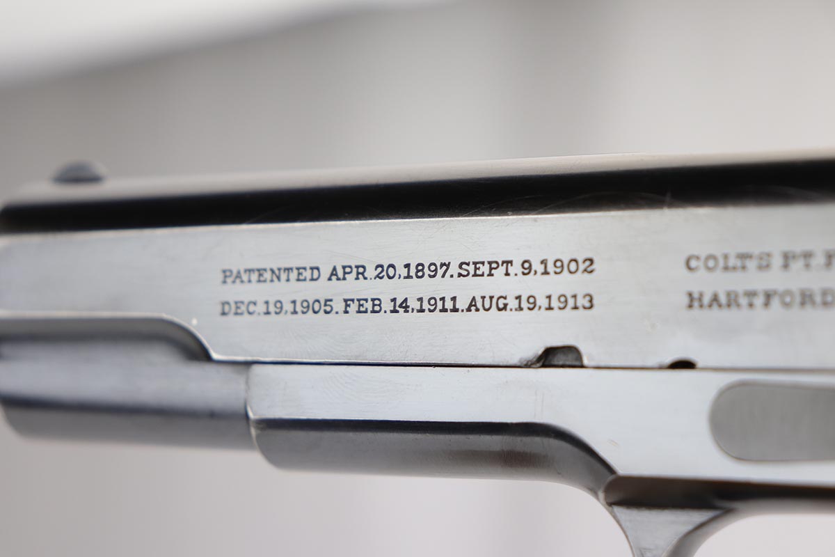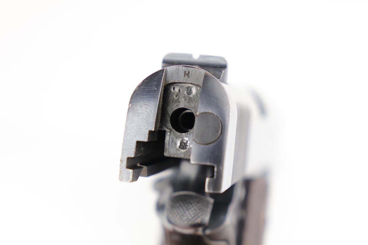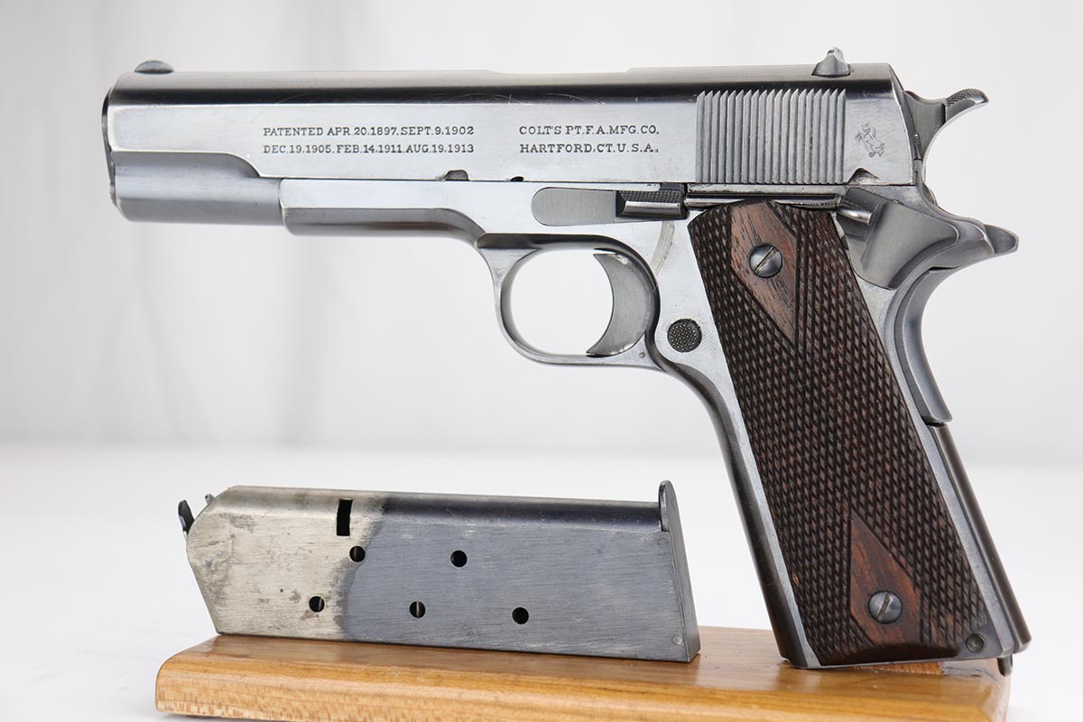 1/14/20 – This is an excellent example of an early and original Colt Government Model 1911, made in 1917. There’s minor rub wear on the muzzle and high edges of the slide, but most of the finish loss is on the front strap. There is also a pronounced “idiot” mark on the frame and slide from takedown. Excellent grips with only minor handling wear. Nice, two-tone magazine. ‘H’ marked slide. Excellent bore.