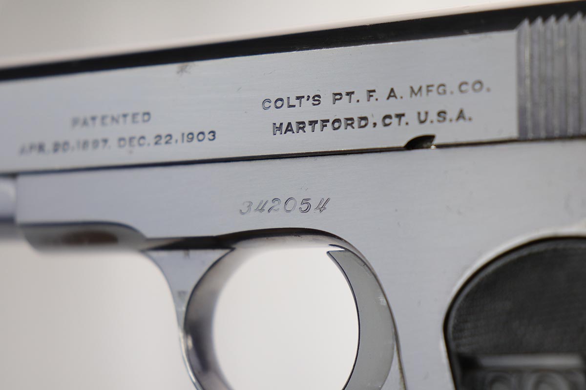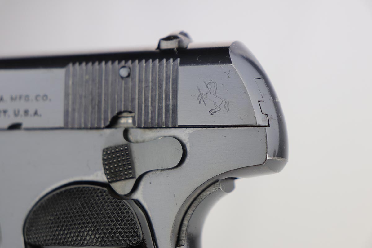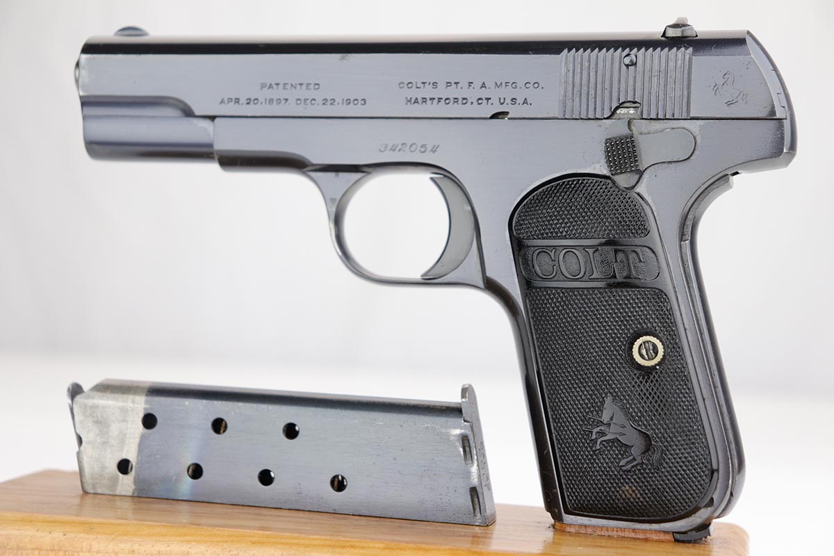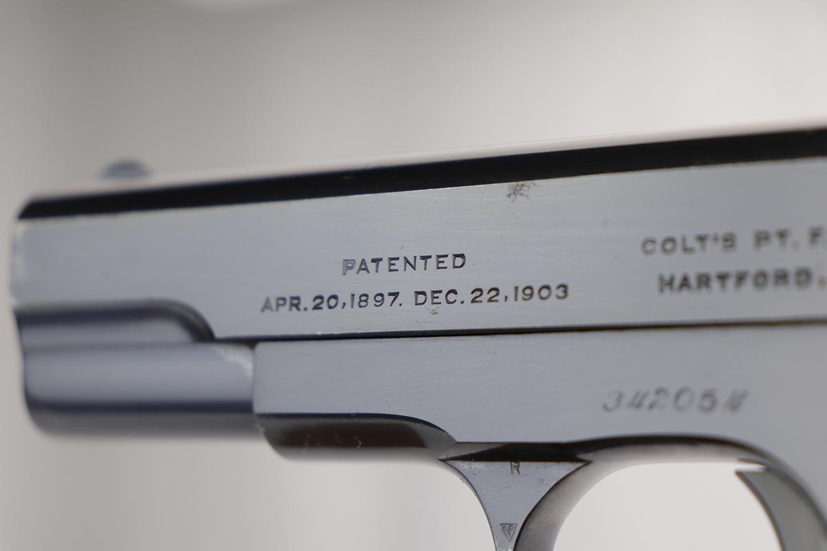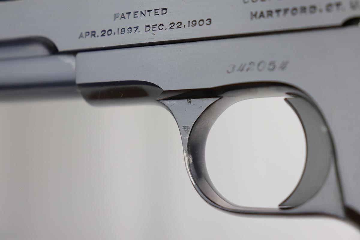 12/4/19 – This is an excellent Colt Model 1903 that was manufactured in 1920. The high-polish blue rates at about 97+% with only minor high edge wear on the slide, and a few scratches on the underside of the slide. The grip safety also has a noticeable amount of oxidation/patina on it, but no corrosion. Minty bore. Excellent grips. Two-tone magazine.