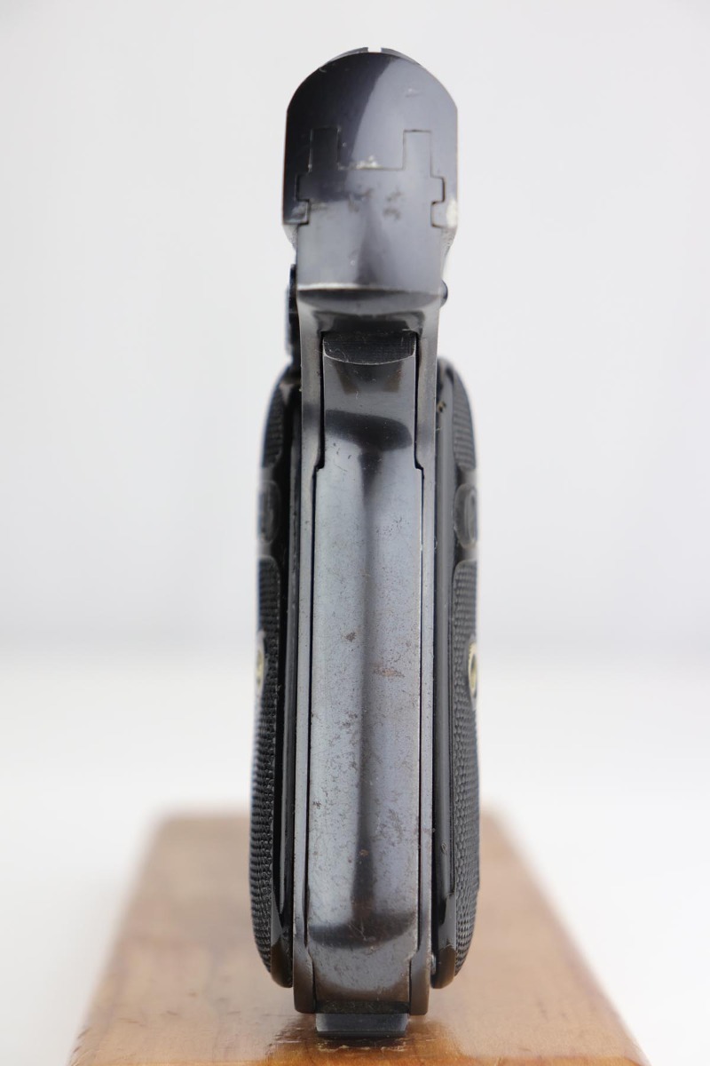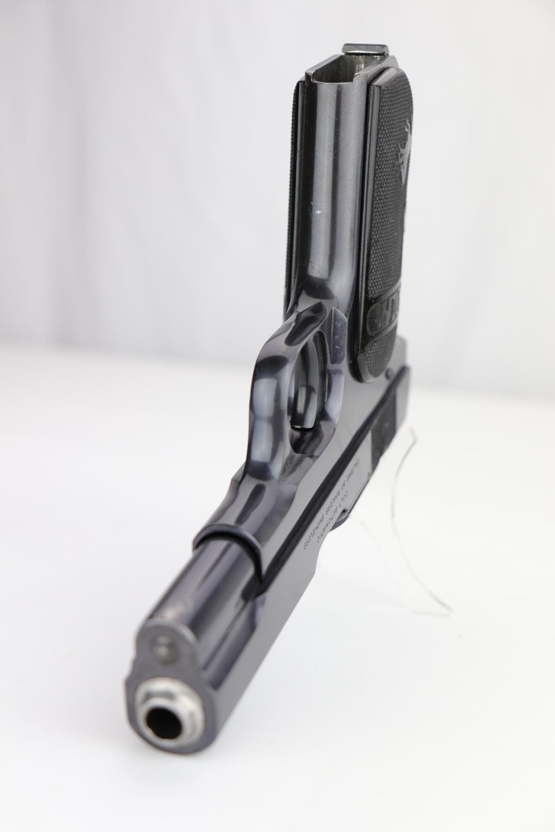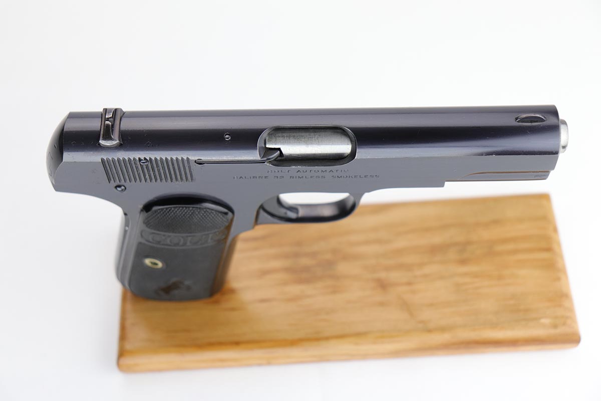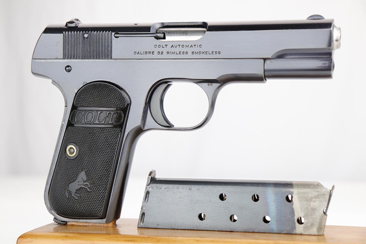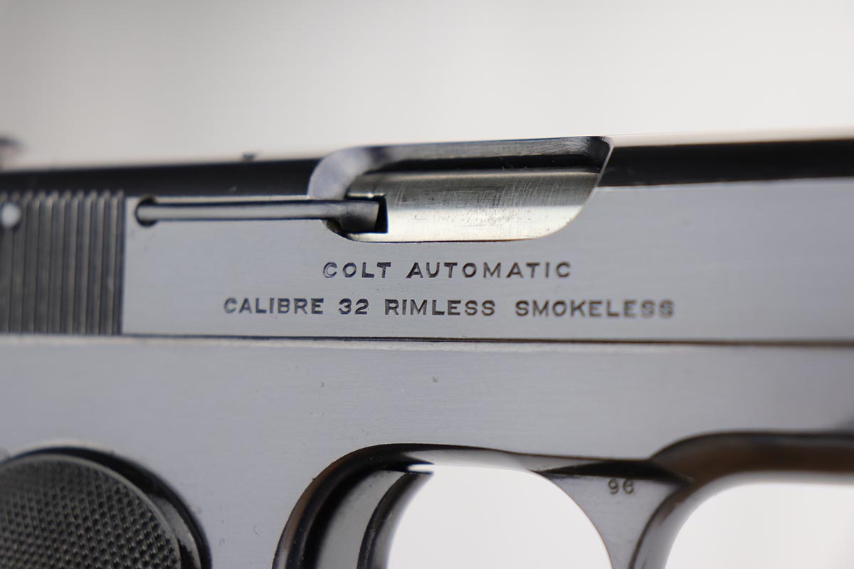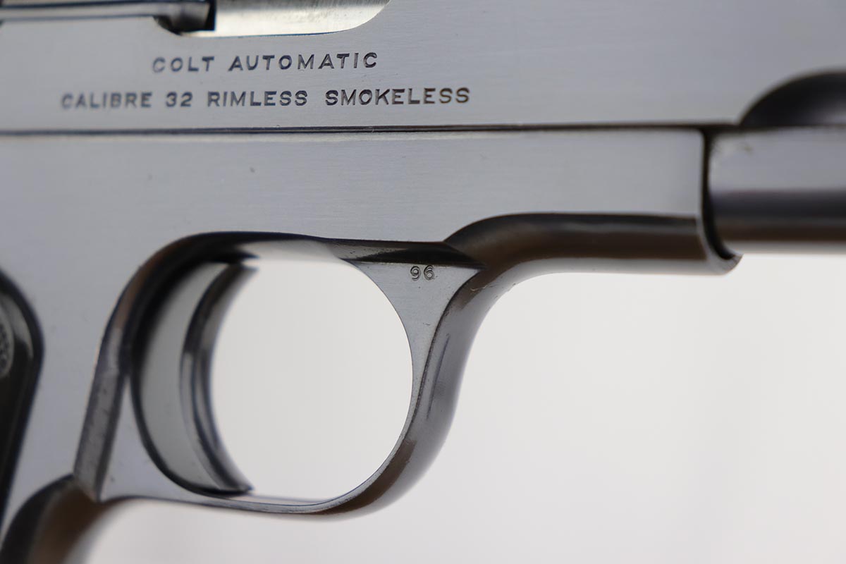 12/4/19 – This is an excellent Colt Model 1903 that was manufactured in 1920. The high-polish blue rates at about 97+% with only minor high edge wear on the slide, and a few scratches on the underside of the slide. The grip safety also has a noticeable amount of oxidation/patina on it, but no corrosion. Minty bore. Excellent grips. Two-tone magazine.