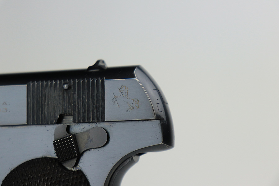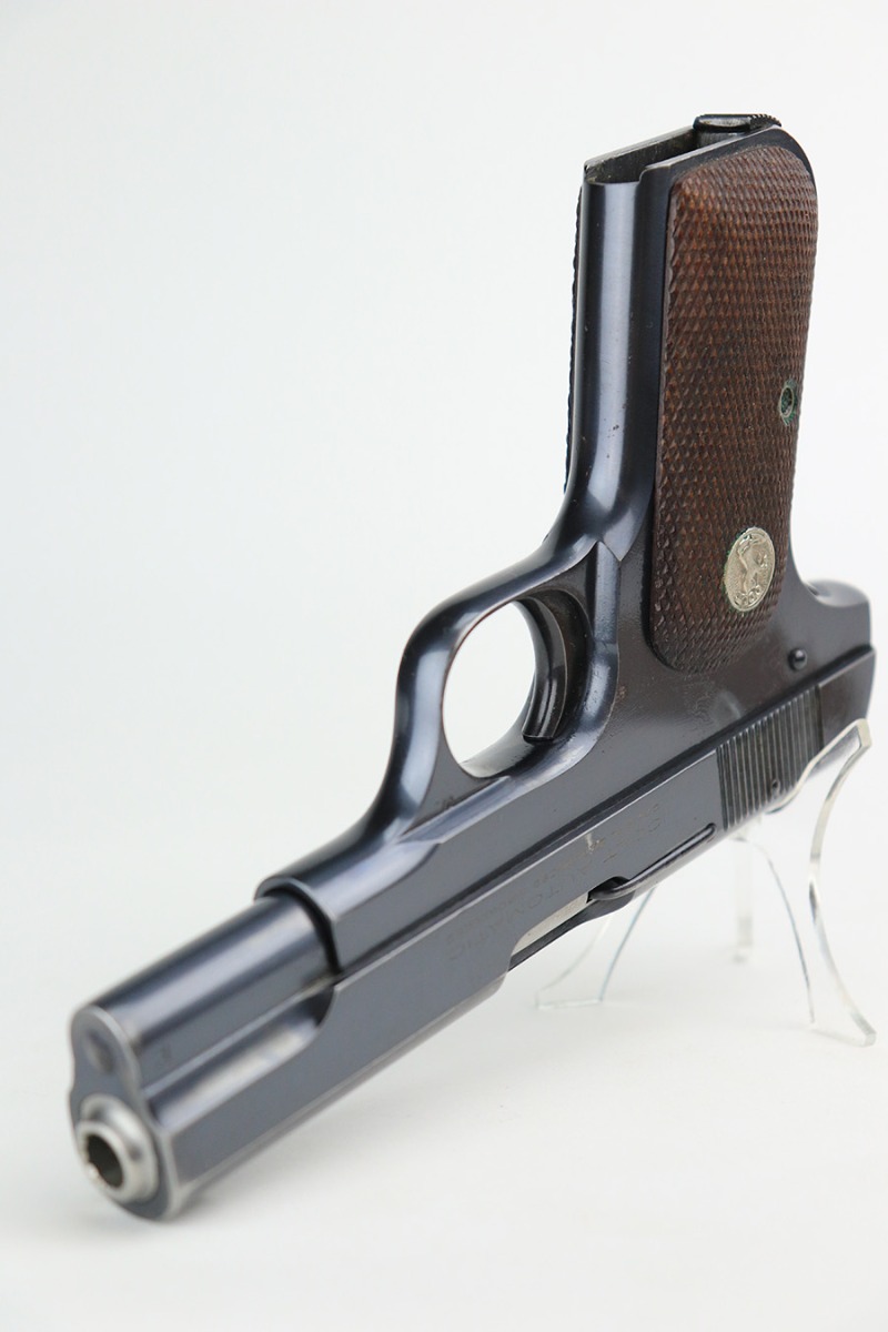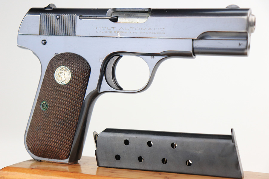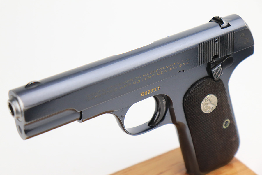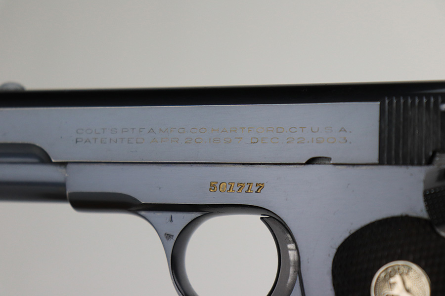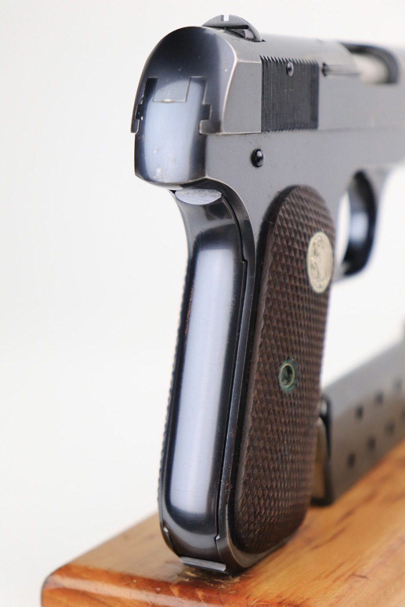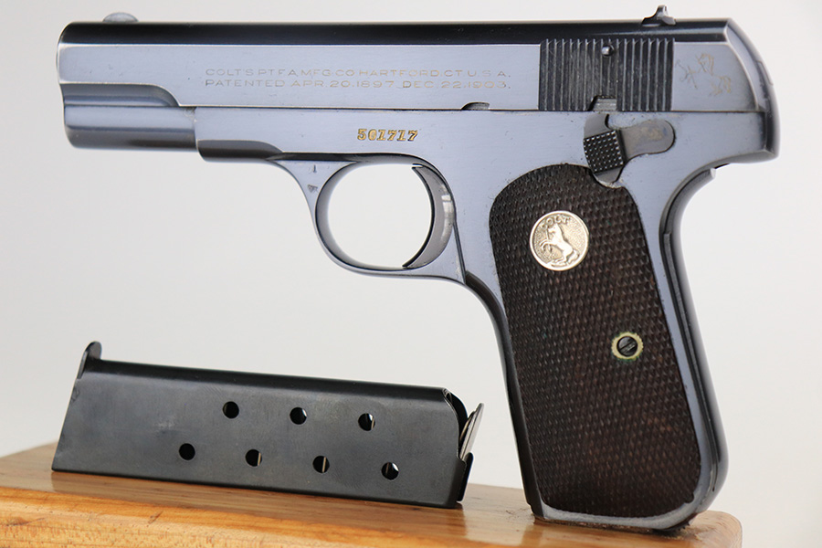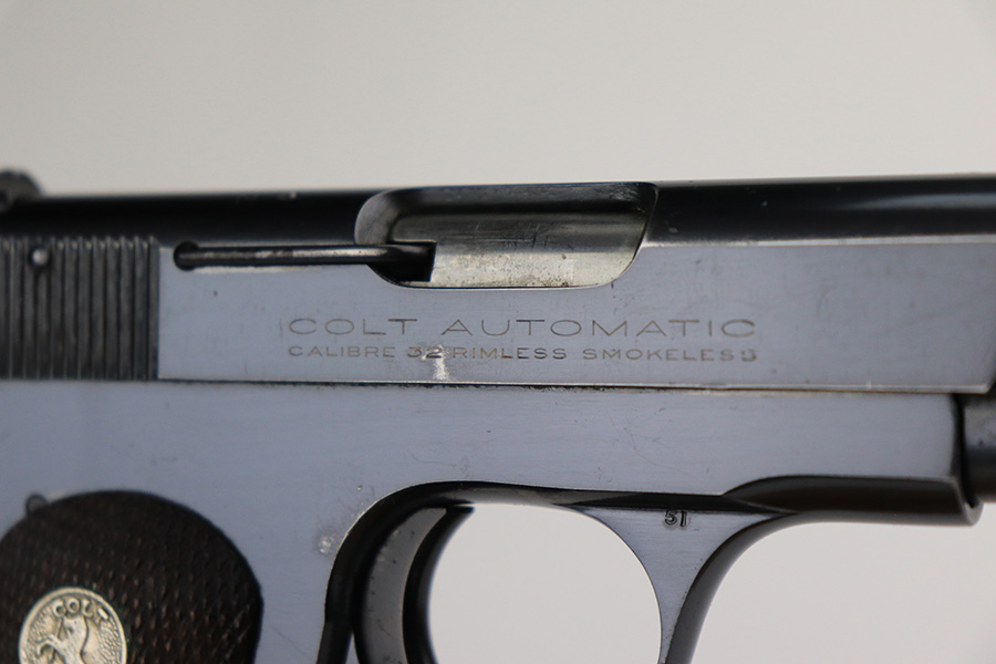 6/2/22 – This is a beautiful example of a Colt Model 1903 that was made in 1930. It has about 97% of the original blue remaining, with minor wear around the muzzle and a couple small spots of wear on the right side of the slide and frame. Strong, shiny bore. Excellent wood grips. Magazine is fully blued and marked ‘CAL .32 AUTO’ on the base.