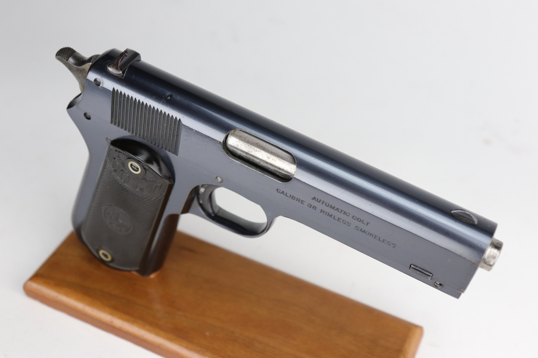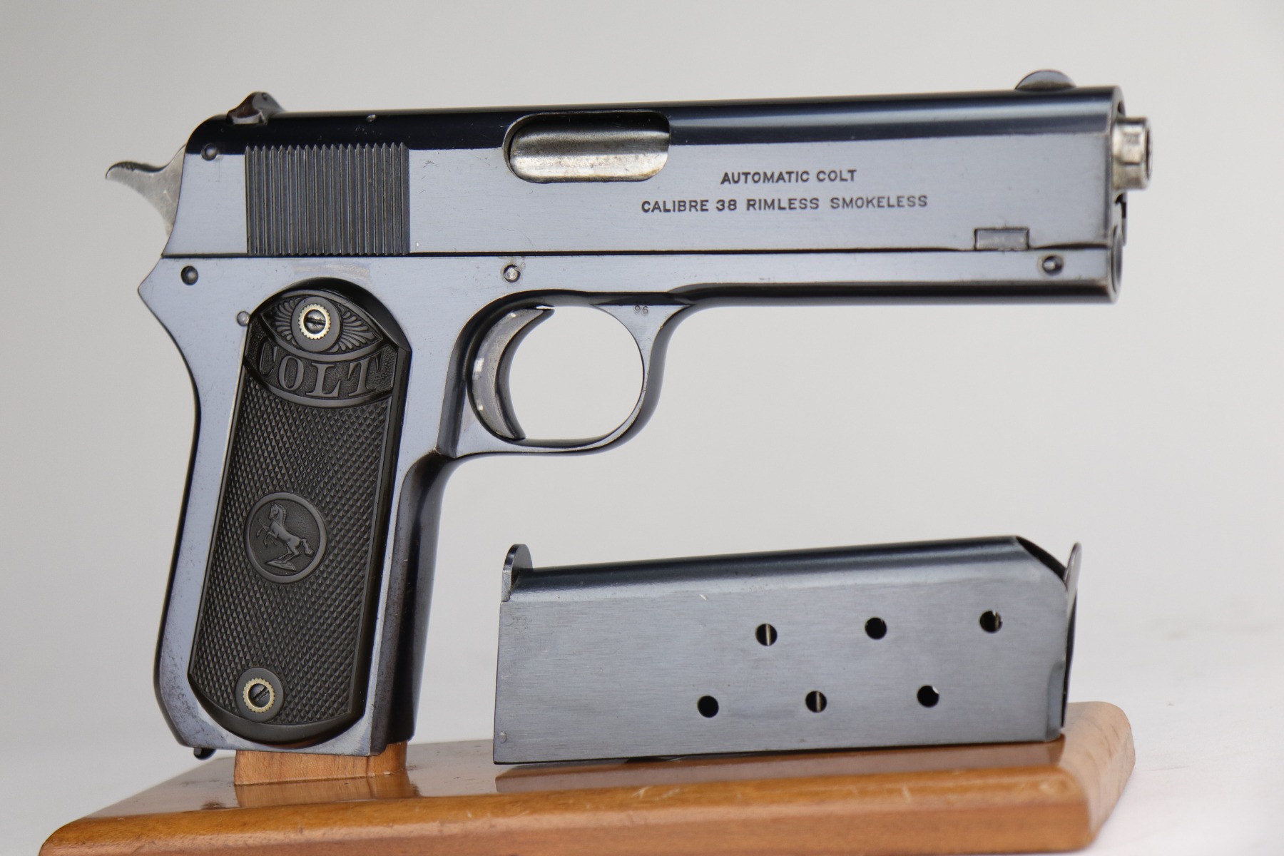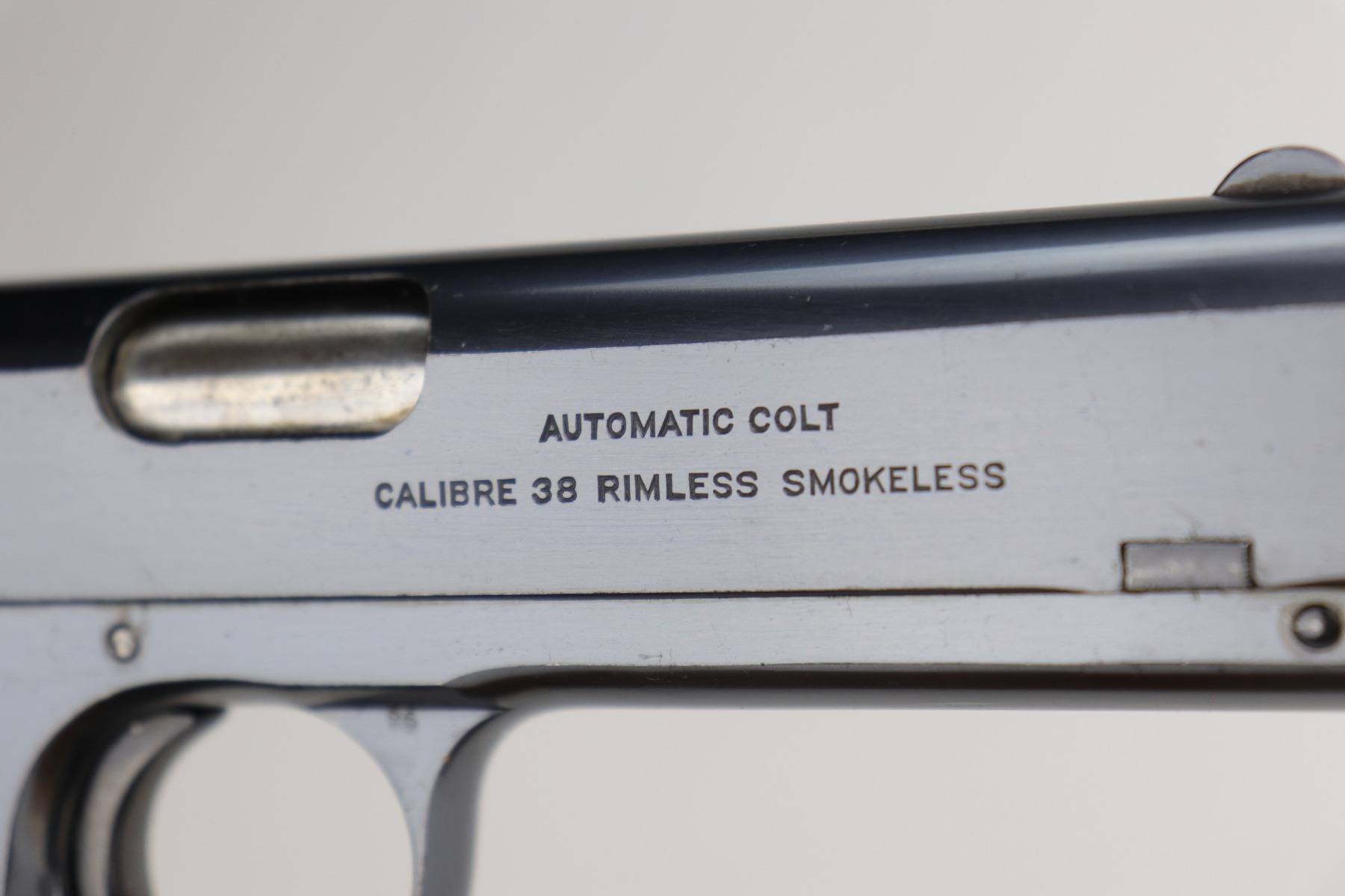 12/21/20 – This is an excellent example of a Colt M1903 Pocket Hammer, chambered in .38 caliber. It was manufactured in 1920. It is all correct and has retained about 97% of its original beautiful Colt bluing. There are a few spots of discoloration on the front strap, and very minor wear around the muzzle and some of the high edges. There is some spotty oxidation on the front straps. It has excellent original grips and comes with one proper magazine. Excellent bore – shiny with strong rifling with very minor freckling in the grooves.