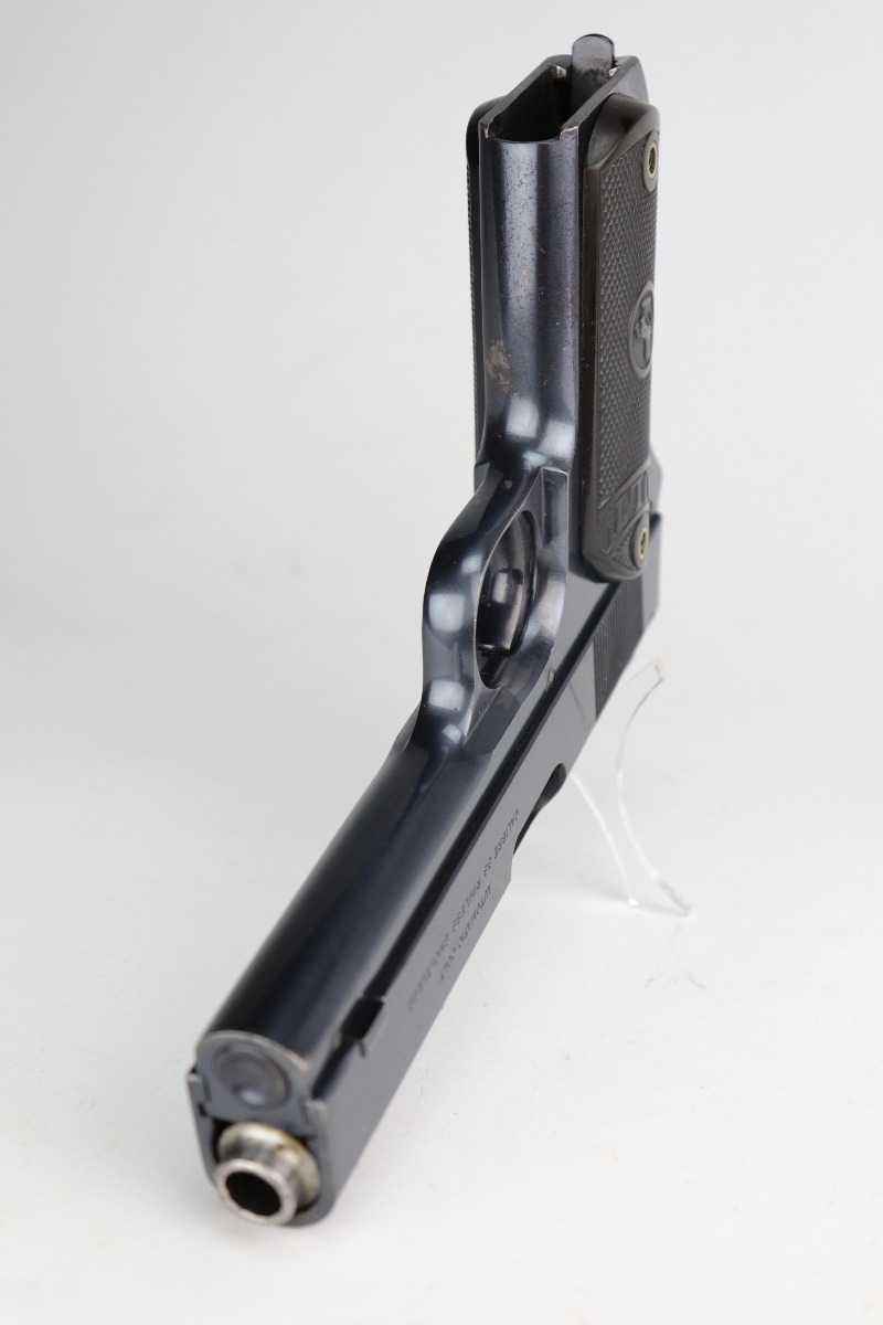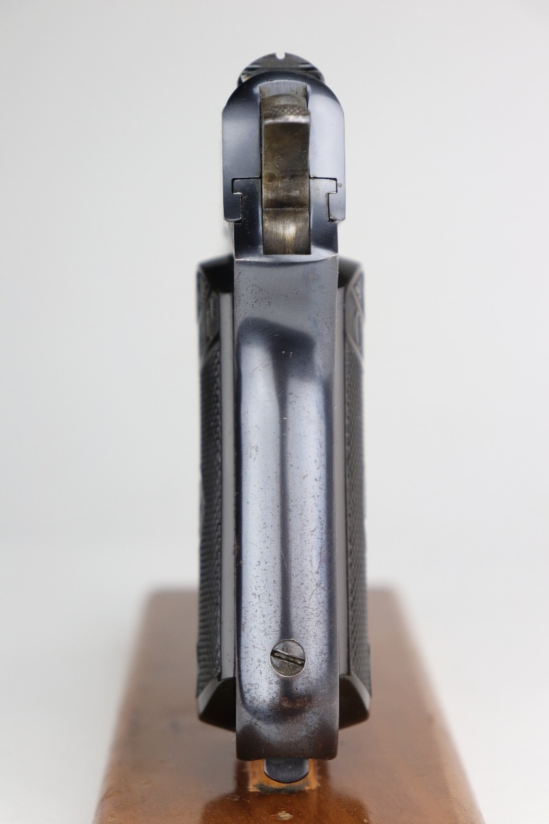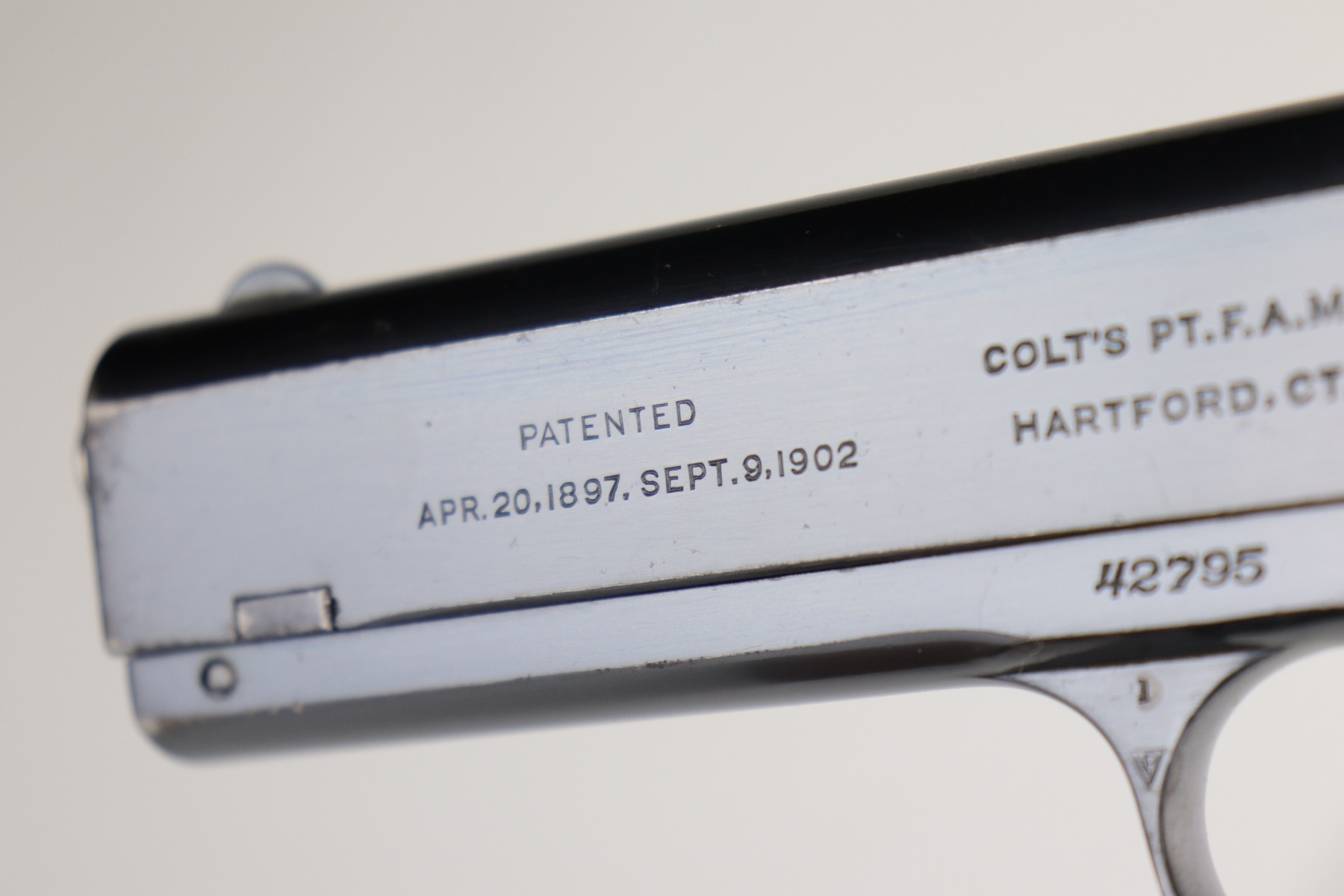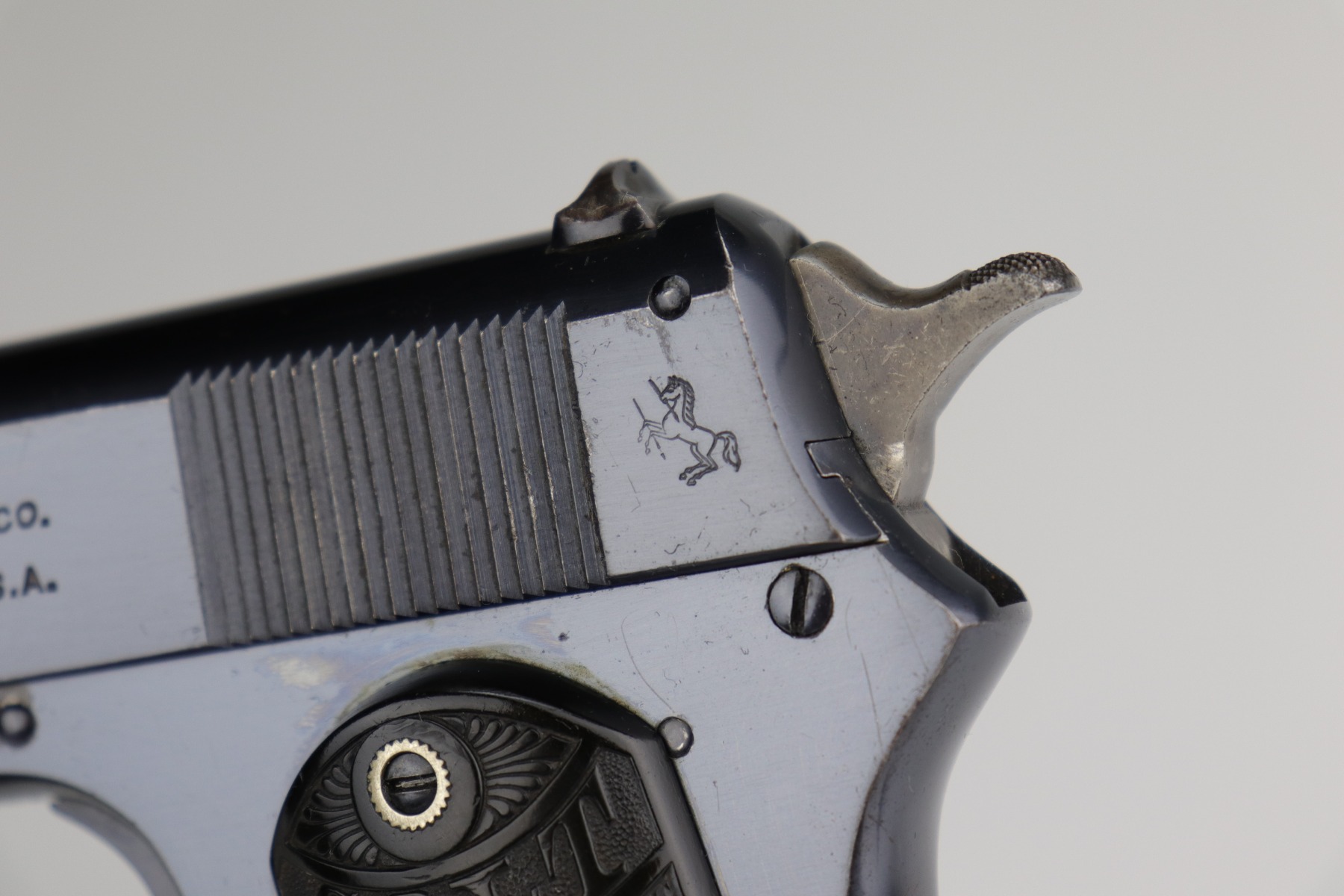 12/21/20 – This is an excellent example of a Colt M1903 Pocket Hammer, chambered in .38 caliber. It was manufactured in 1920. It is all correct and has retained about 97% of its original beautiful Colt bluing. There are a few spots of discoloration on the front strap, and very minor wear around the muzzle and some of the high edges. There is some spotty oxidation on the front straps. It has excellent original grips and comes with one proper magazine. Excellent bore – shiny with strong rifling with very minor freckling in the grooves.
