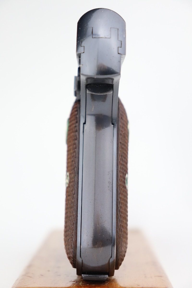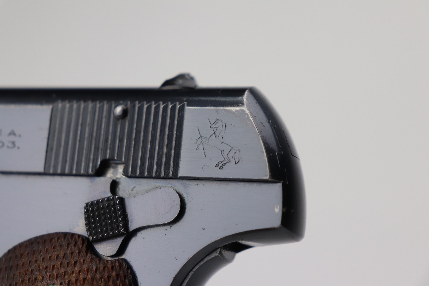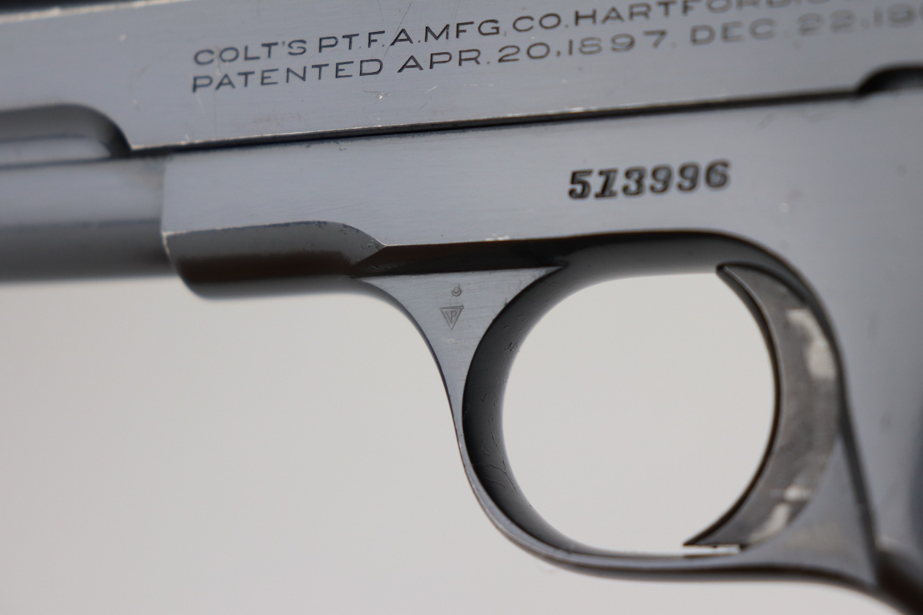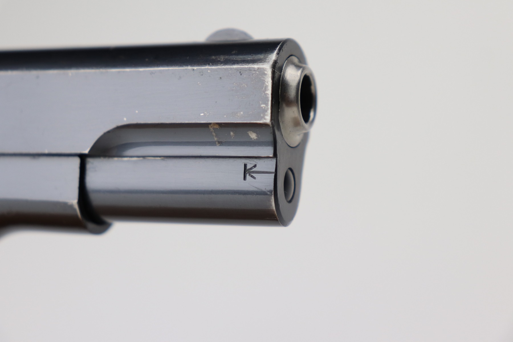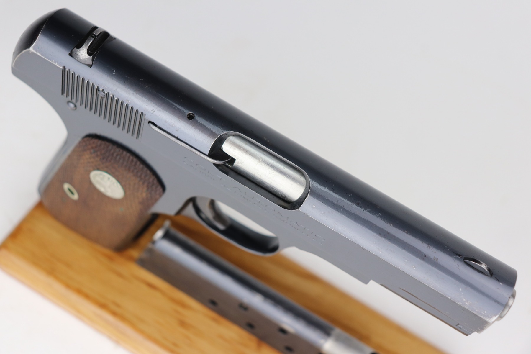 3/5/21 – This is an excellent example of a Colt Model 1903 Pocket Hammerless, manufactured in 1933. It has retained about 96-97% of its original bluing. There is very minor wear around the muzzle and high edges of the slide. One small spot of wear on the front strap. There is a series of small micro scratches on the high edge of the left side of the slide. Comes with minty grips and a period-correct magazine. Minty bore.