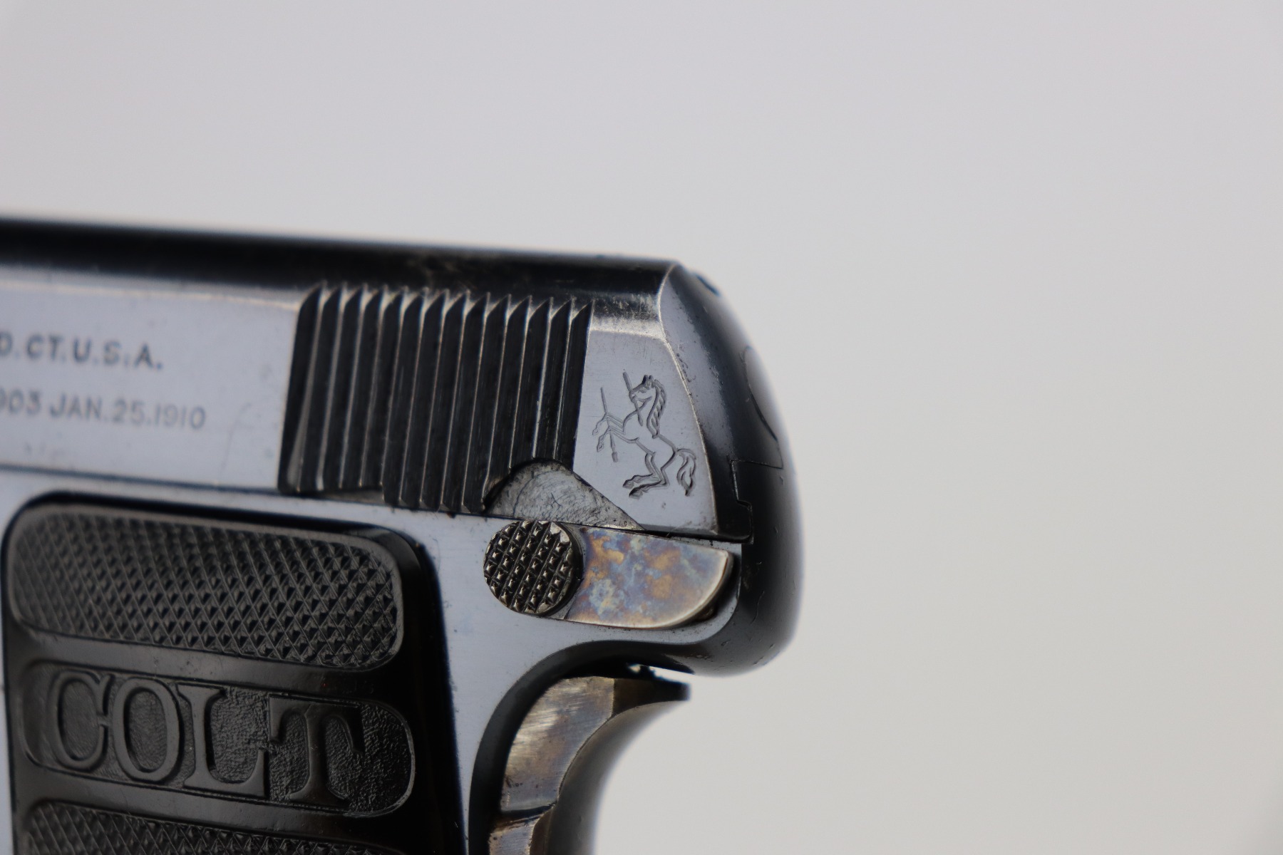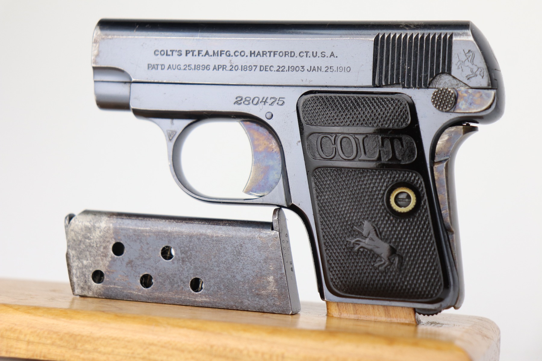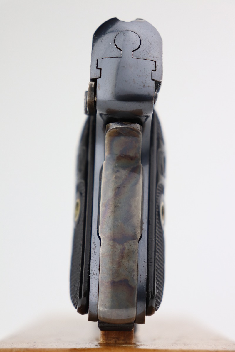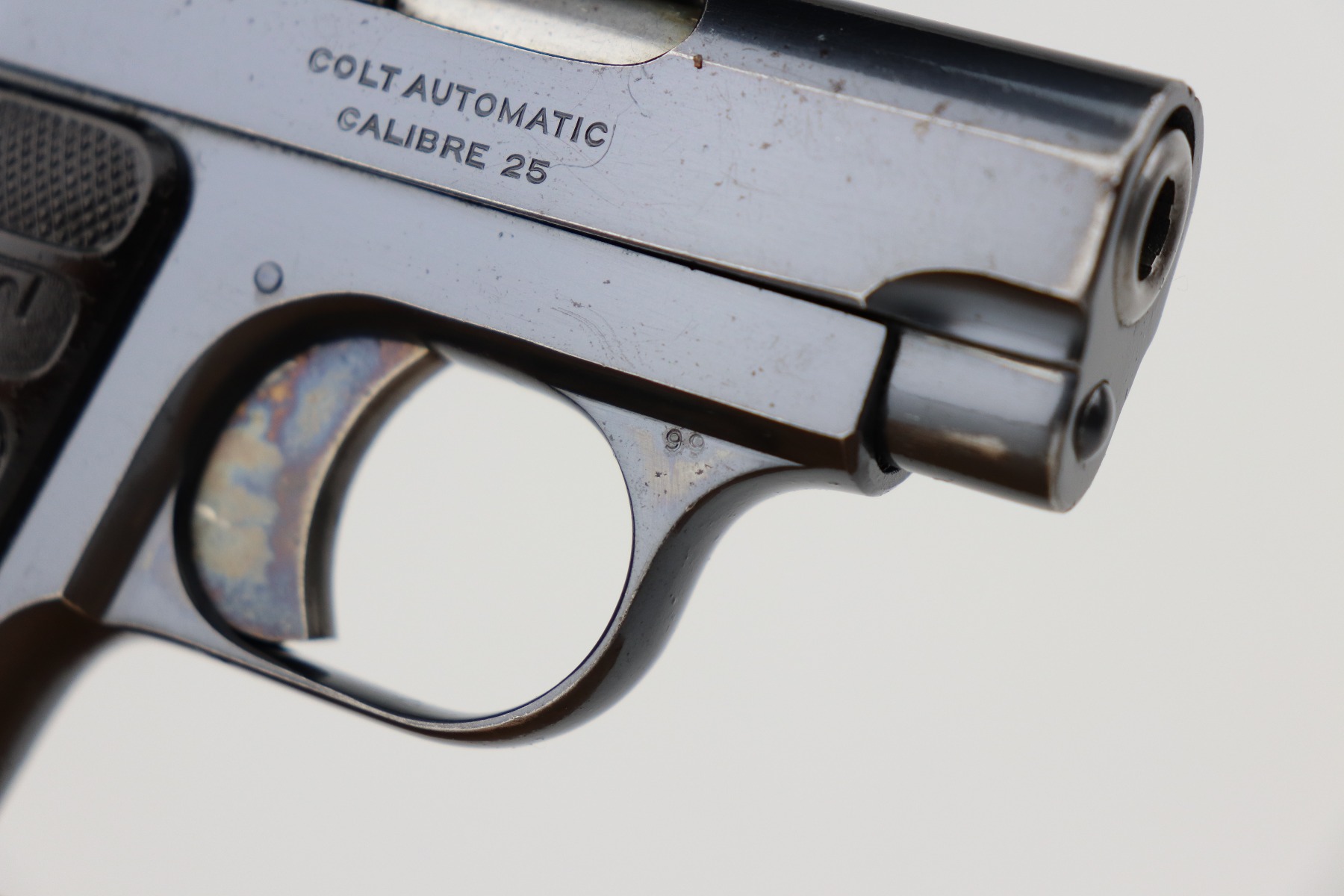3/23/21 – This is an excellent example of a Colt Model 1908 Vest Pocket pistol, manufactured in 1920. The gun is all correct and has retained about 96% of its original finish. The case-hardening is beautiful on this one! There is minor wear around the muzzle and high edges of the slide. A few light scratches on the top of the slide. Tiny dots of oxidation here and there. Comes with excellent grips and a period-correct magazine. The bore has strong rifling with minor fouling.