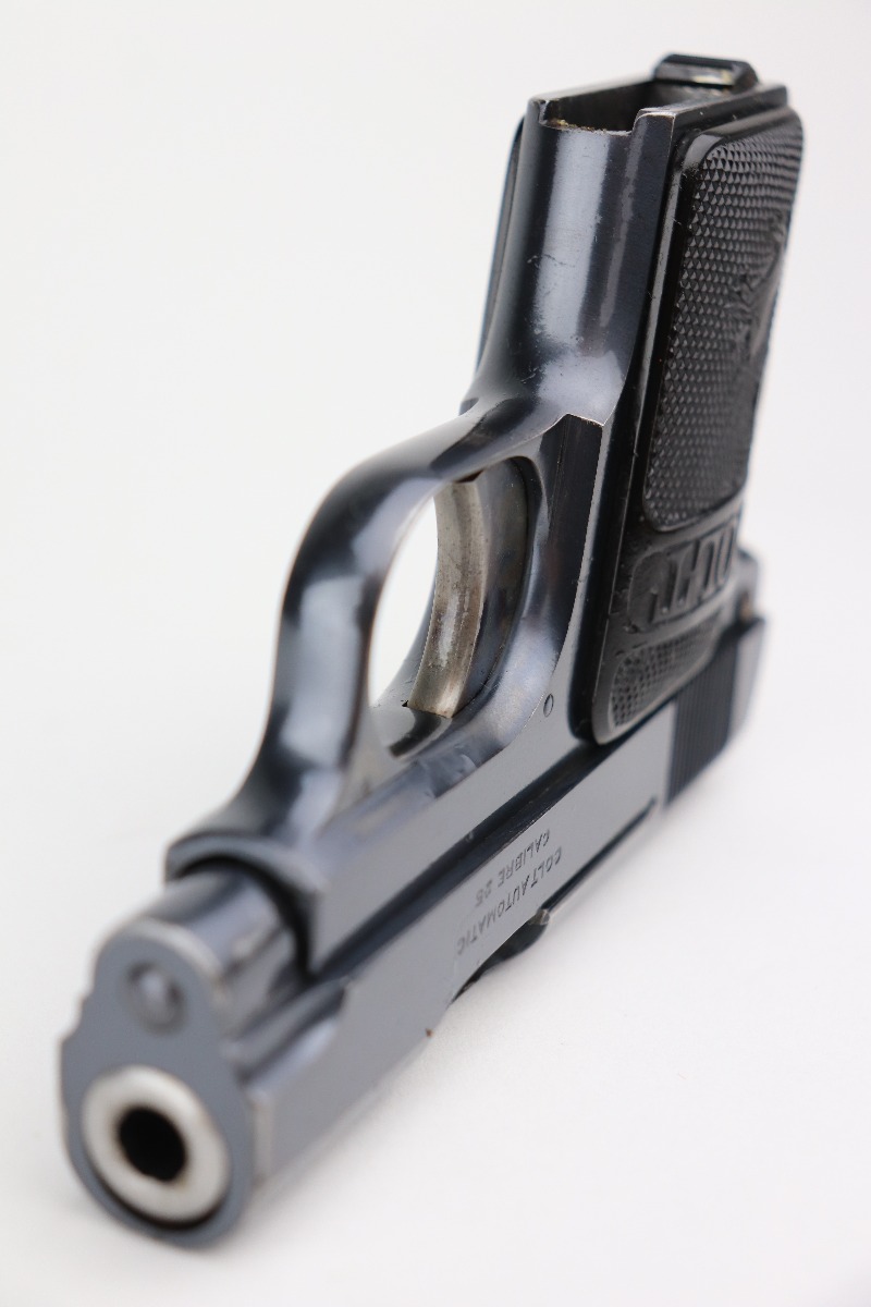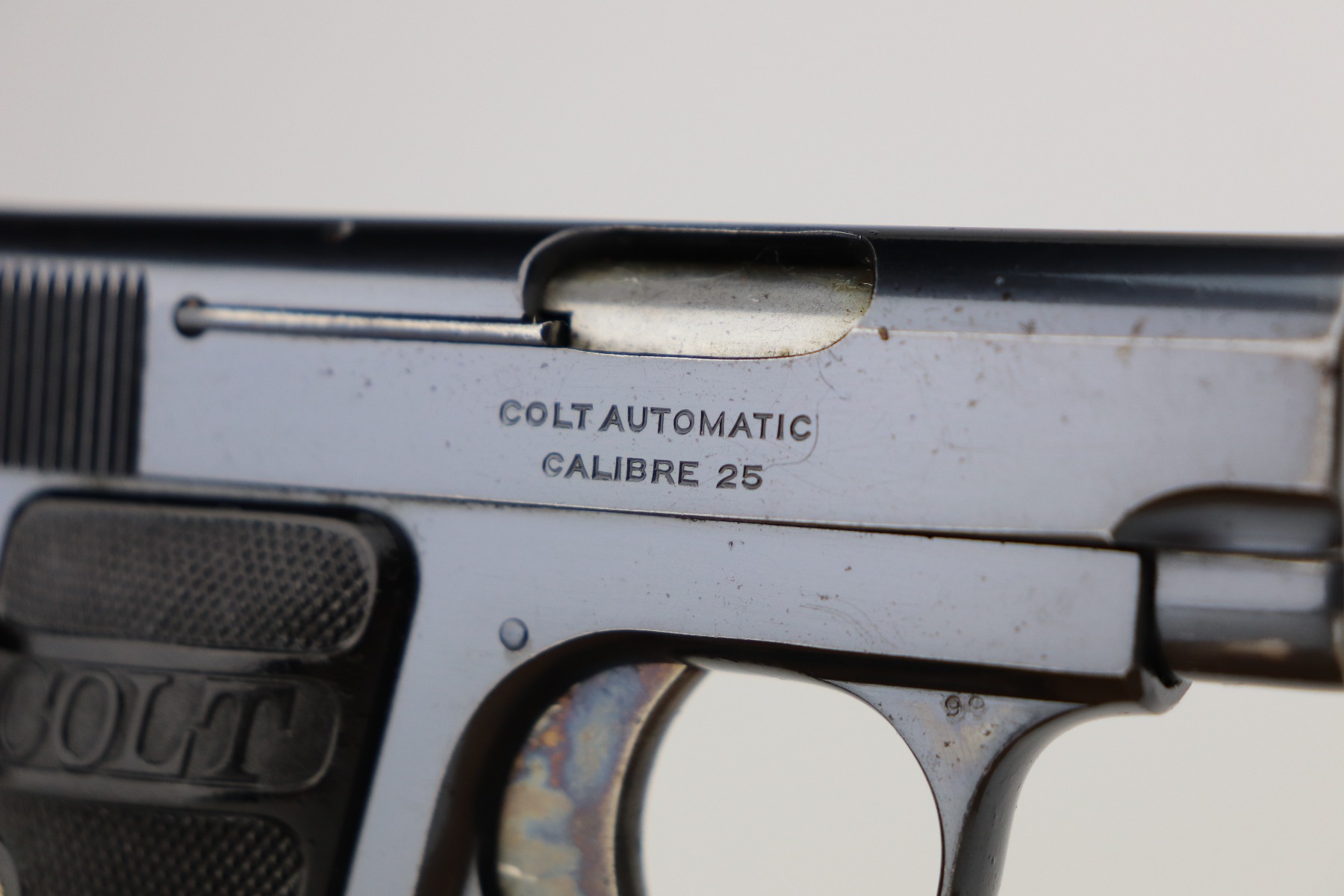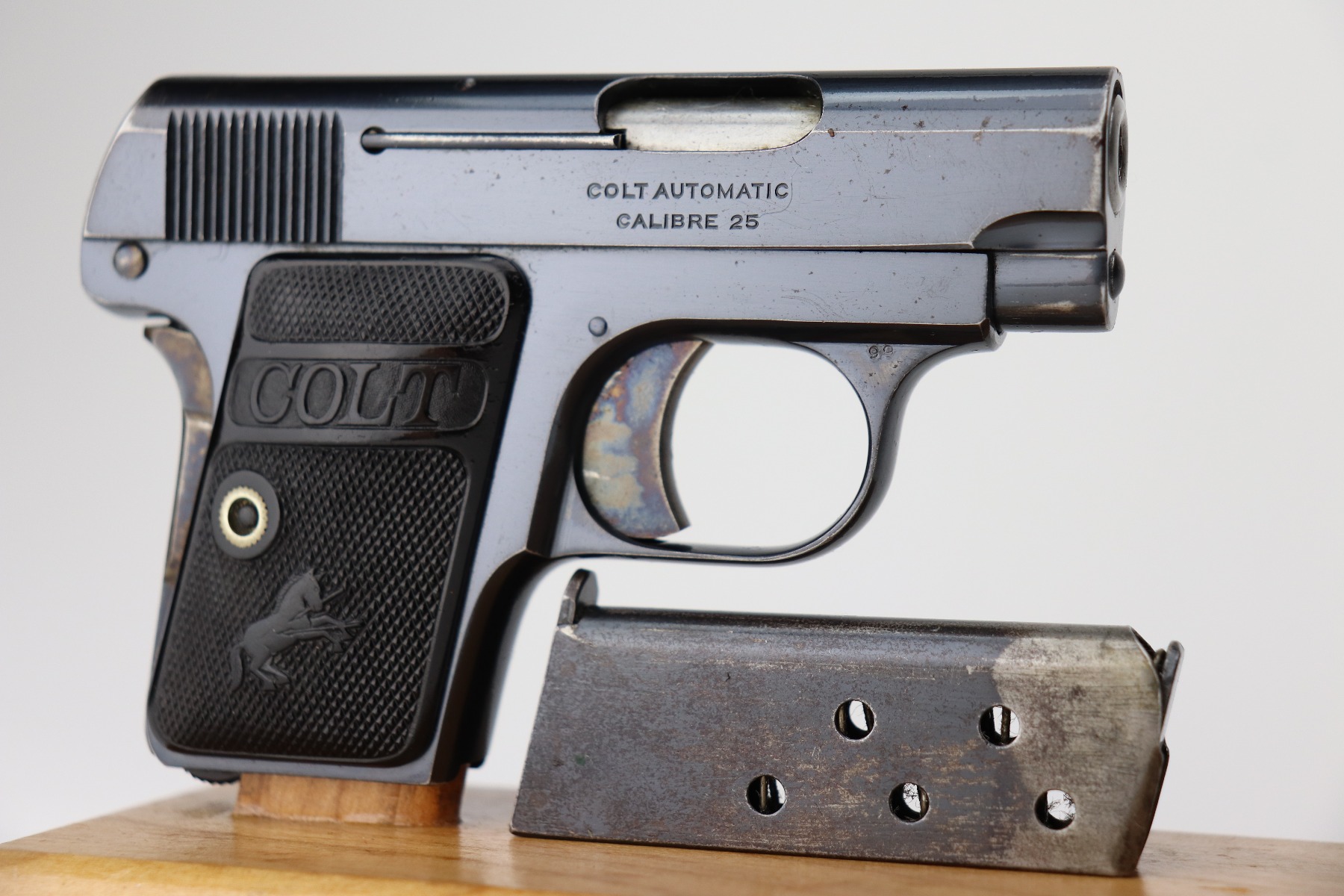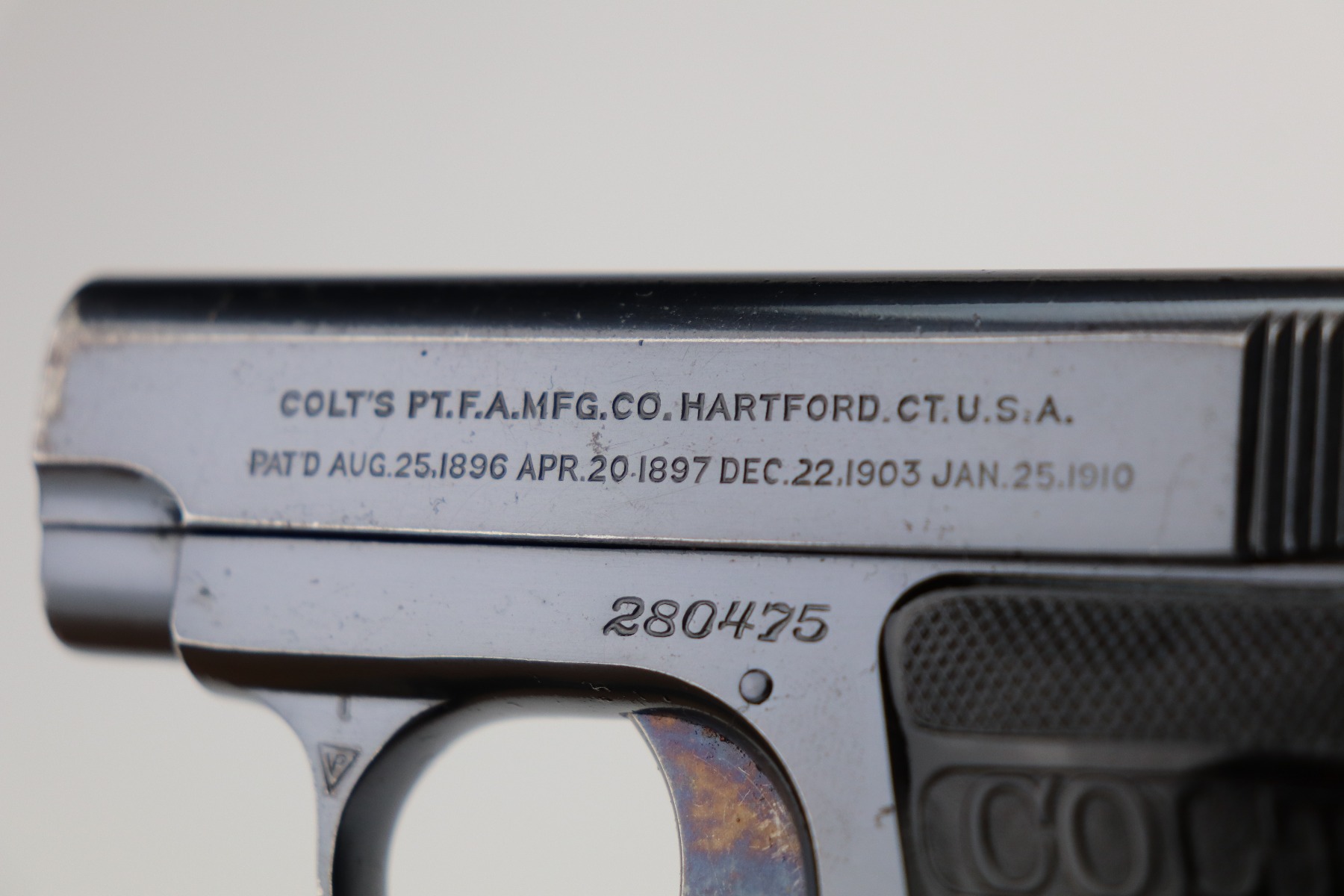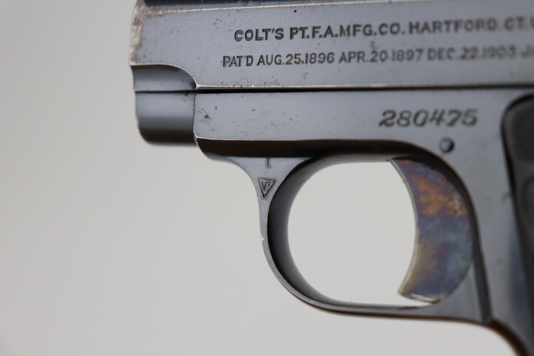 3/23/21 – This is an excellent example of a Colt Model 1908 Vest Pocket pistol, manufactured in 1920. The gun is all correct and has retained about 96% of its original finish. The case-hardening is beautiful on this one! There is minor wear around the muzzle and high edges of the slide. A few light scratches on the top of the slide. Tiny dots of oxidation here and there. Comes with excellent grips and a period-correct magazine. The bore has strong rifling with minor fouling.