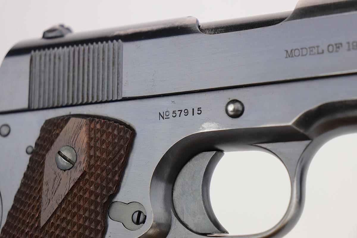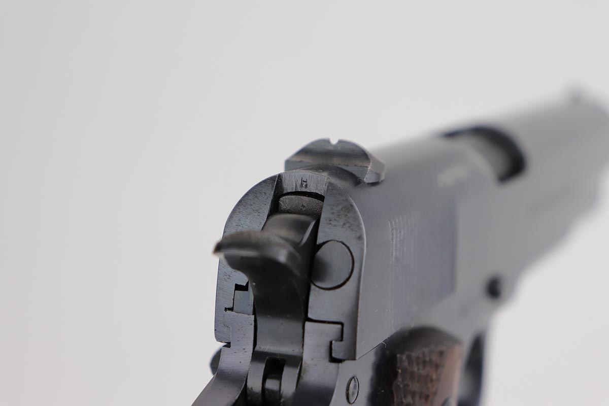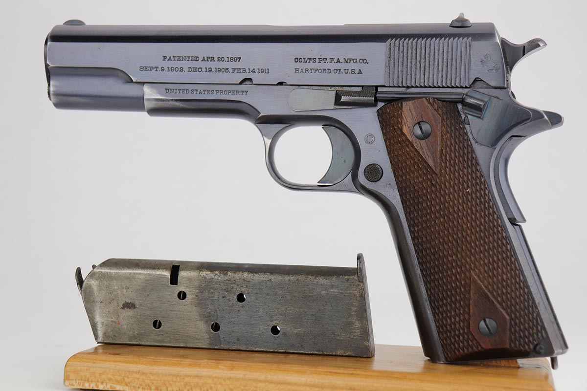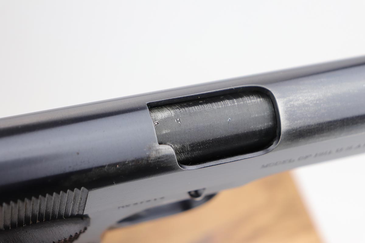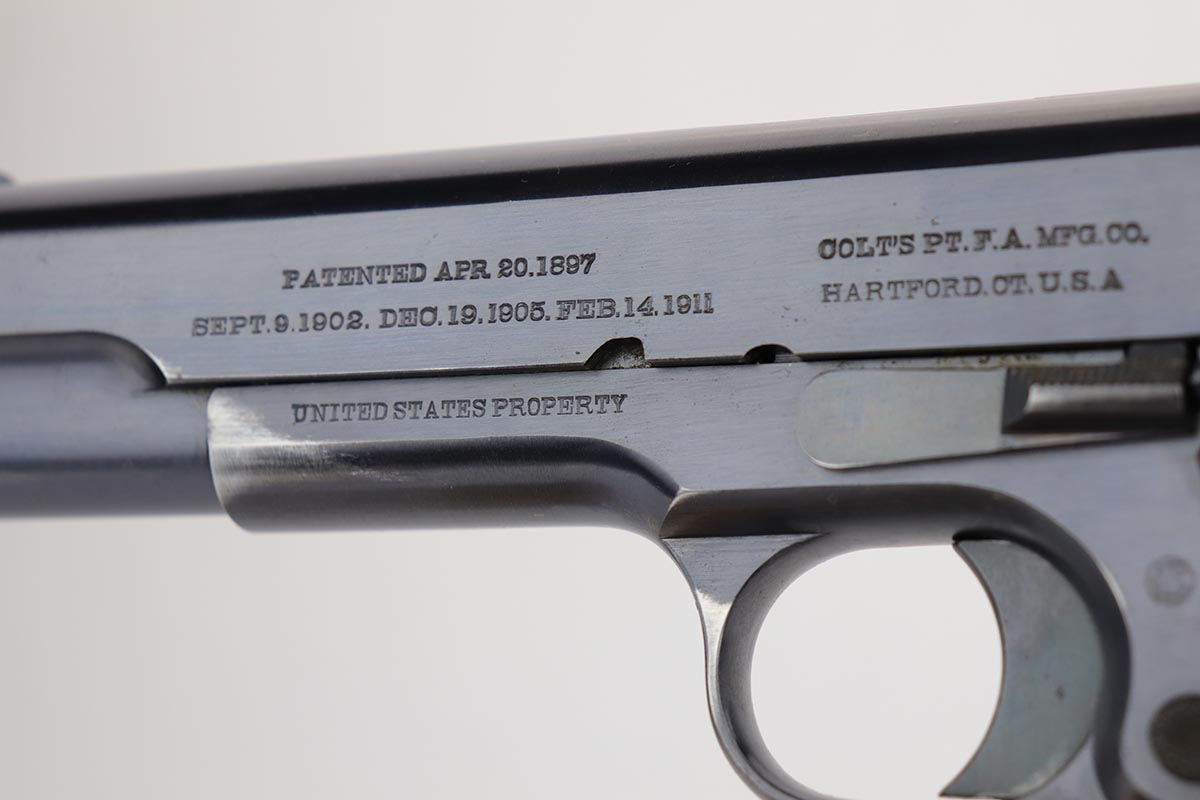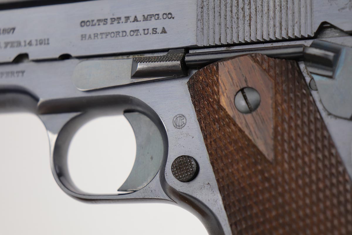 8/13/19 – This is a beautiful and all original Colt M1911 from late in 1913. The beautiful brushed blue rates at about 94-95% with most of the wear along the top of the slide and underside of the frame, with some additional minor finish loss on high points. Proper Colt barrel with disconnected ‘P H’ and mint bore. ‘H’ marked slide. Fantastic grips. Two-tone magazine.