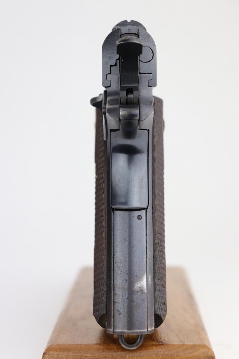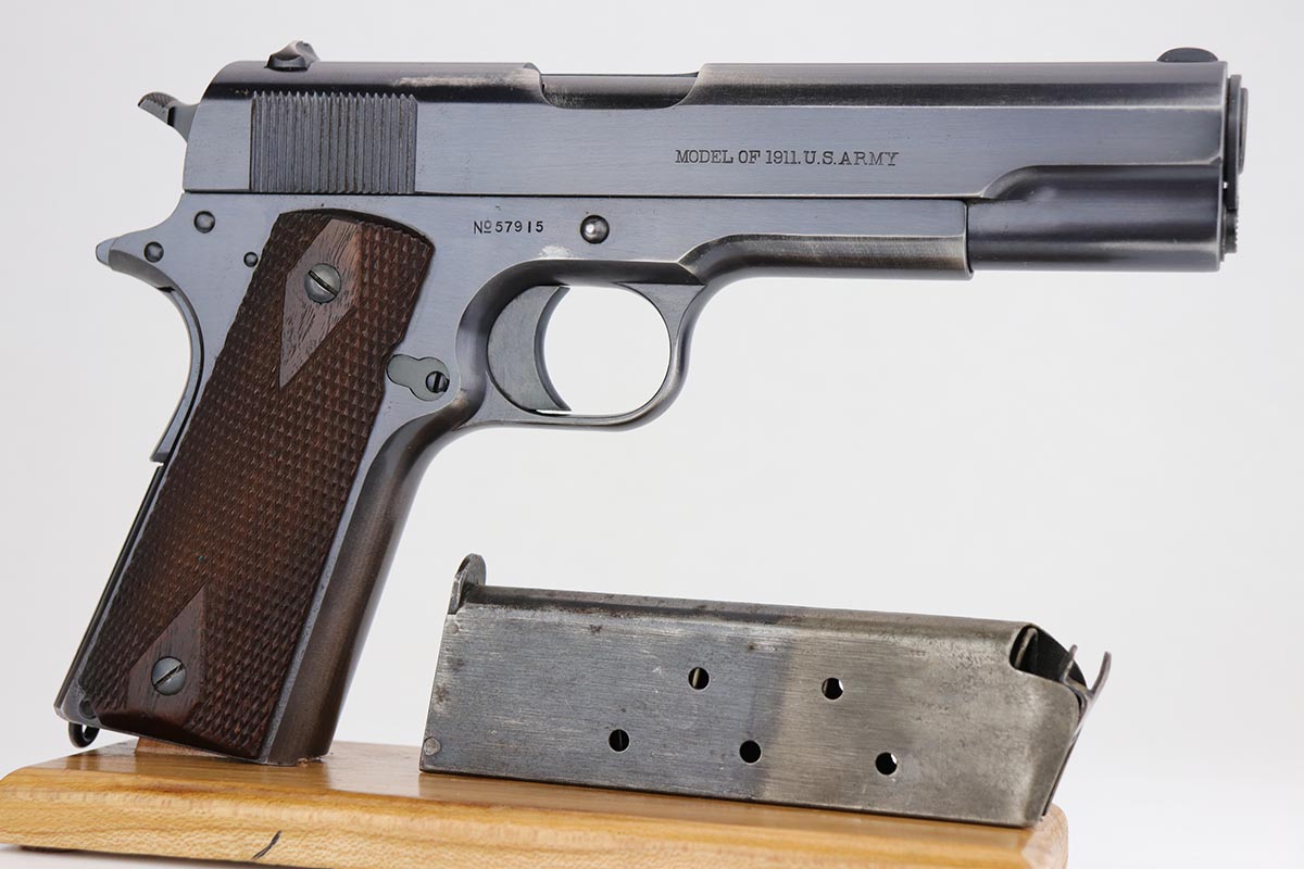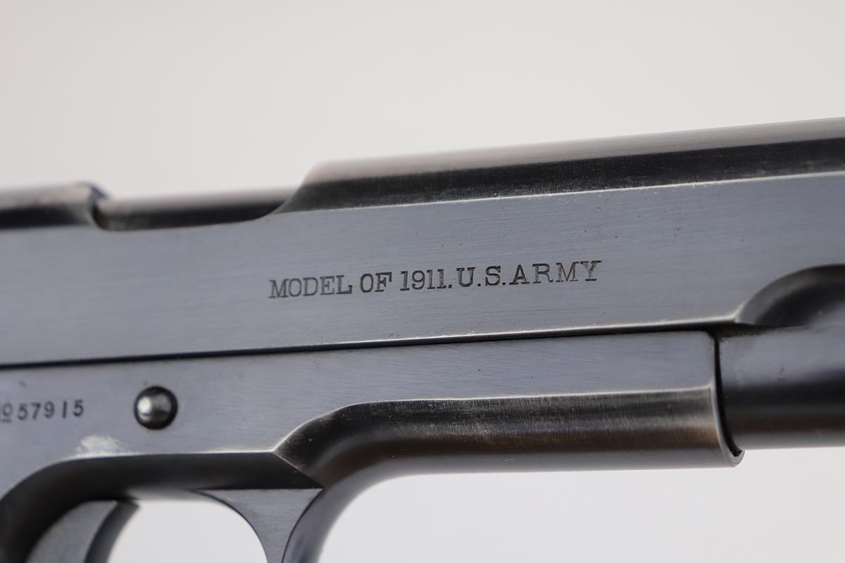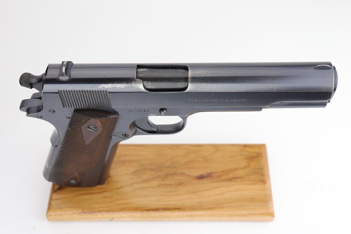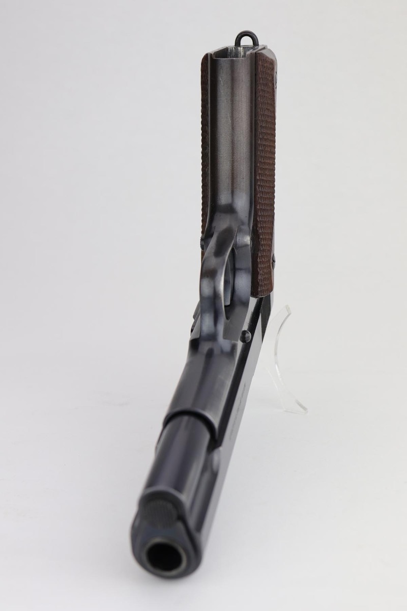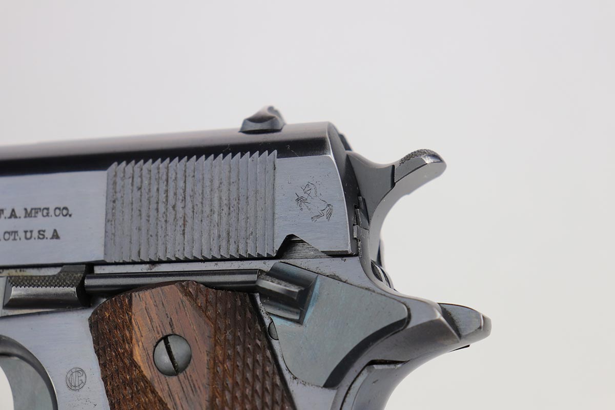 8/13/19 – This is a beautiful and all original Colt M1911 from late in 1913. The beautiful brushed blue rates at about 94-95% with most of the wear along the top of the slide and underside of the frame, with some additional minor finish loss on high points. Proper Colt barrel with disconnected ‘P H’ and mint bore. ‘H’ marked slide. Fantastic grips. Two-tone magazine.