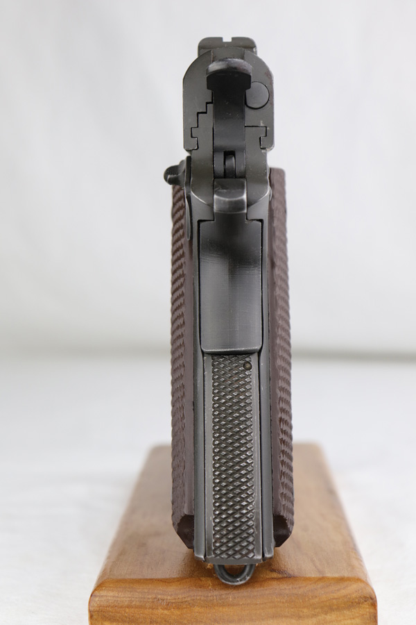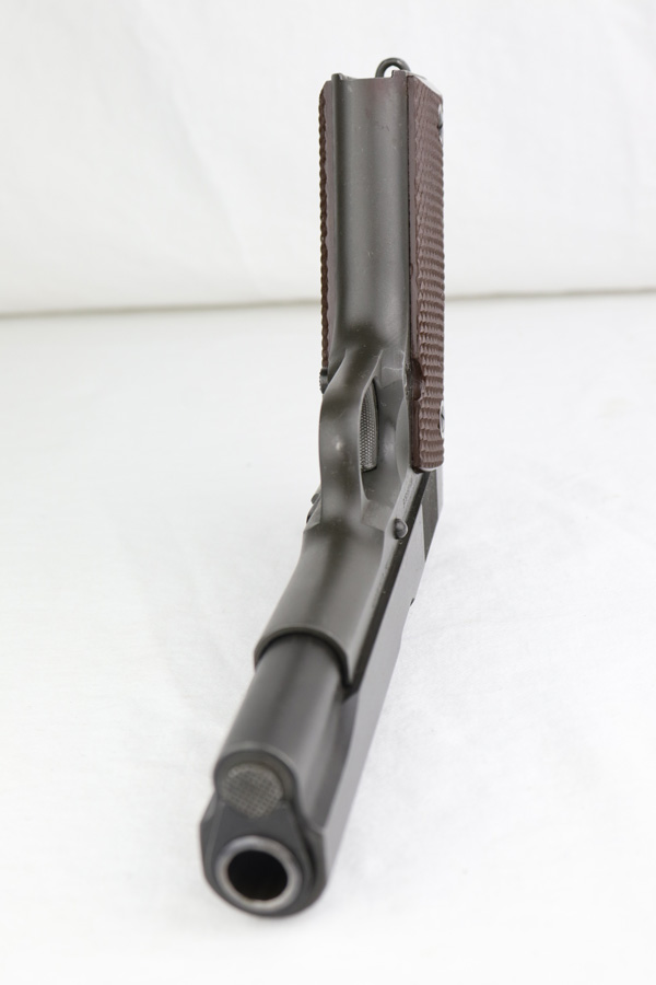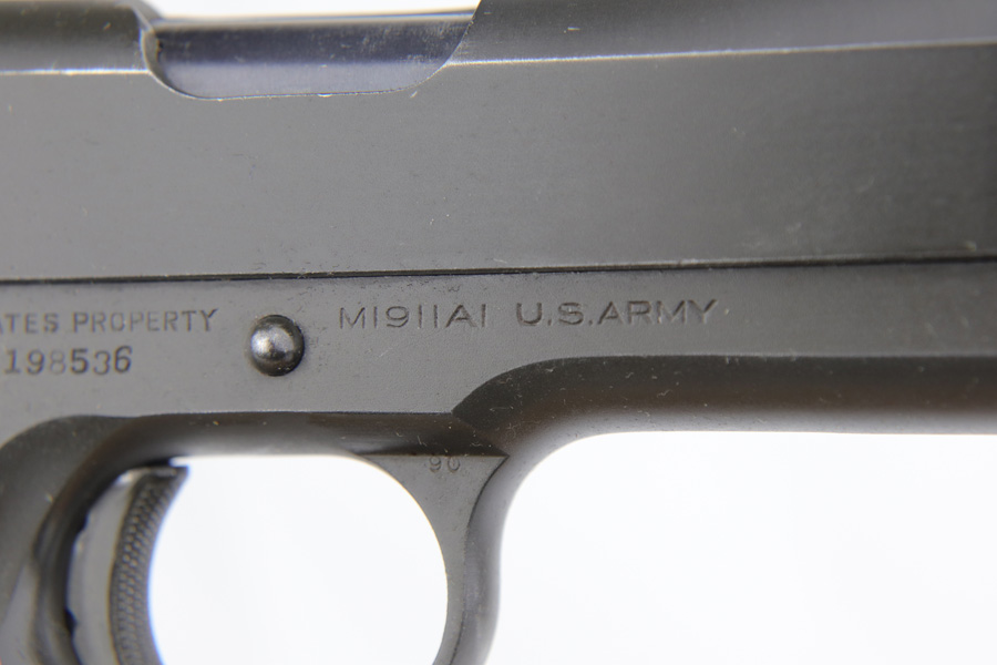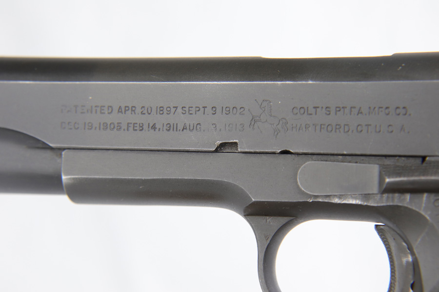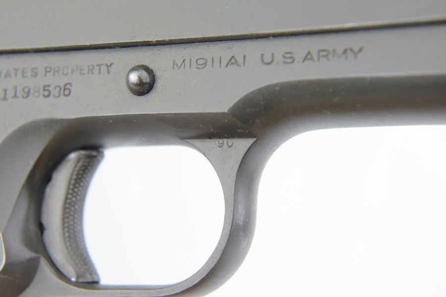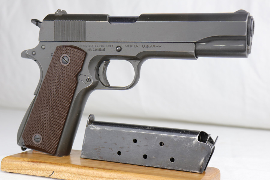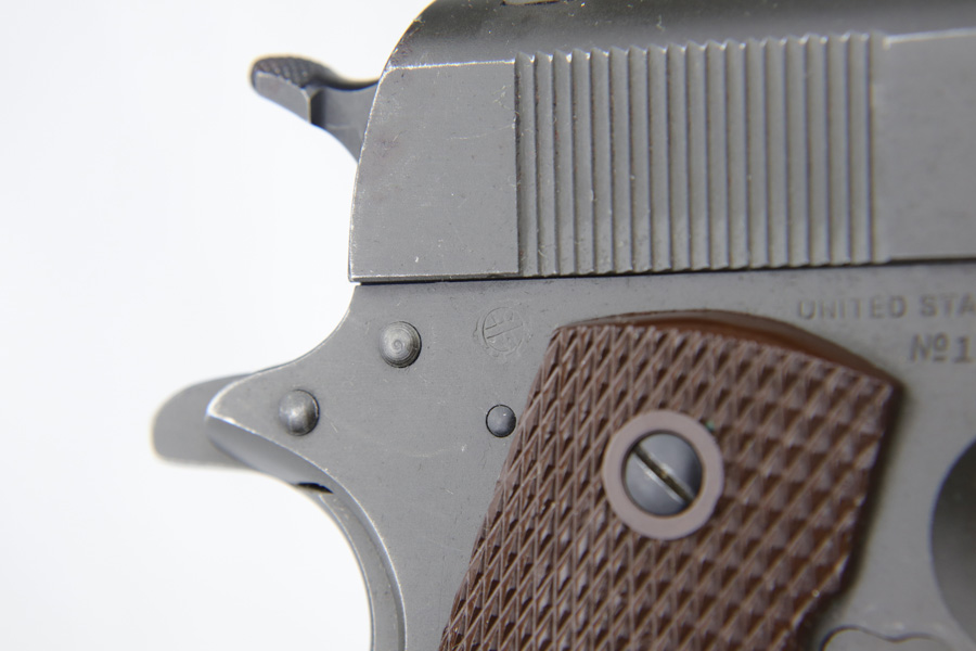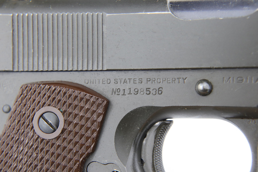 1/18/19 – This is an excellent Colt M1911A1 from 1943 in original condition. The parkerized finish rates at 97-98% with minor muzzle and high edge thinning, and slight finish loss where slide meets frame. Proper inspector marks and proofs, with correctly unnumbered slide. Colt bare. Excellent grips and bore. ‘R’ marked magazine.
