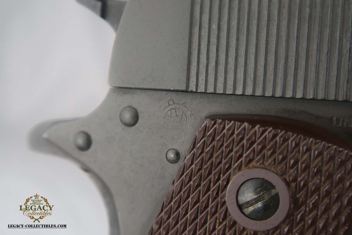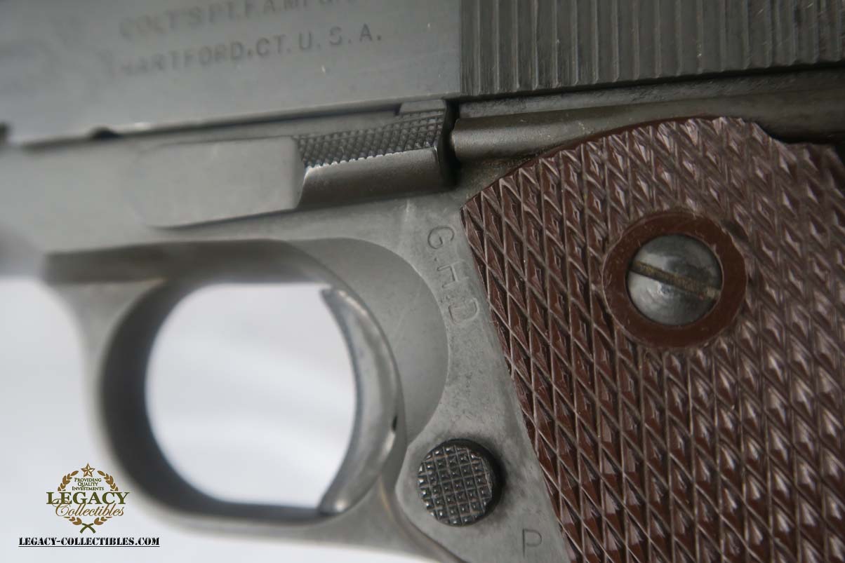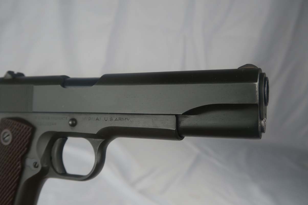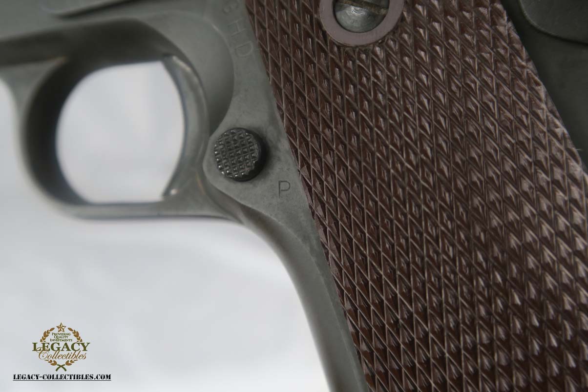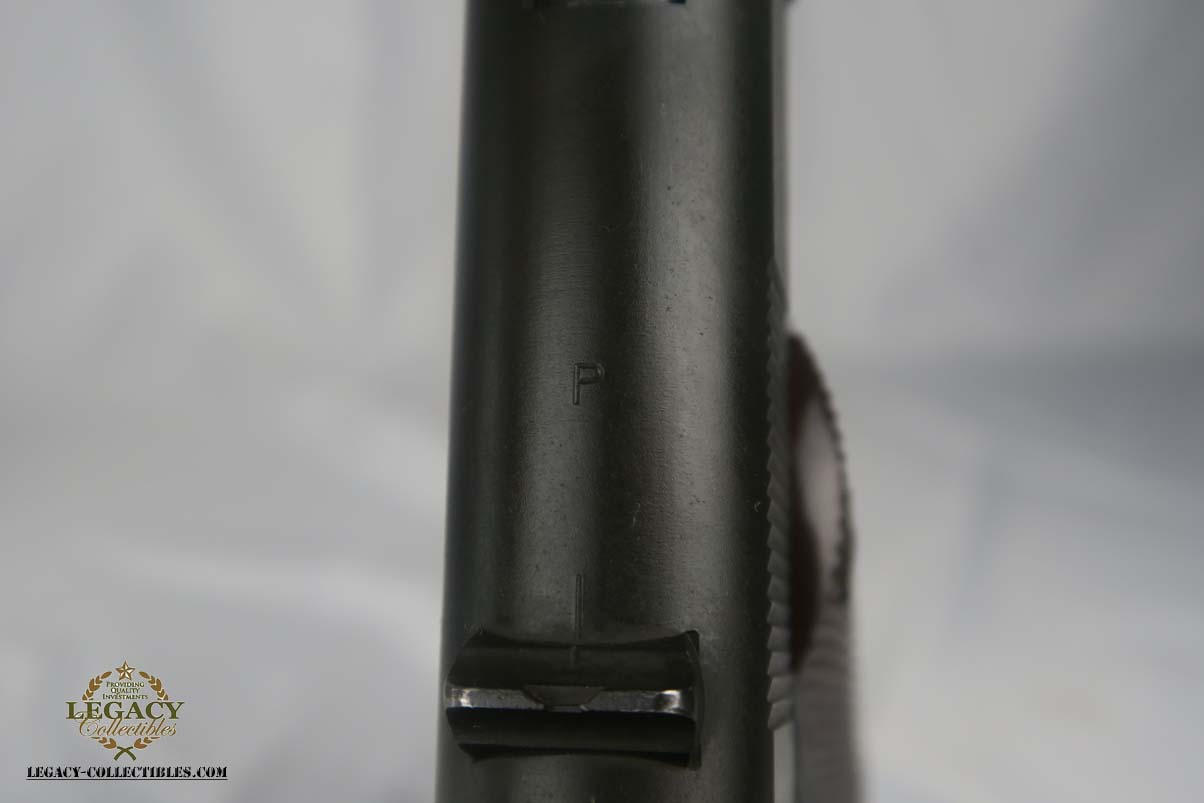 5/18/17 – This is an excellent example of a WW2 era Colt M1911A1, manufactured in 1944 for use by the American Army. The original finish rates at 98+%, with only minor slide wear and a beautiful front strap. The gun has the correct Colt barrel, and is properly proofed (G.H.D. inspector proof, P on slide and frame). Period correct grips and magazine, which is marked ‘S’ on the lip. Bore is minty.