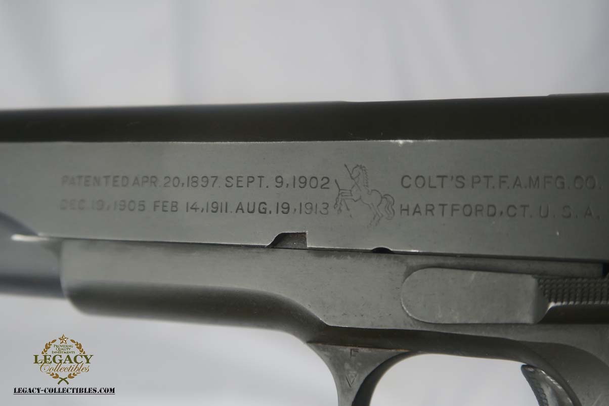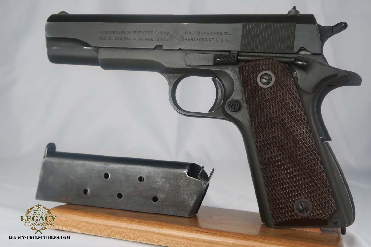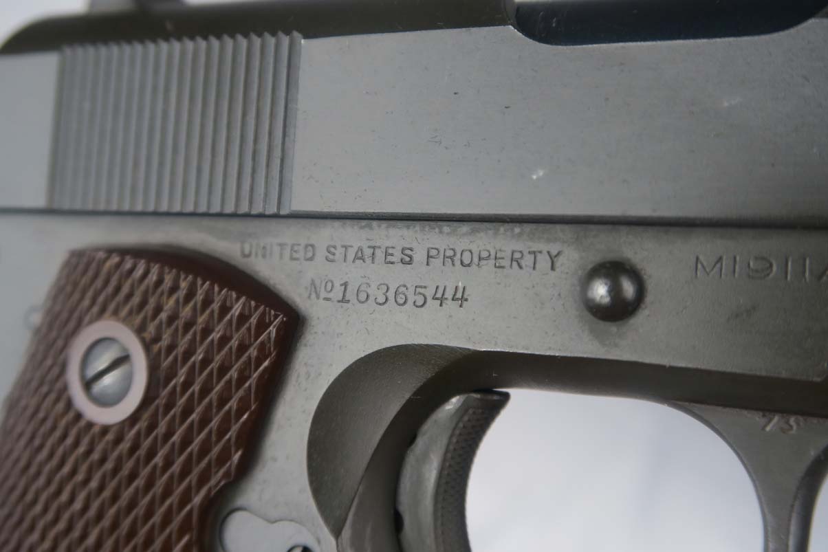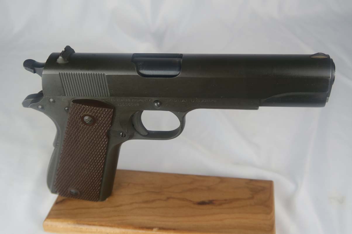 5/18/17 – This is an excellent example of a WW2 era Colt M1911A1, manufactured in 1944 for use by the American Army. The original finish rates at 98+%, with only minor slide wear and a beautiful front strap. The gun has the correct Colt barrel, and is properly proofed (G.H.D. inspector proof, P on slide and frame). Period correct grips and magazine, which is marked ‘S’ on the lip. Bore is minty.