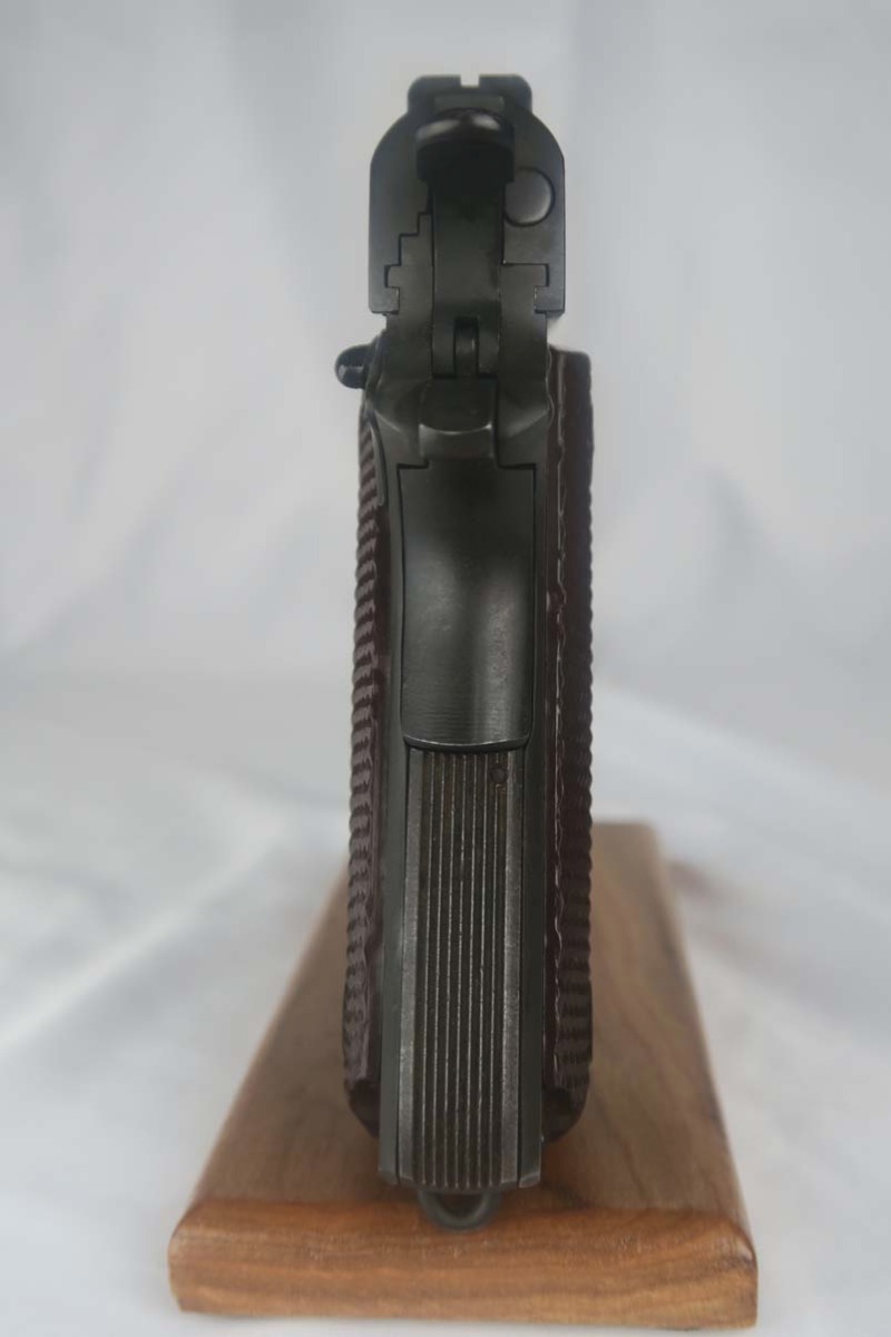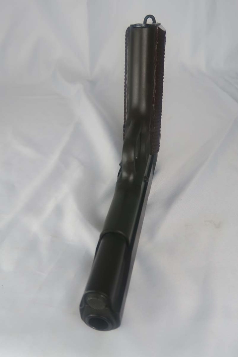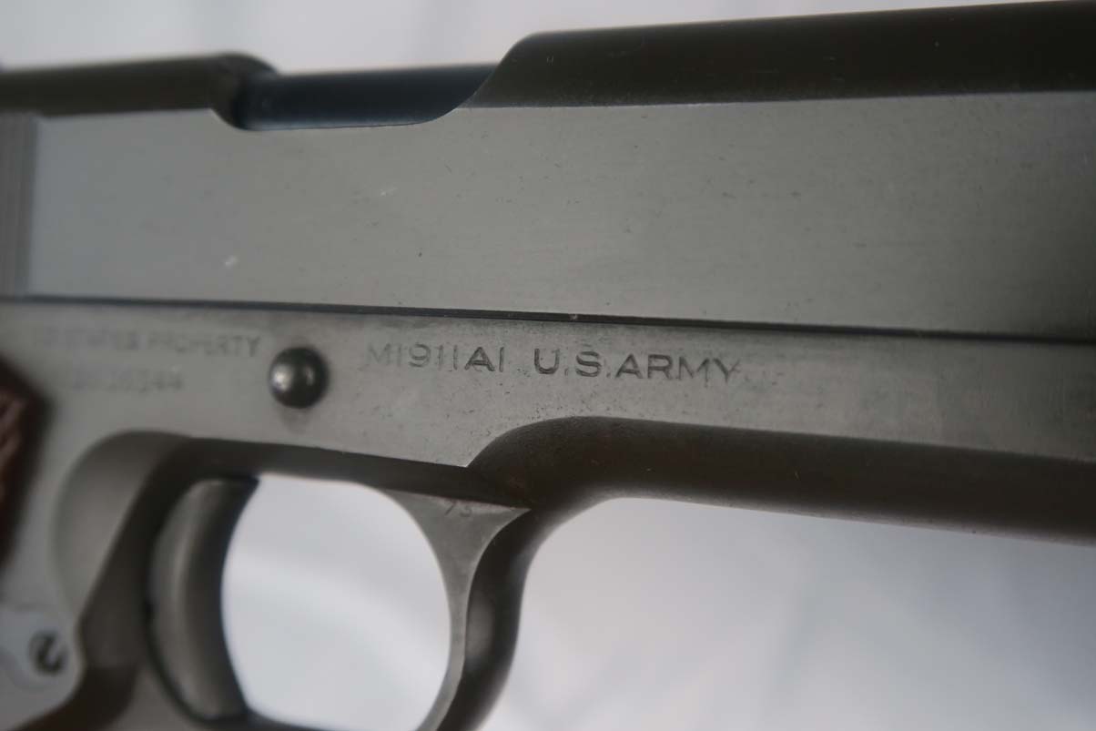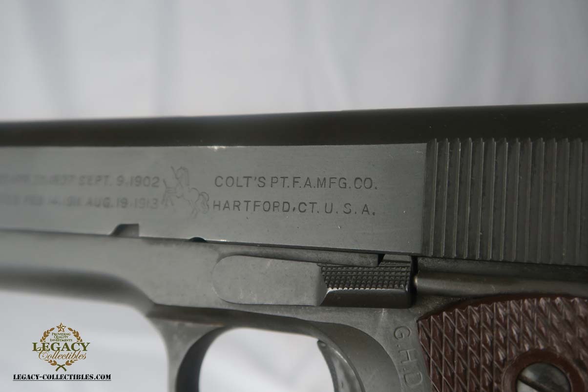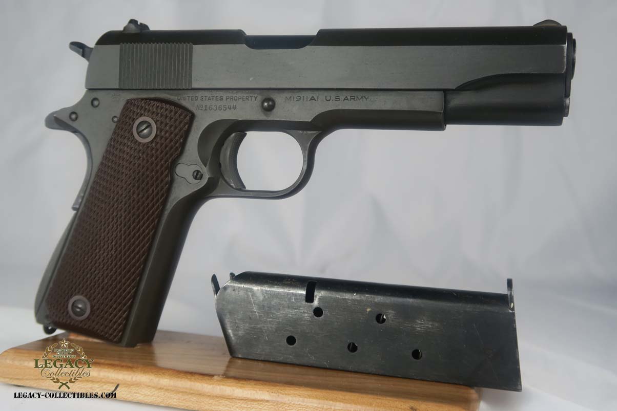 5/18/17 – This is an excellent example of a WW2 era Colt M1911A1, manufactured in 1944 for use by the American Army. The original finish rates at 98+%, with only minor slide wear and a beautiful front strap. The gun has the correct Colt barrel, and is properly proofed (G.H.D. inspector proof, P on slide and frame). Period correct grips and magazine, which is marked ‘S’ on the lip. Bore is minty.