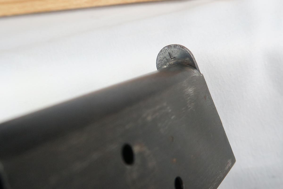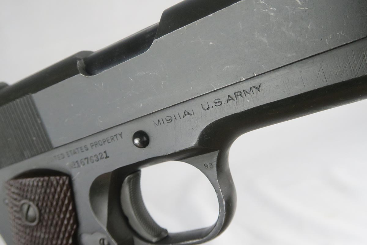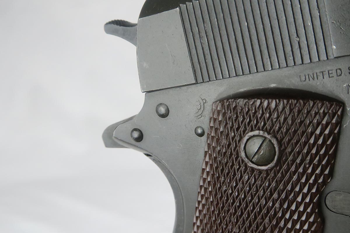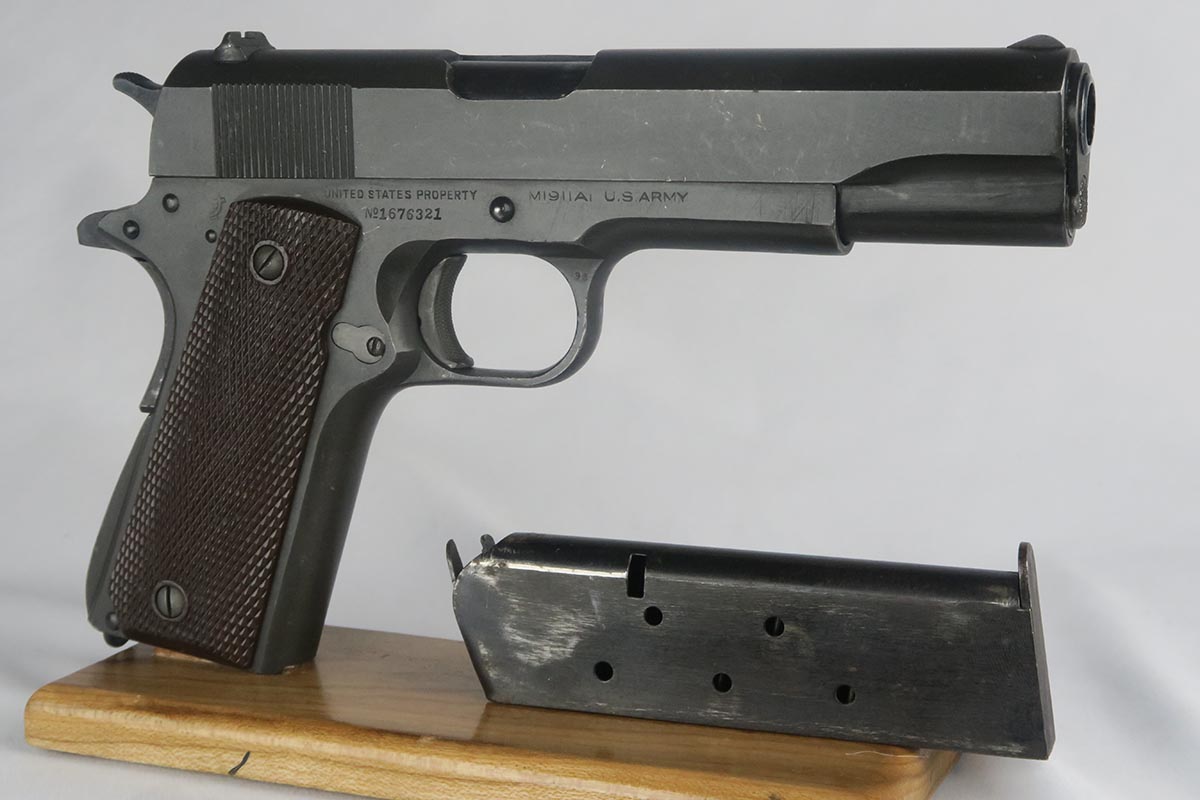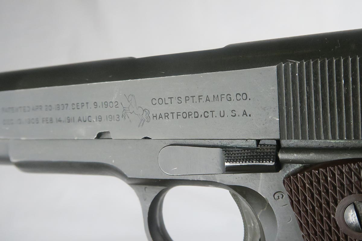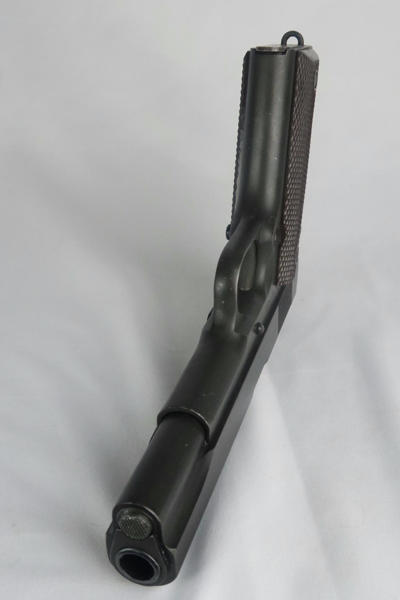 11/7/17 – Here we have an excellent, original Colt M1911A1 from World War II. Manufactured in 1944, it has about 98% original bluing left. There are no notable areas of finish loss, just little spots here or there, or thinning of an edge. Proper inspector marks and P proofs on frame and slide. Nice grips that show only minor use. ‘L’ marked magazine. Excellent bore and the barrel is Colt .45 marked.