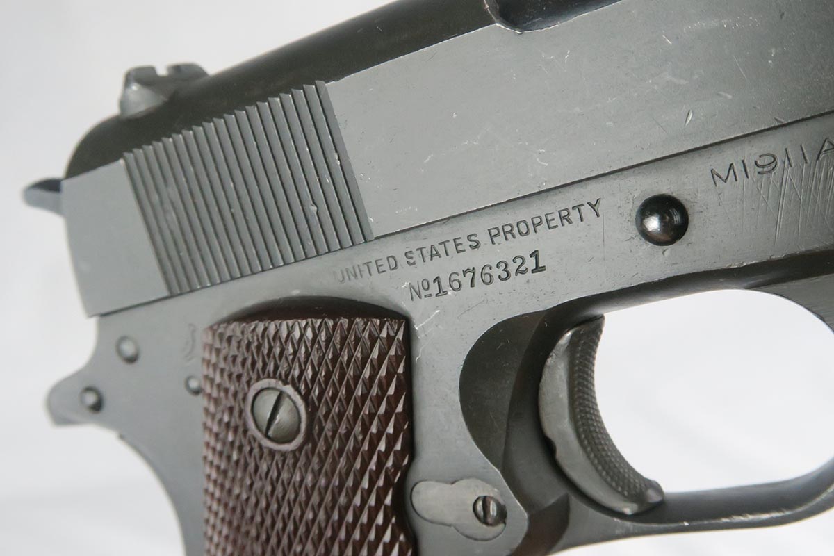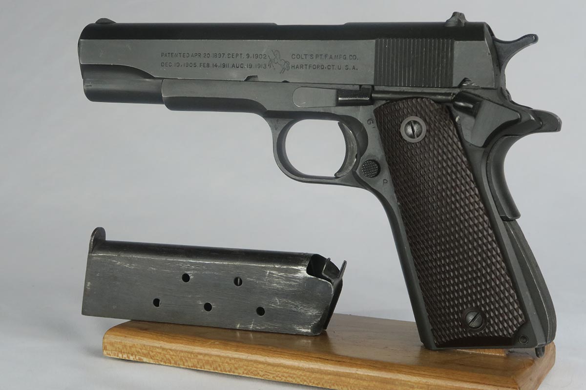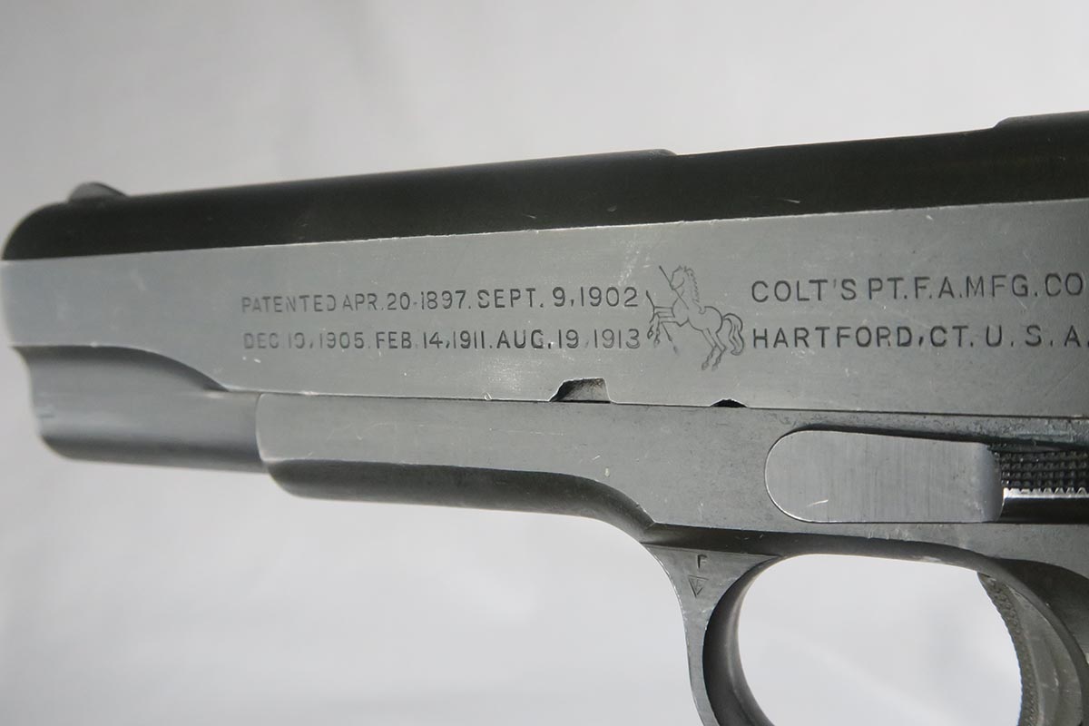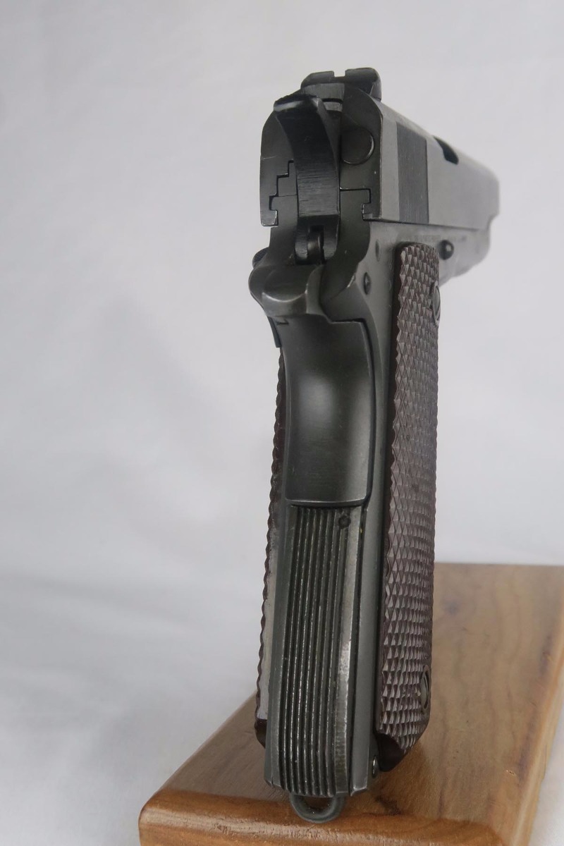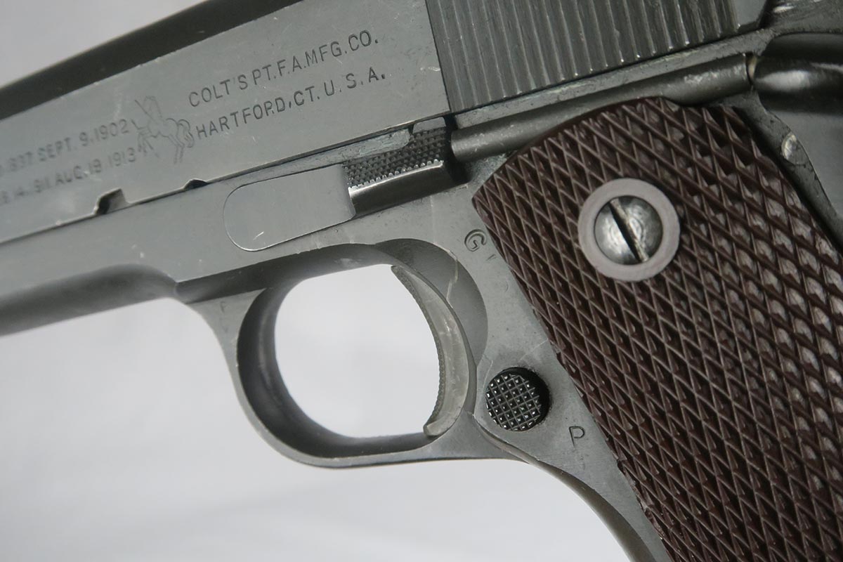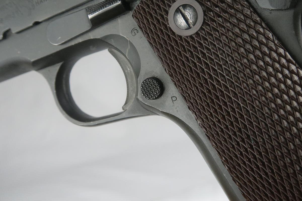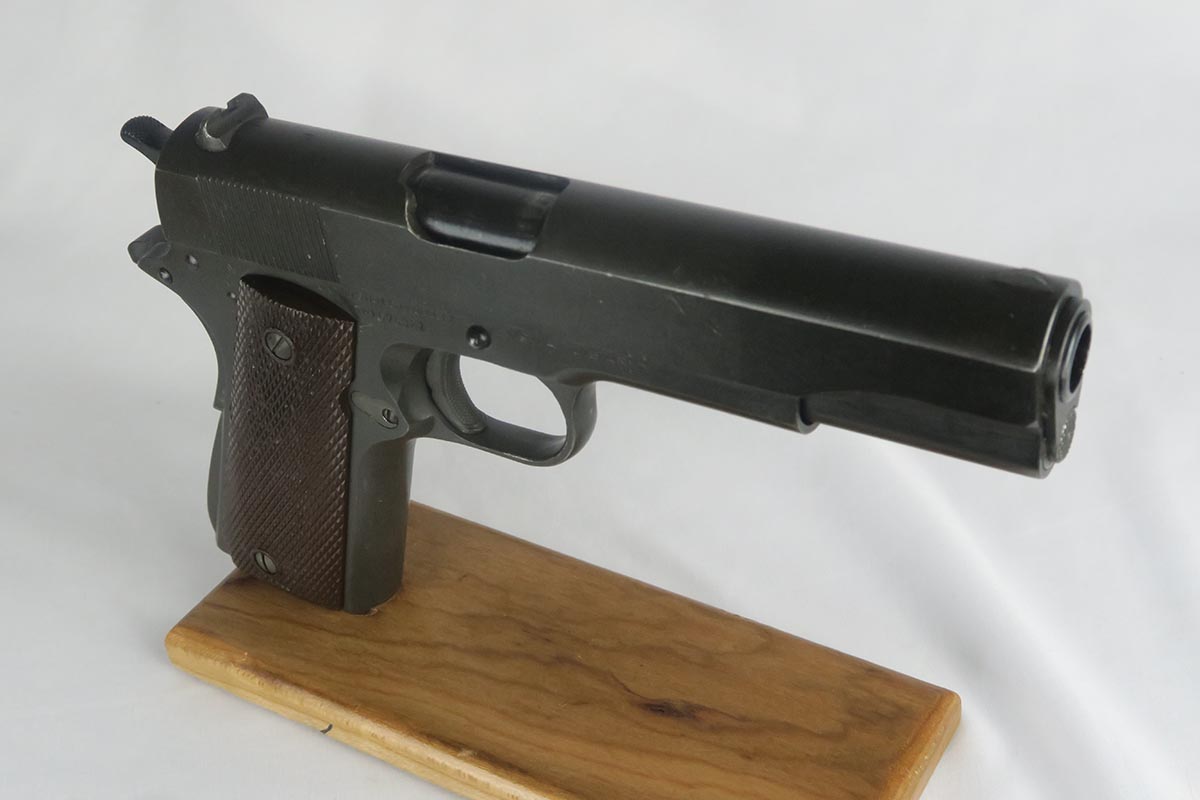 11/7/17 – Here we have an excellent, original Colt M1911A1 from World War II. Manufactured in 1944, it has about 98% original bluing left. There are no notable areas of finish loss, just little spots here or there, or thinning of an edge. Proper inspector marks and P proofs on frame and slide. Nice grips that show only minor use. ‘L’ marked magazine. Excellent bore and the barrel is Colt .45 marked.