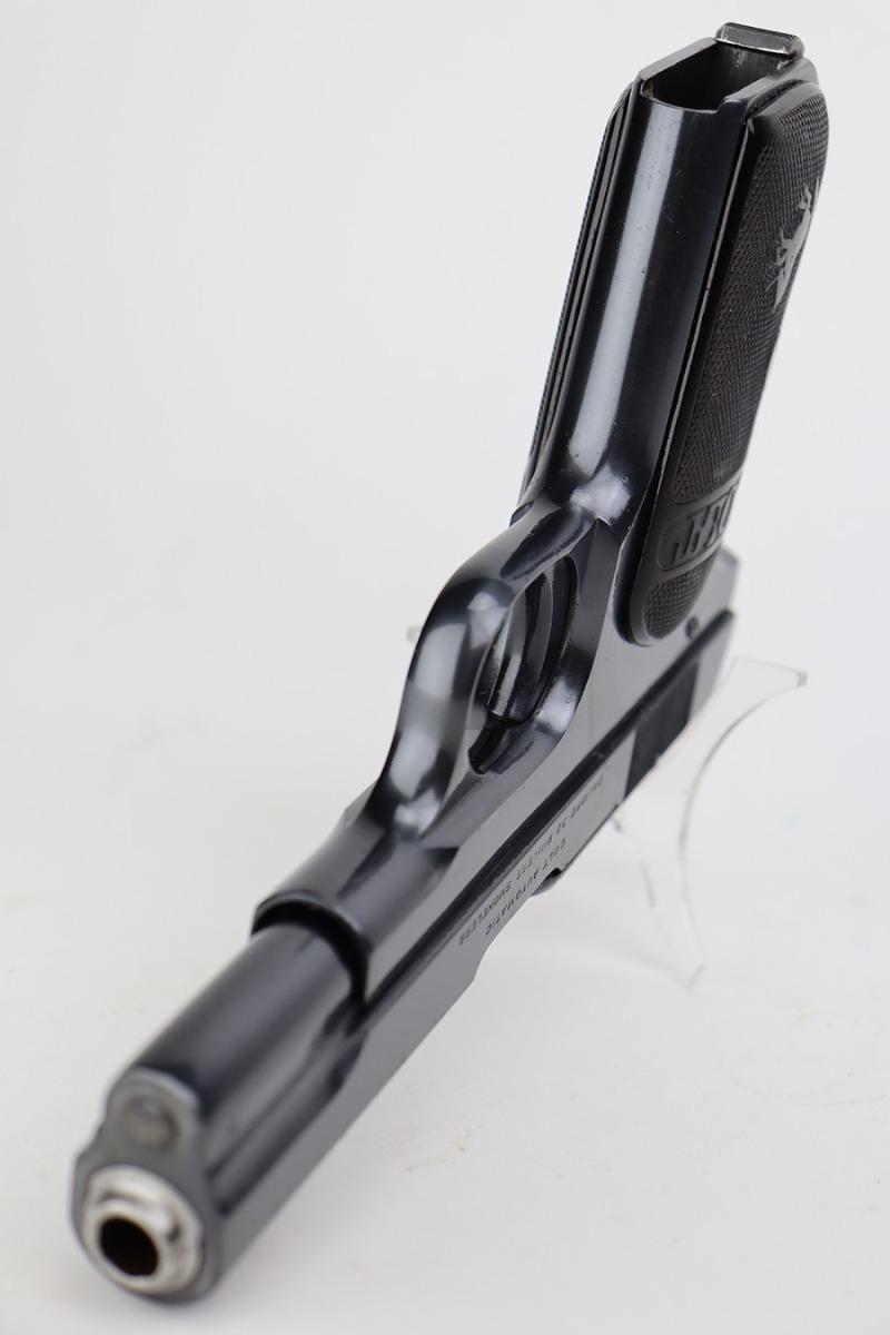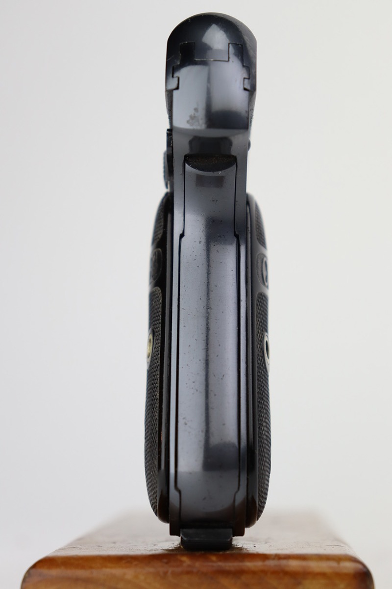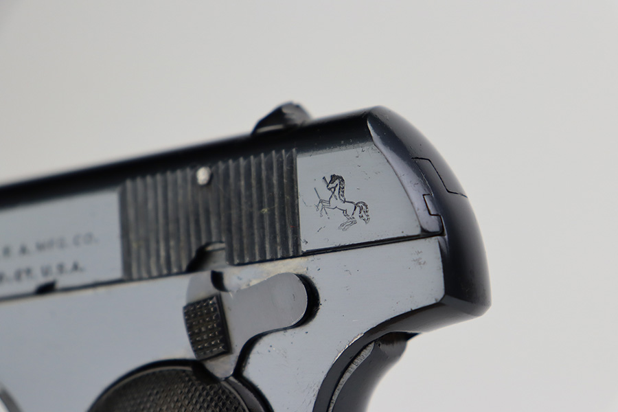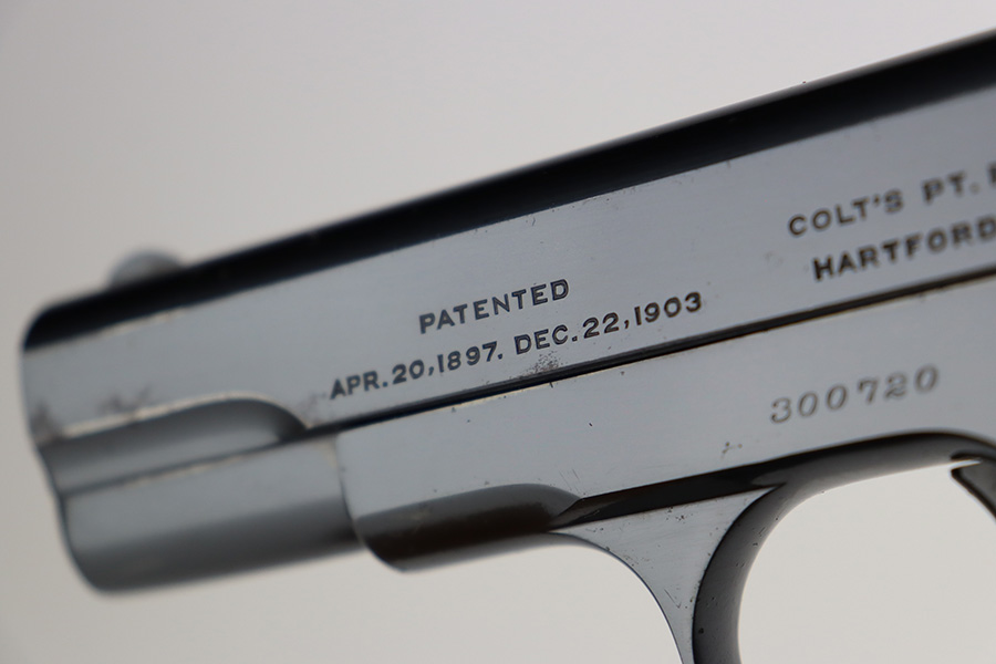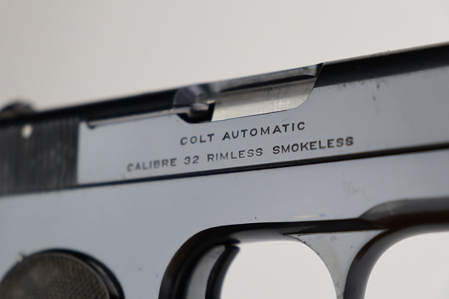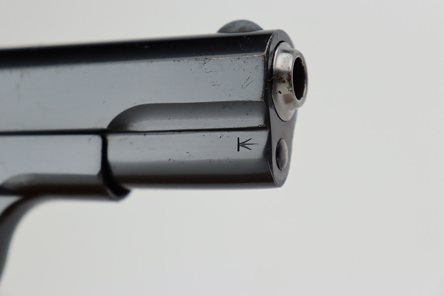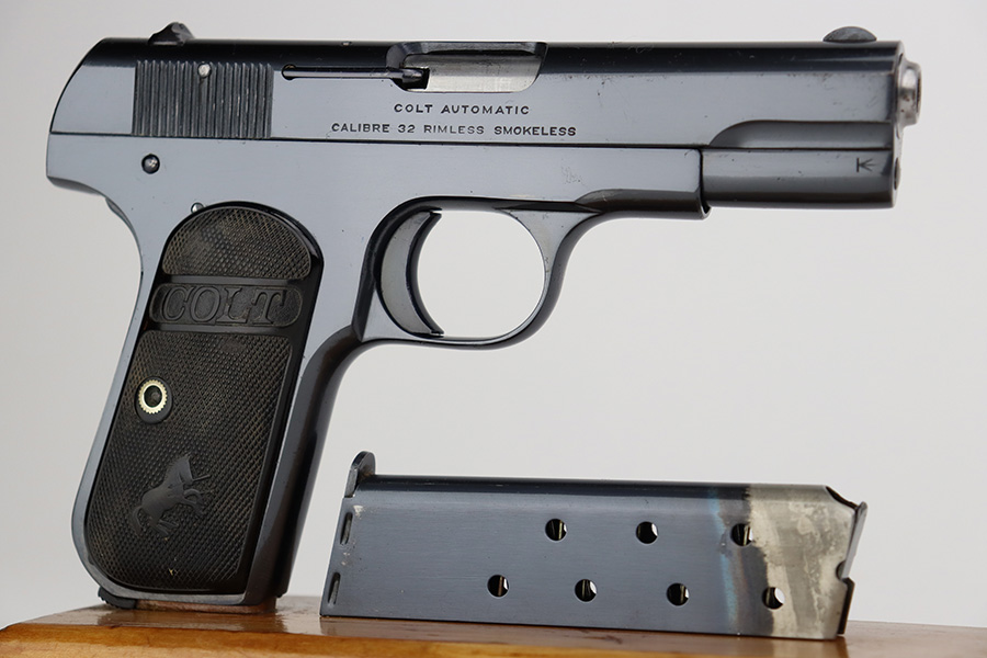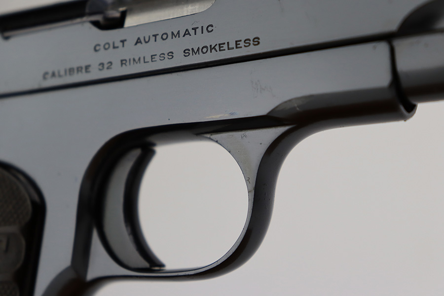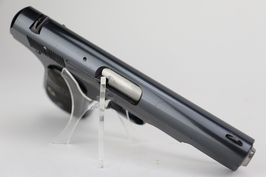 7/3/23 – This is an excellent Colt Model 1903 from 1919. The original blue shows very little wear, just a patch of pitting on the left side of the muzzle and a bit of pinpricking on the high edge of the right side slide. Bore is shiny with strong rifling but there are some small pits throughout. Excellent hard rubber grips with minimal handling wear. Proper, original magazine.