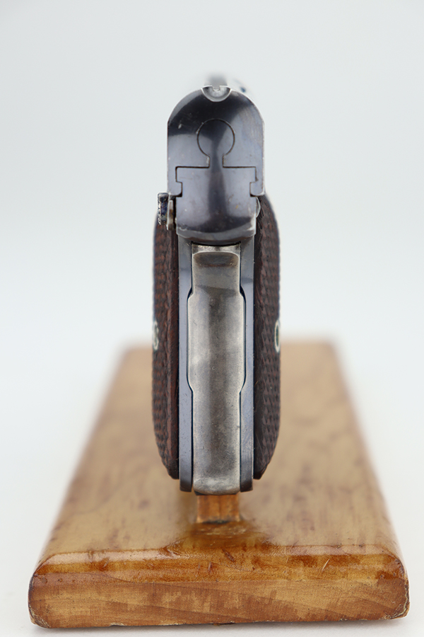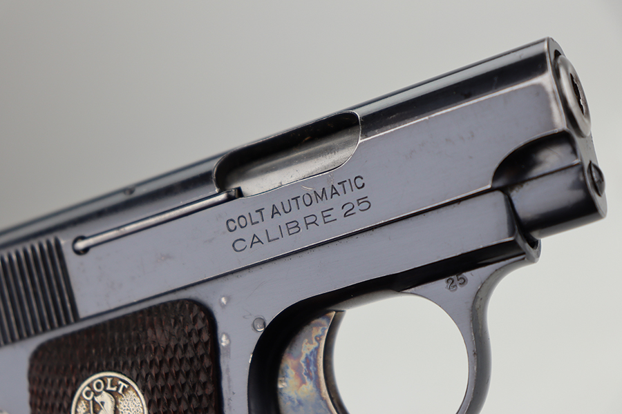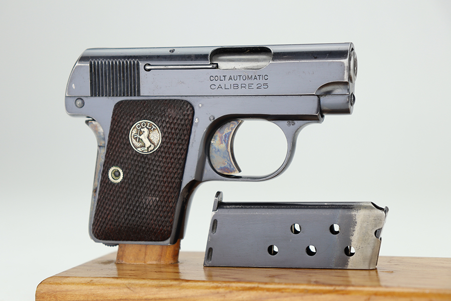 6/19/24 – This is an excellent Colt Model 1908 Vest Pocket pistol, manufactured in 1926 and chambered in .25 ACP. It is all matching and has retained about 96% of its original finish with general high edge wear. Excellent case-hardening on the small parts. Fitted with excellent wood grips and comes with one proper magazine. Excellent bore with great rifling.