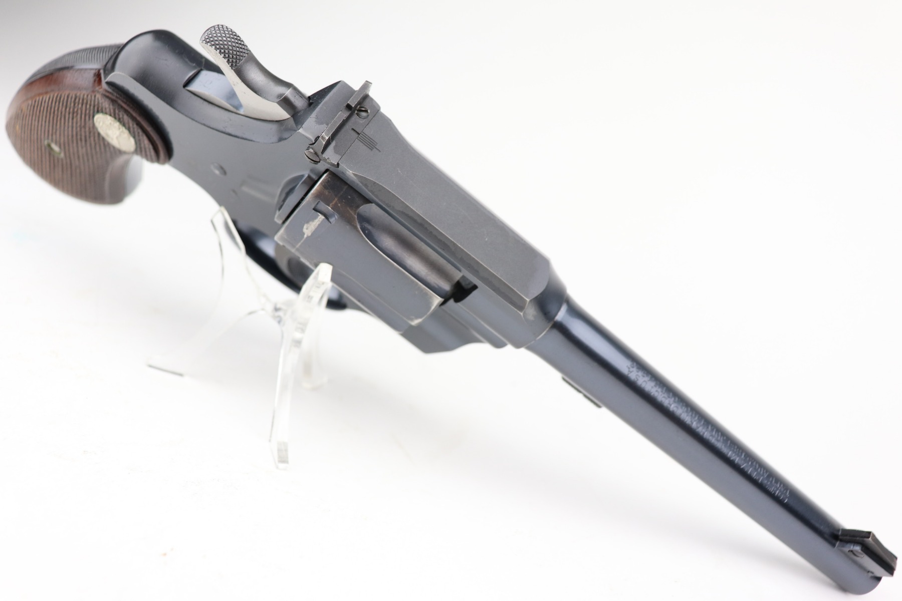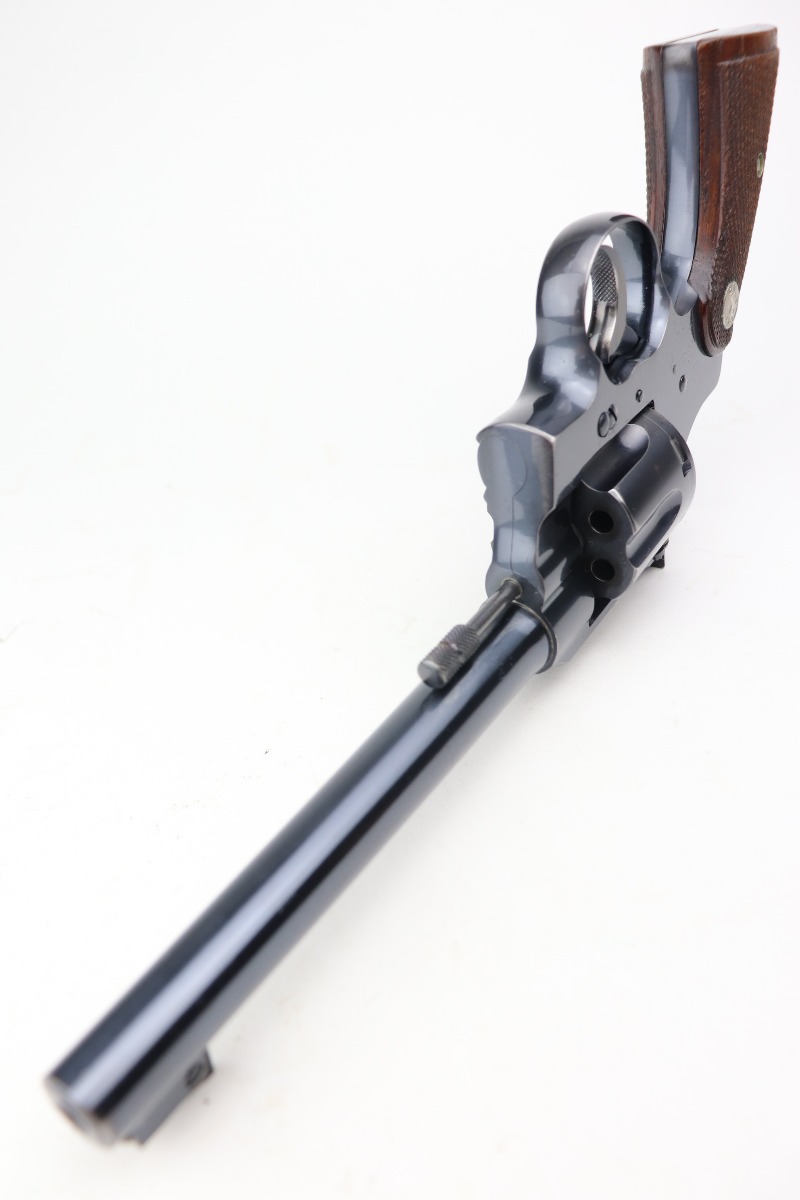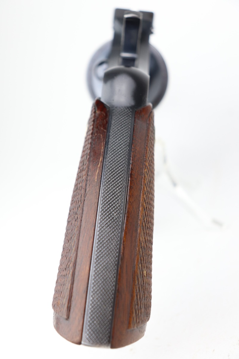 3/1/21 – This is an excellent example of a Colt Officers Model Target Revolver, chambered in .22 LR. It was manufactured in 1941. It is all matching and in excellent condition, retaining about 96% of its original bluing. There is wear around the muzzle, high edges of the cylinder, and at the base of the front strap. Light roll mark on the cylinder. The cylinder is tight and the action is smooth. Excellent wood grips. The bore is mint. 6 inch barrel.