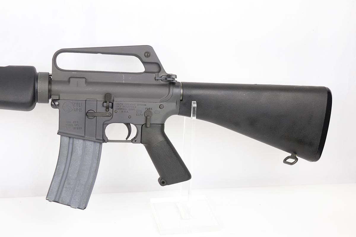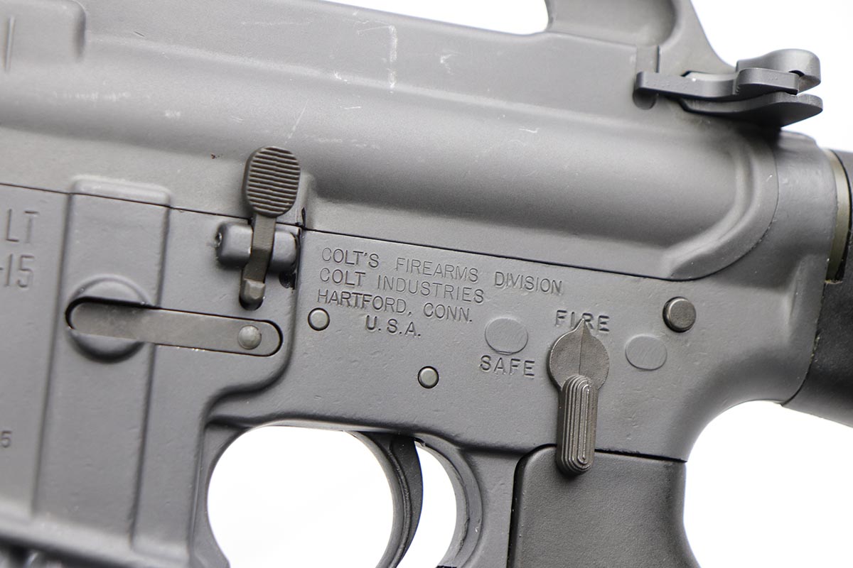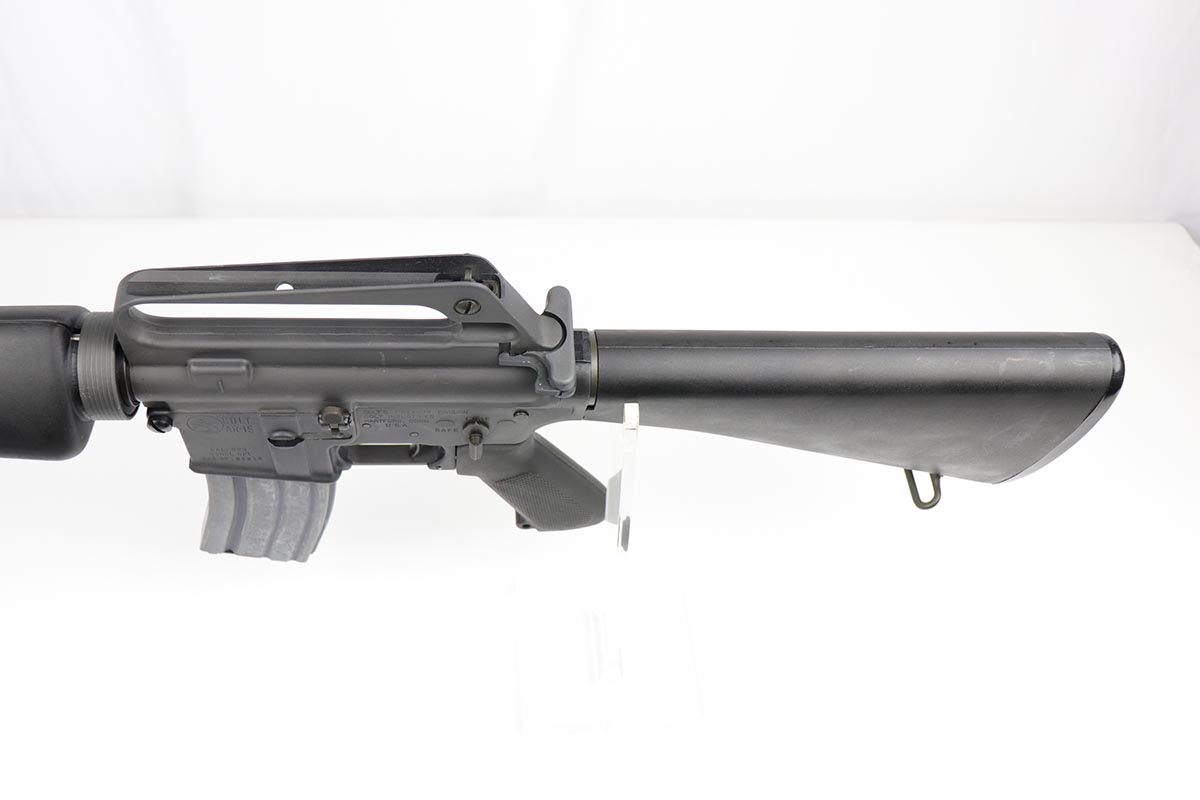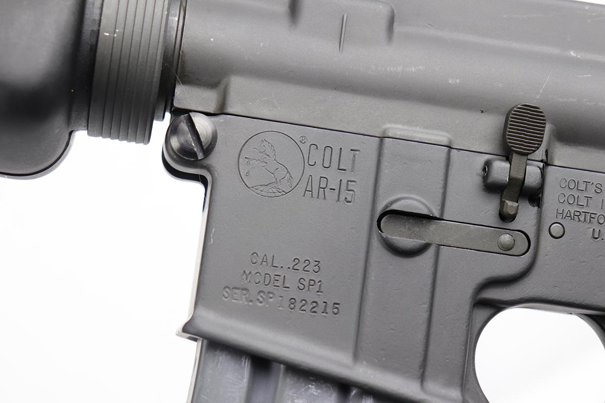 1/15/20 – This is an excellent example of a pre-ban Colt SP1, made in the 1980s, and marked AR-15 on receiver. There are a few minor scuff marks on the left side of the upper, but minimal signs of use otherwise. Minty bore and terrific stock. Triangular handguard. Colt marked magazine.