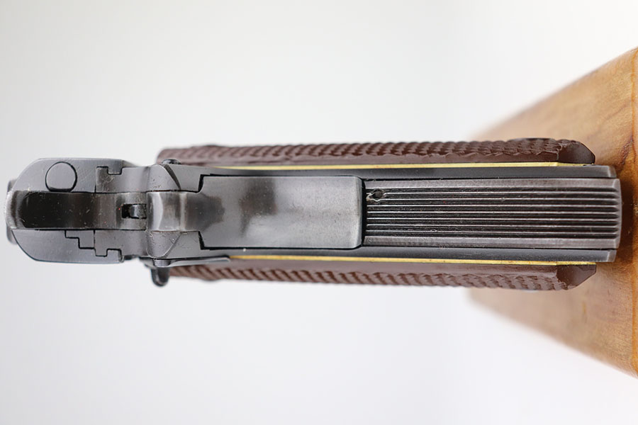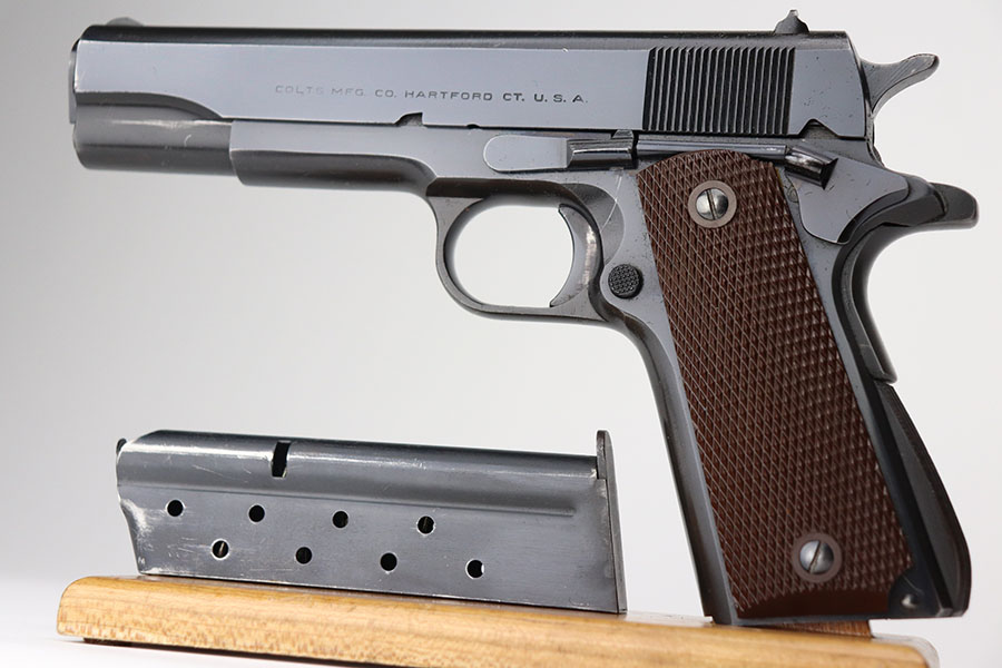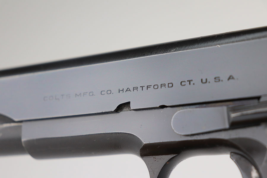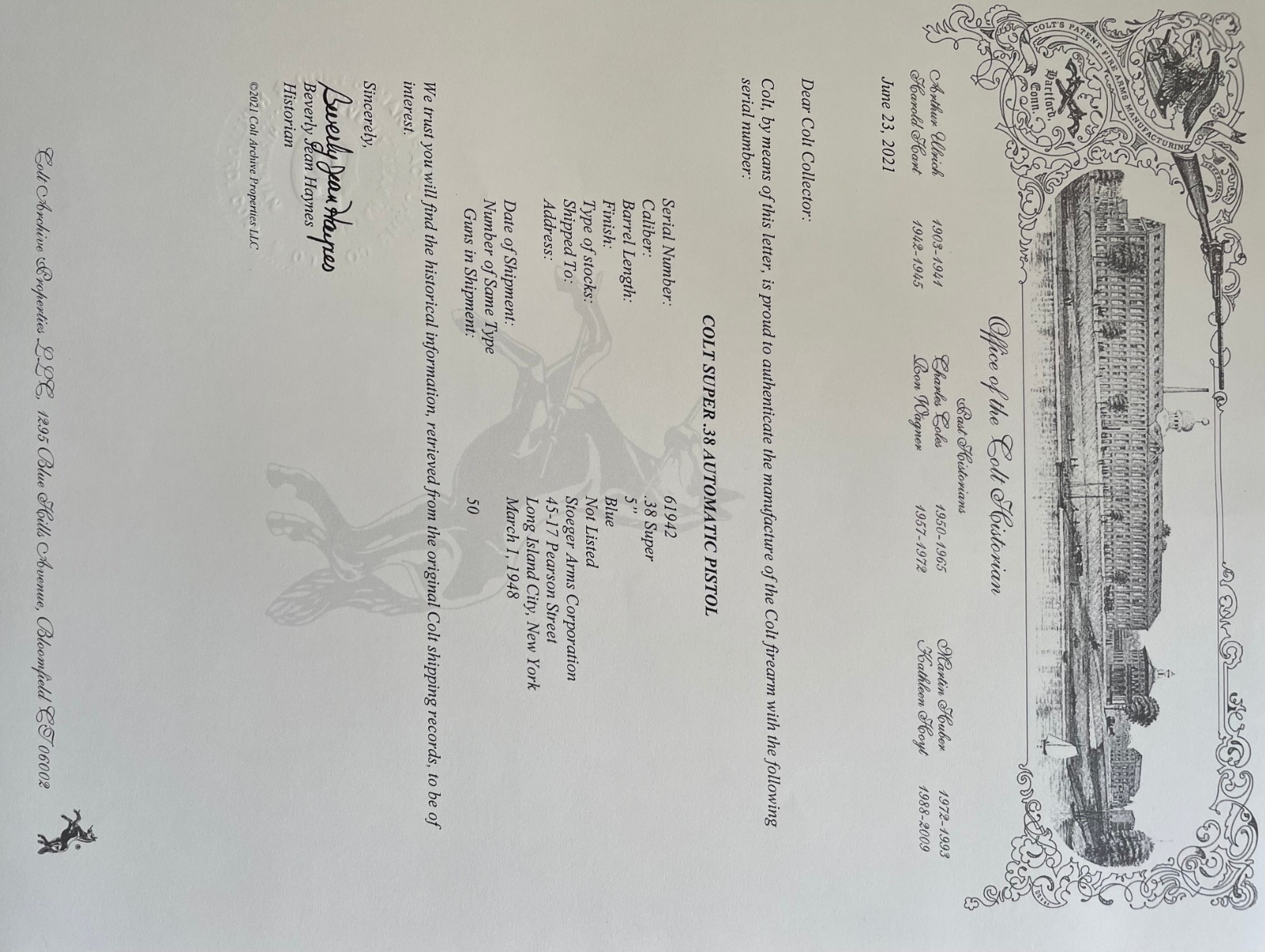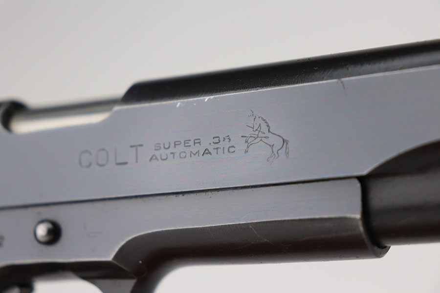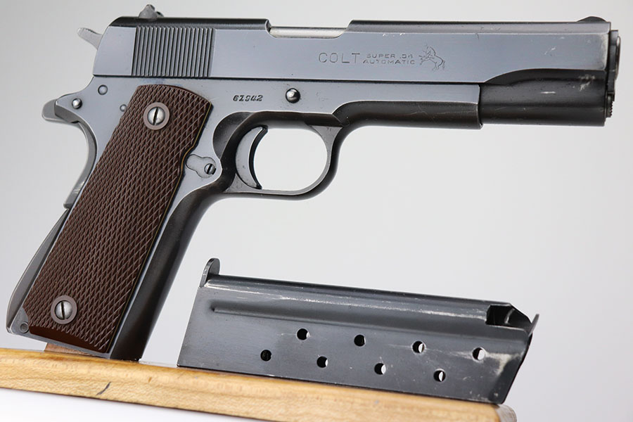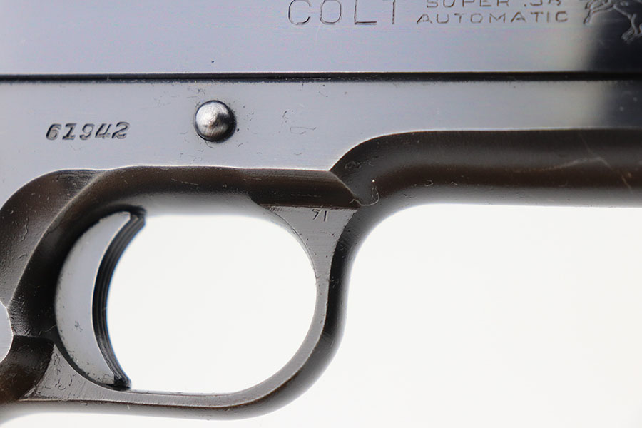 9/13/22 – This is a somewhat hard-to-find Colt Super .38 from 1948. It’s original and correct with 97% of the blue remaining. There’s a little bit of front edge wear on the slide, and minor thinning on the grip safety. Frame also has the common “idiot mark”. Mint bore that looks nearly unfired. Minty grips, too. Original magazine that’s marked COLT SUPER .38 AUTO on the base.