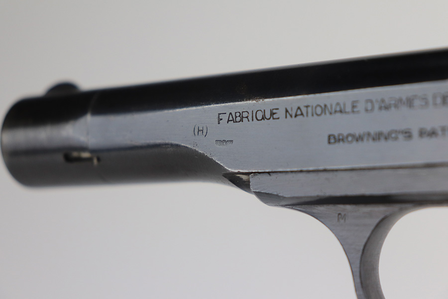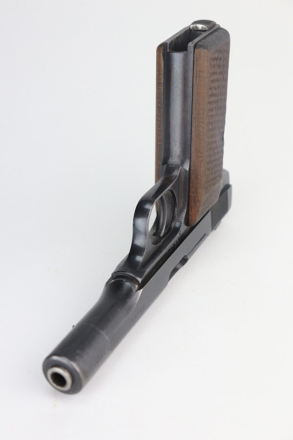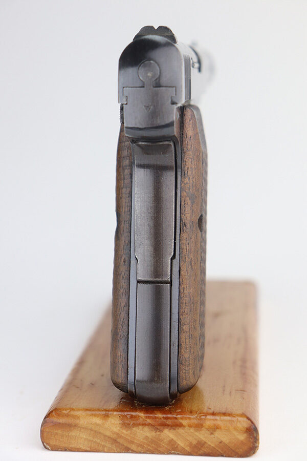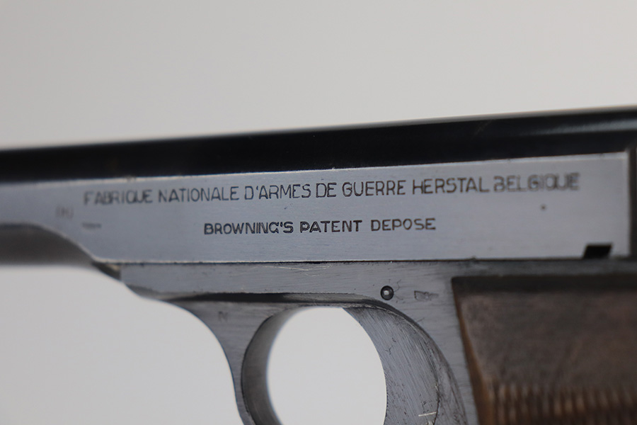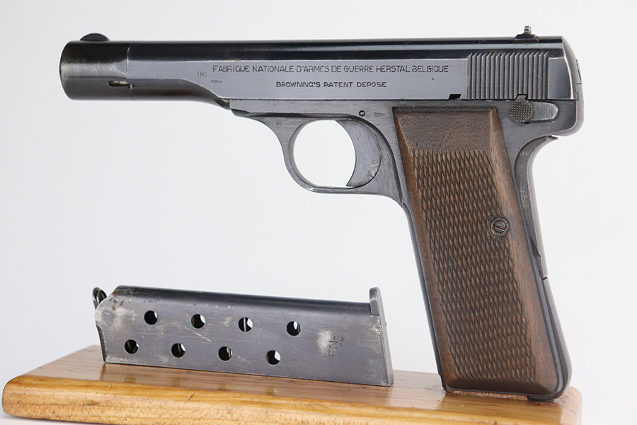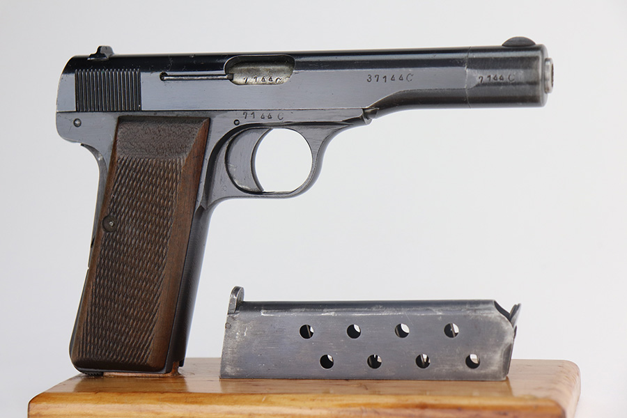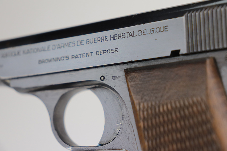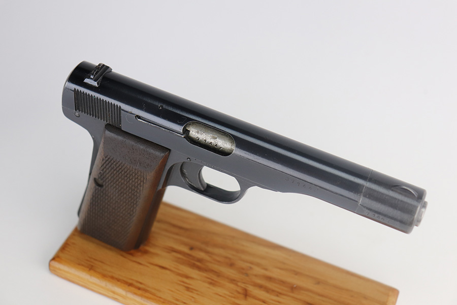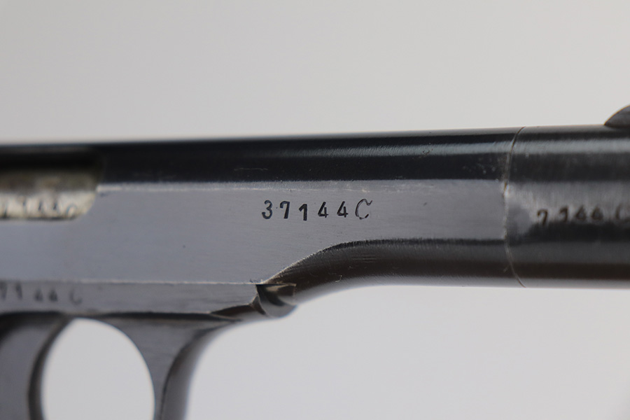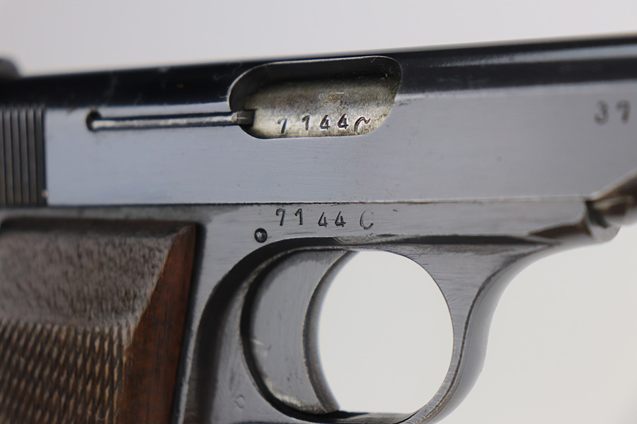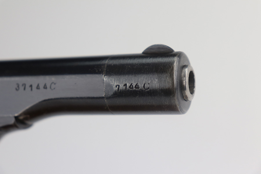 5/25/21 – This is an excellent example of an FN Browning Model 1922 sold in the commercial market during WW2. The gun is matching and has the correct commercial test proofs. It has retained about 96-97% of its original bluing. Very minor wear around the muzzle and high edges of the slide. Very minor thinning on the back strap. Comes with excellent grips and a correct magazine. Excellent bore – shiny with strong rifling.