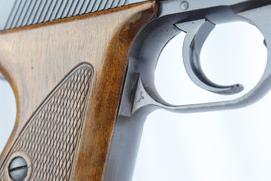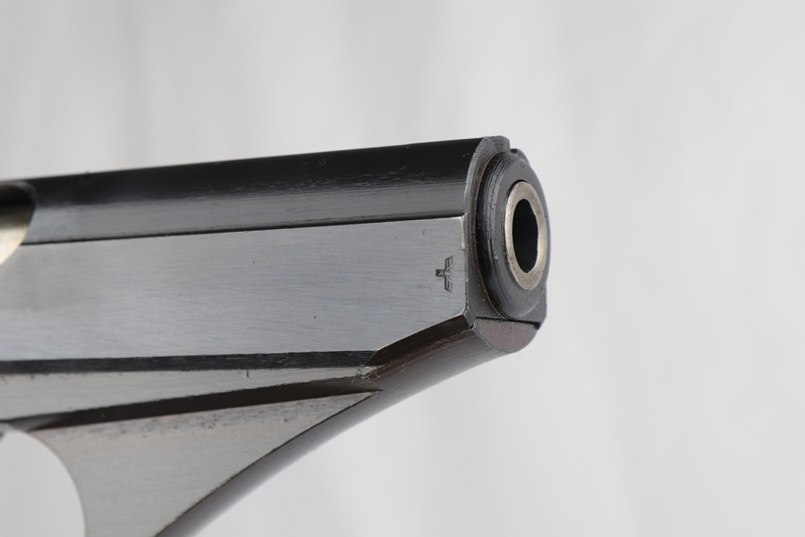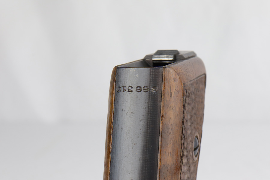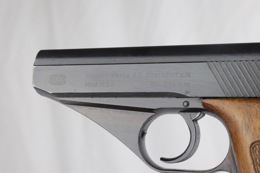 3/5/19 – This is a near-mint commercial Mauser HSc from 1943. Original bluing rates at 99% with only a hint of edge wear, though there is some patina on the straps. Excellent grips with no chips or cracks, and the bore is mint. Half-moon magazine. Comes with an unmarked holster that may be from the time period or shortly after the war.