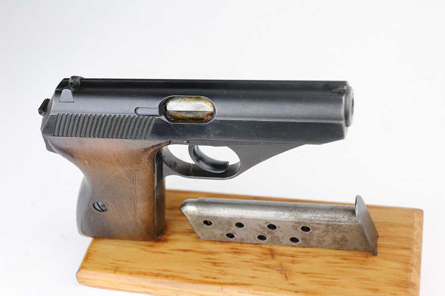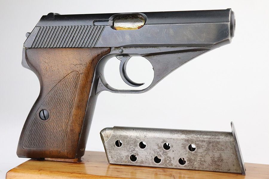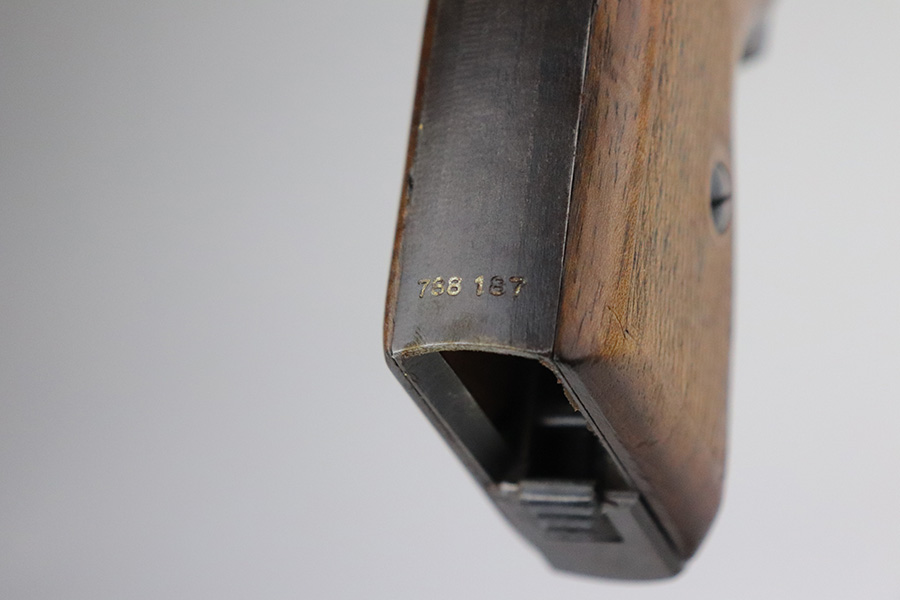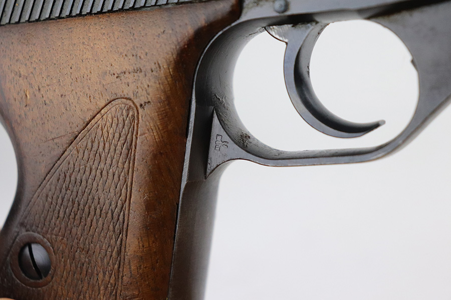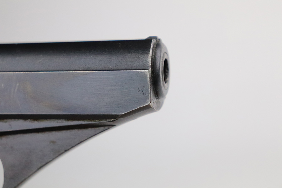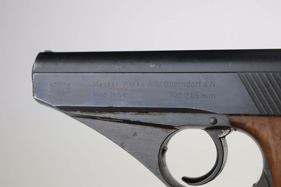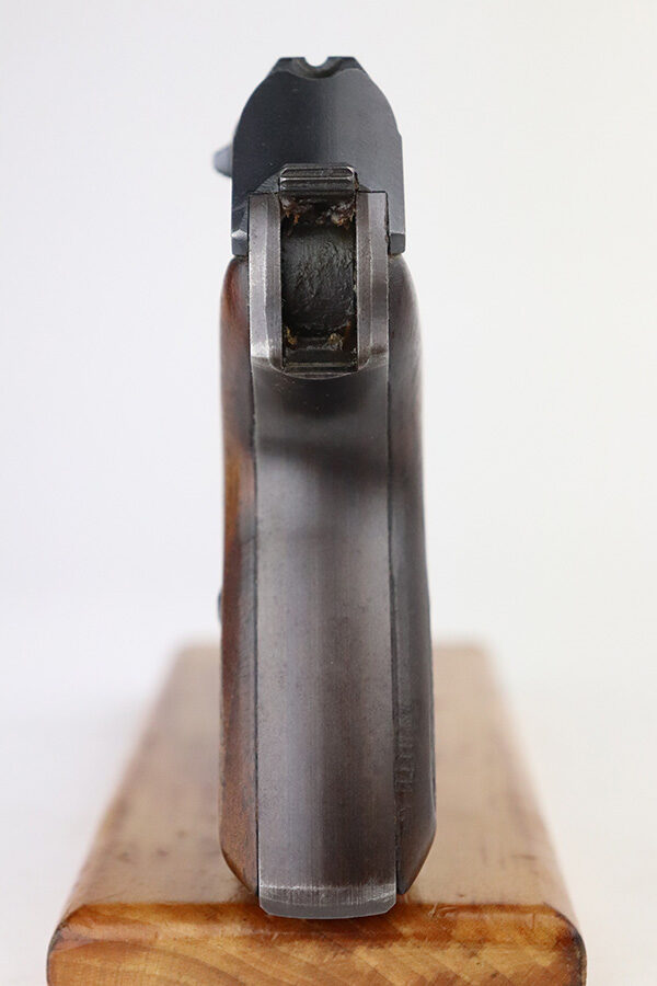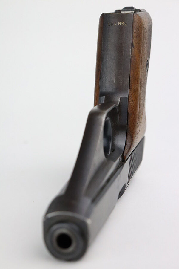 7/15/21 – This is an excellent example of a Mauser HSC sold in the commercial market in 1942. It is all matching and has the proper “Eagle N” proofs. No Waffen military proofs. It has retained about 97% of its bluing. There is very minor thinning and brown patina on the straps. A few very small dots of wear and oxidation here and there on the slide. Comes with nice wood grips and a period-correct magazine. Mint bore.