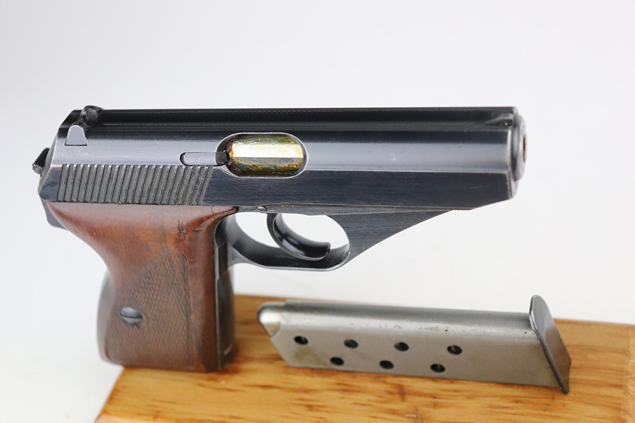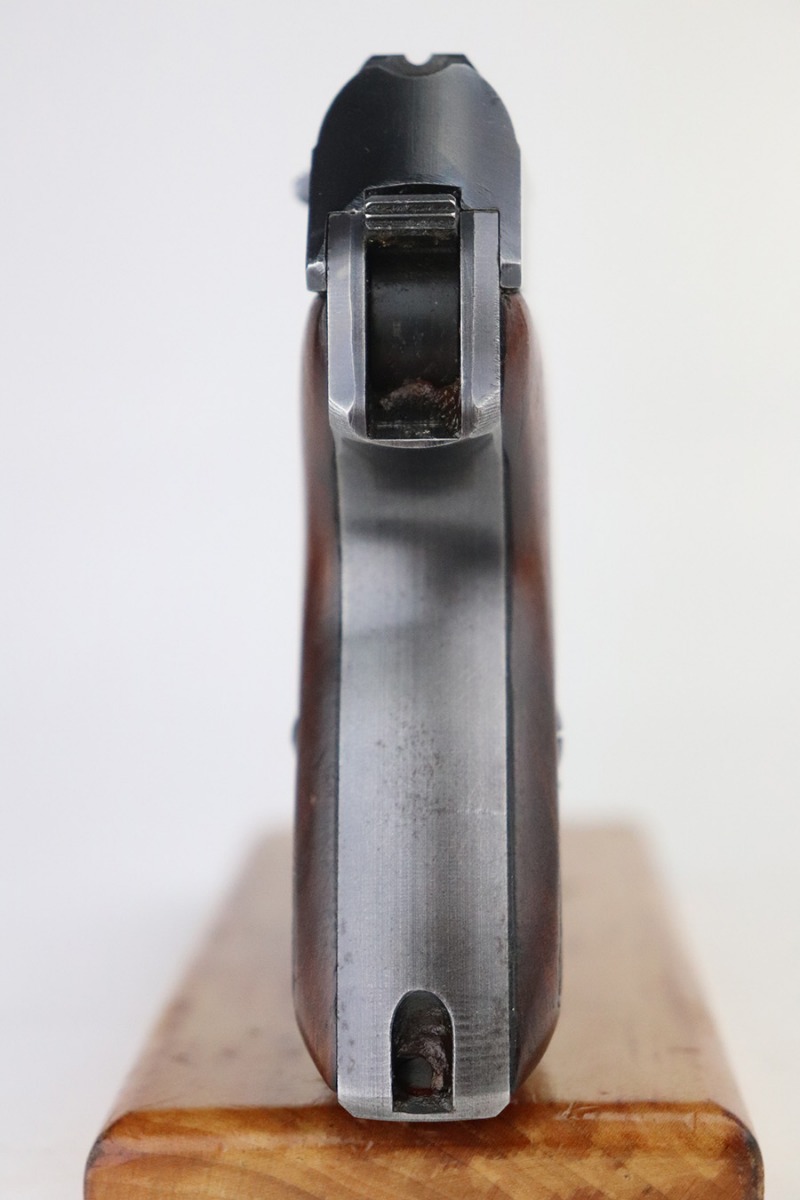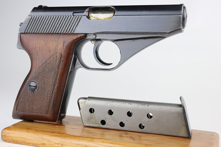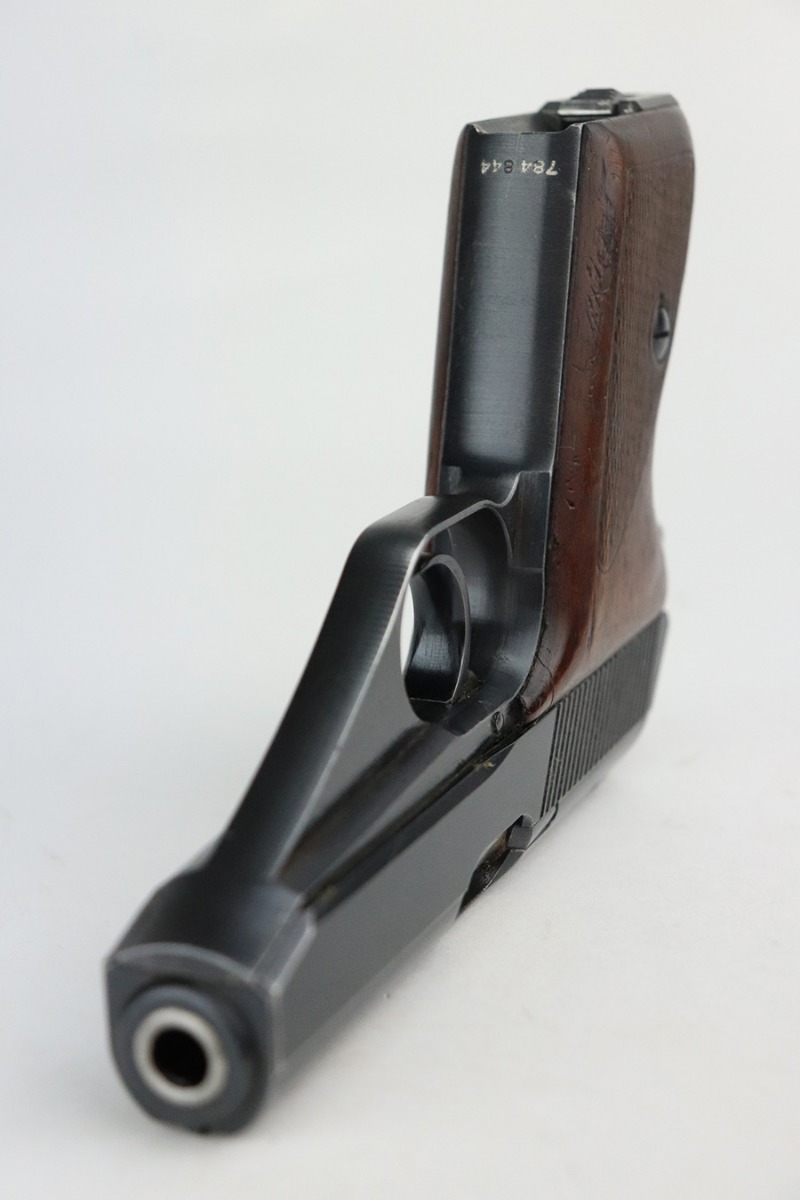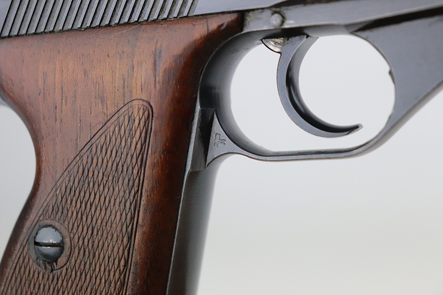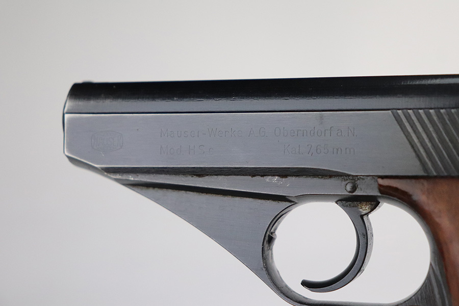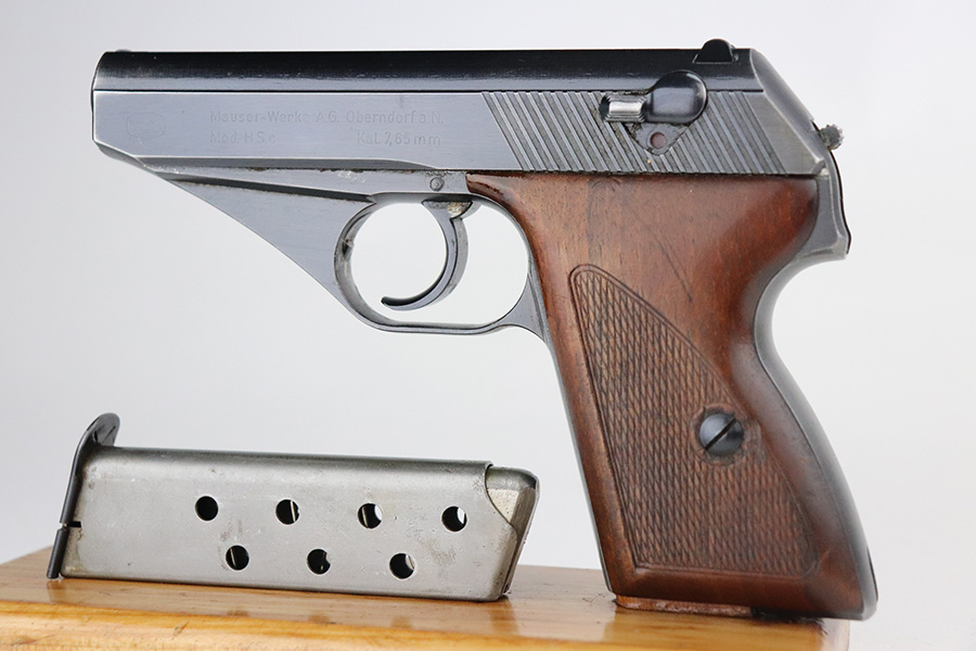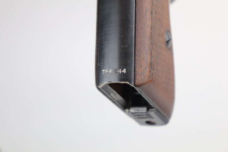 7/29/21 – This is an excellent example of a Mauser HSC sold in the commercial market in 1942. The gun is all matching, lacks military proofs, and has the proper “Eagle N” firing proofs. It has retained about 95% of its original. Most of the finish loss is on the back strap, so the profile views are minty. Very minor wear around the muzzle. Comes with excellent wood grips and a period-correct magazine. Mint bore.