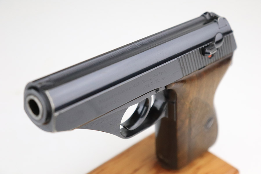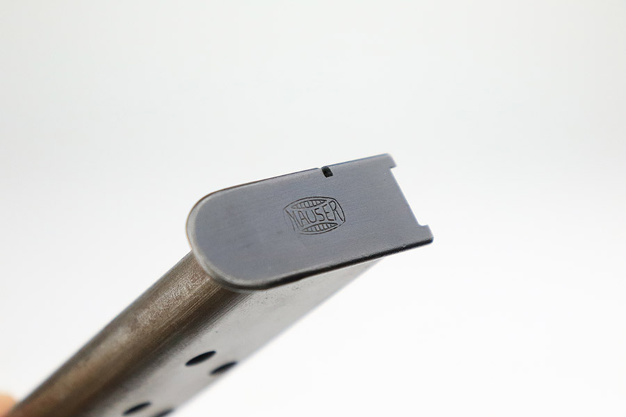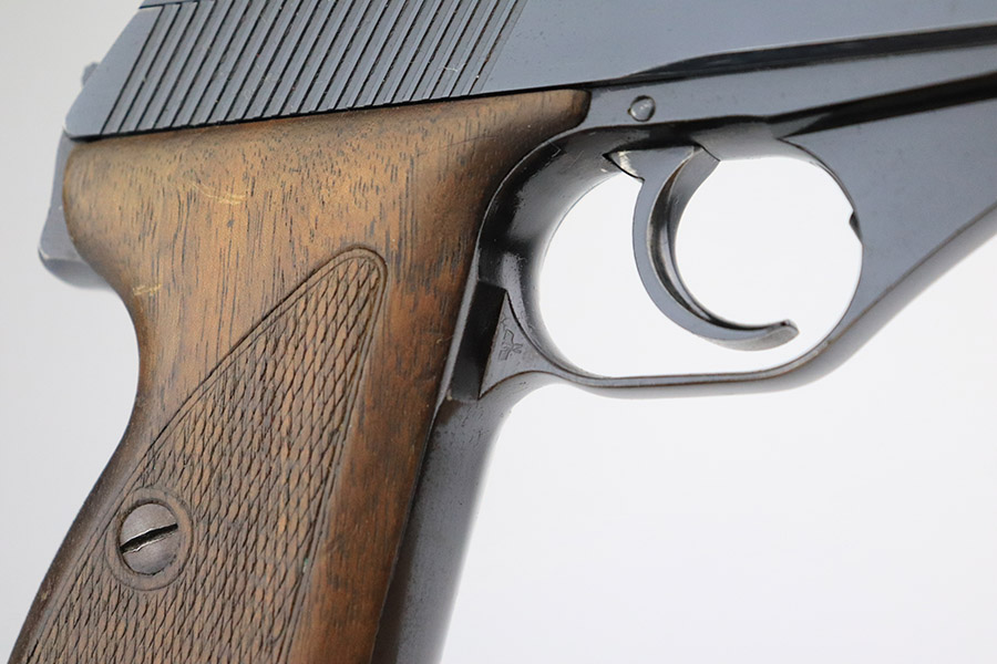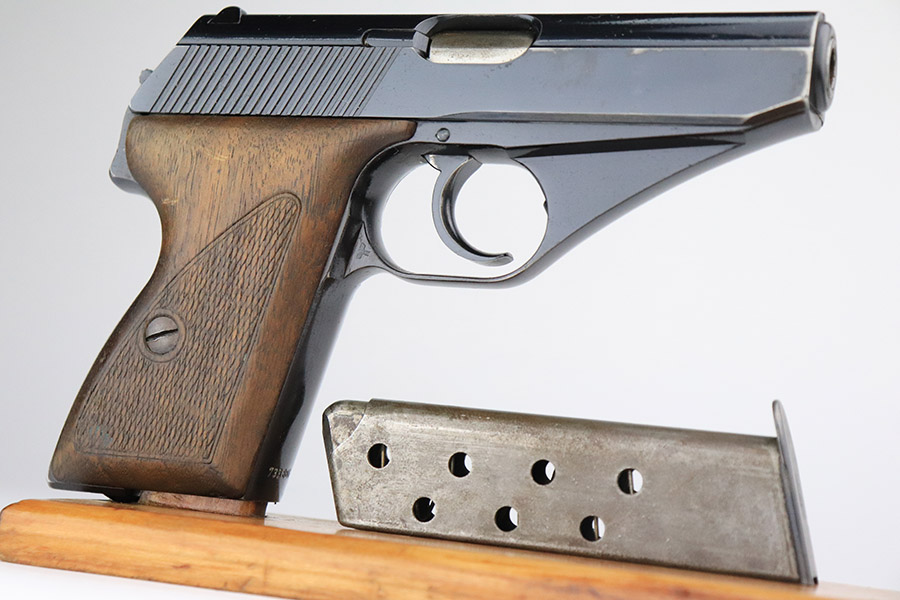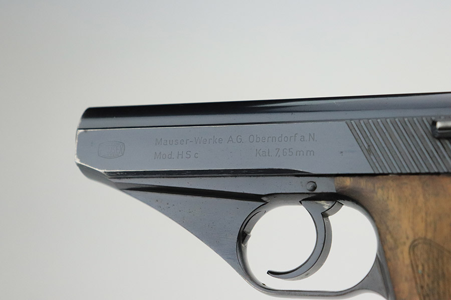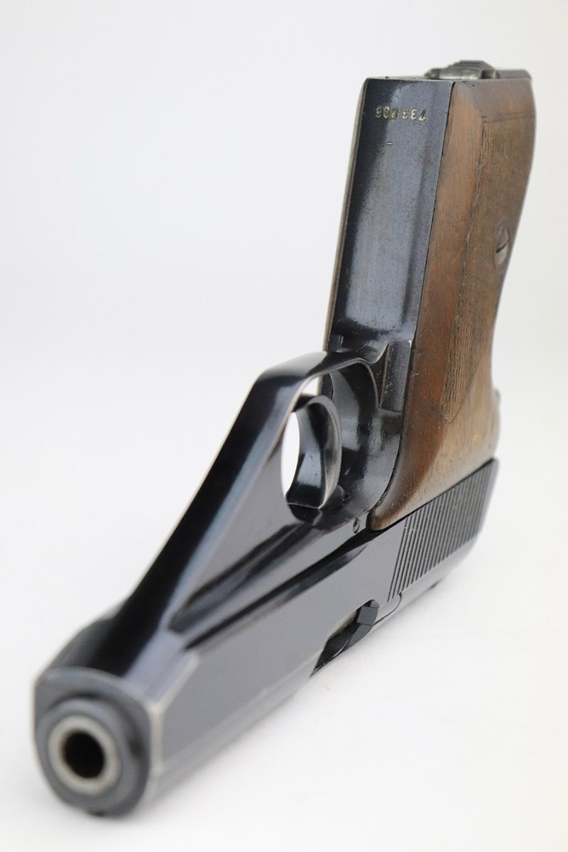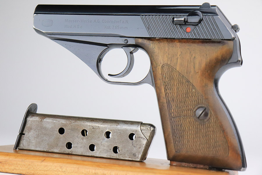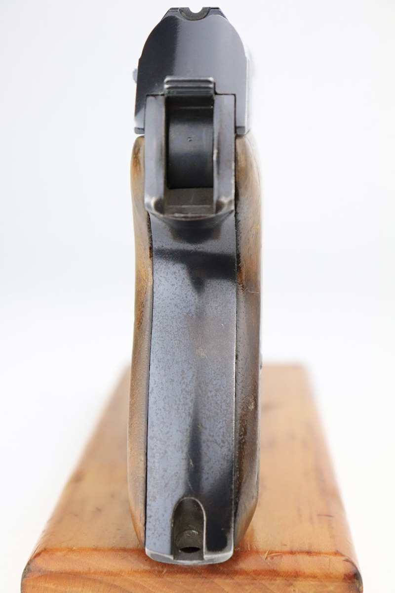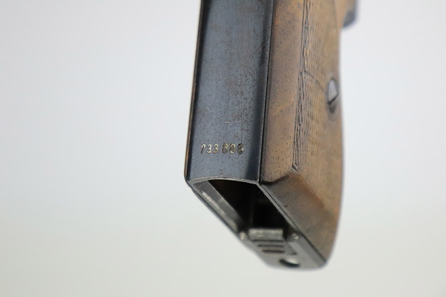 10/27/22 – This is an excellent example of a Mauser HSC sold in the commercial market in 1941. It is all matching and has the proper “Eagle N” commercial proofs. It has retained about 98% of its original high polish finish. There is just very minor wear around the muzzle and an area of very light spotty wear on the right side of the slide. While there is very little actual finish loss, there is spotty freckling on both grip straps. Comes with nice period-correct wood grips and one proper magazine. Mint bore.