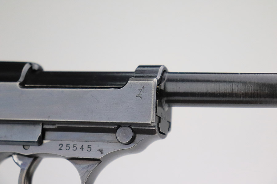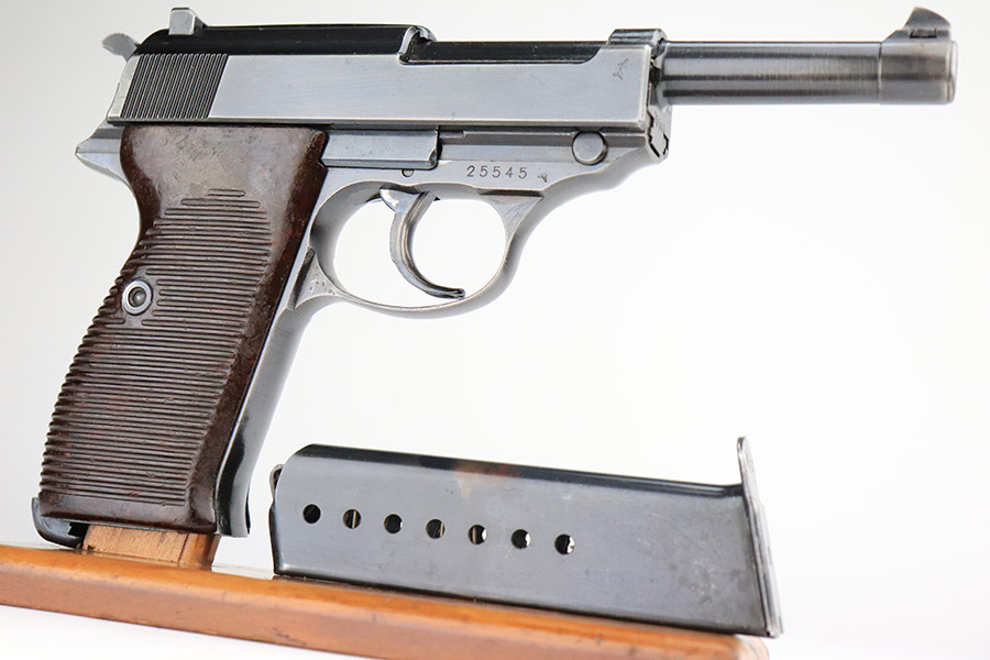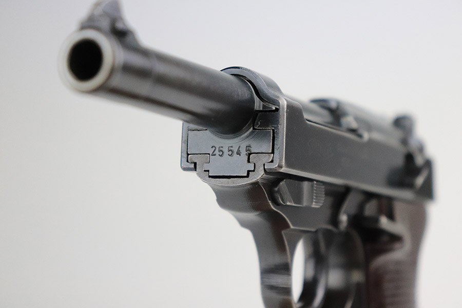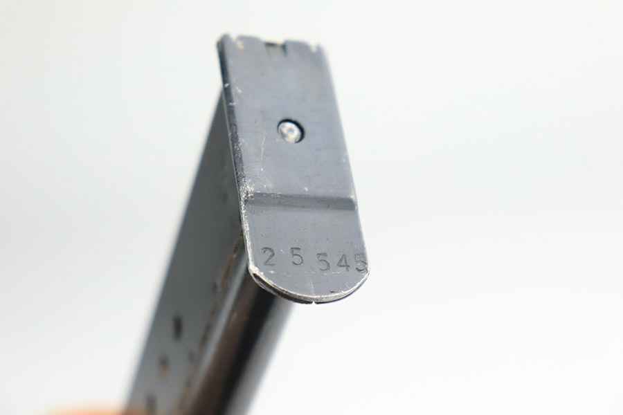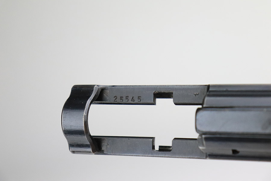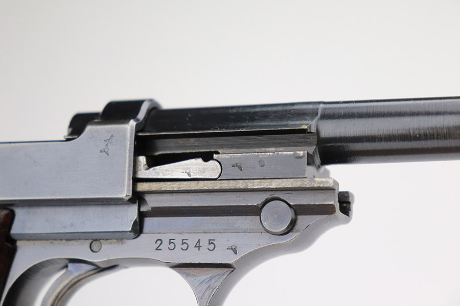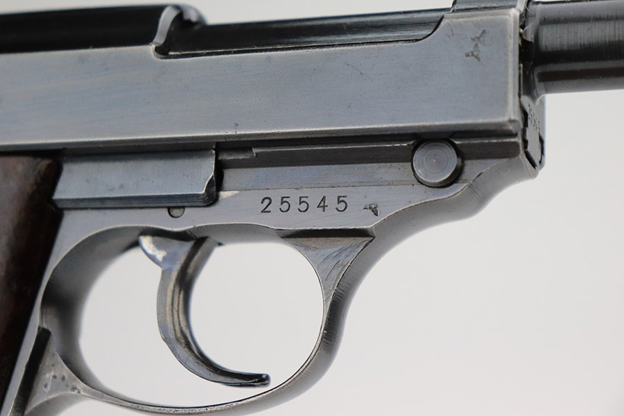 11/7/22 – This is an excellent example of a Walther Mod HP sold in the commercial market during WW2.. It is all matching and has the proper “Eagle N” commercial proofs. It has retained about 97% of its original finish. There is very minor thinning along the barrel and very minor wear around the muzzle and high edges of the slide. Comes with excellent reddish-brown bakelite grips and one magazine that has been force-matched. The bore has good rifling with very minor pin-pricking throughout. De-cocker is functional.