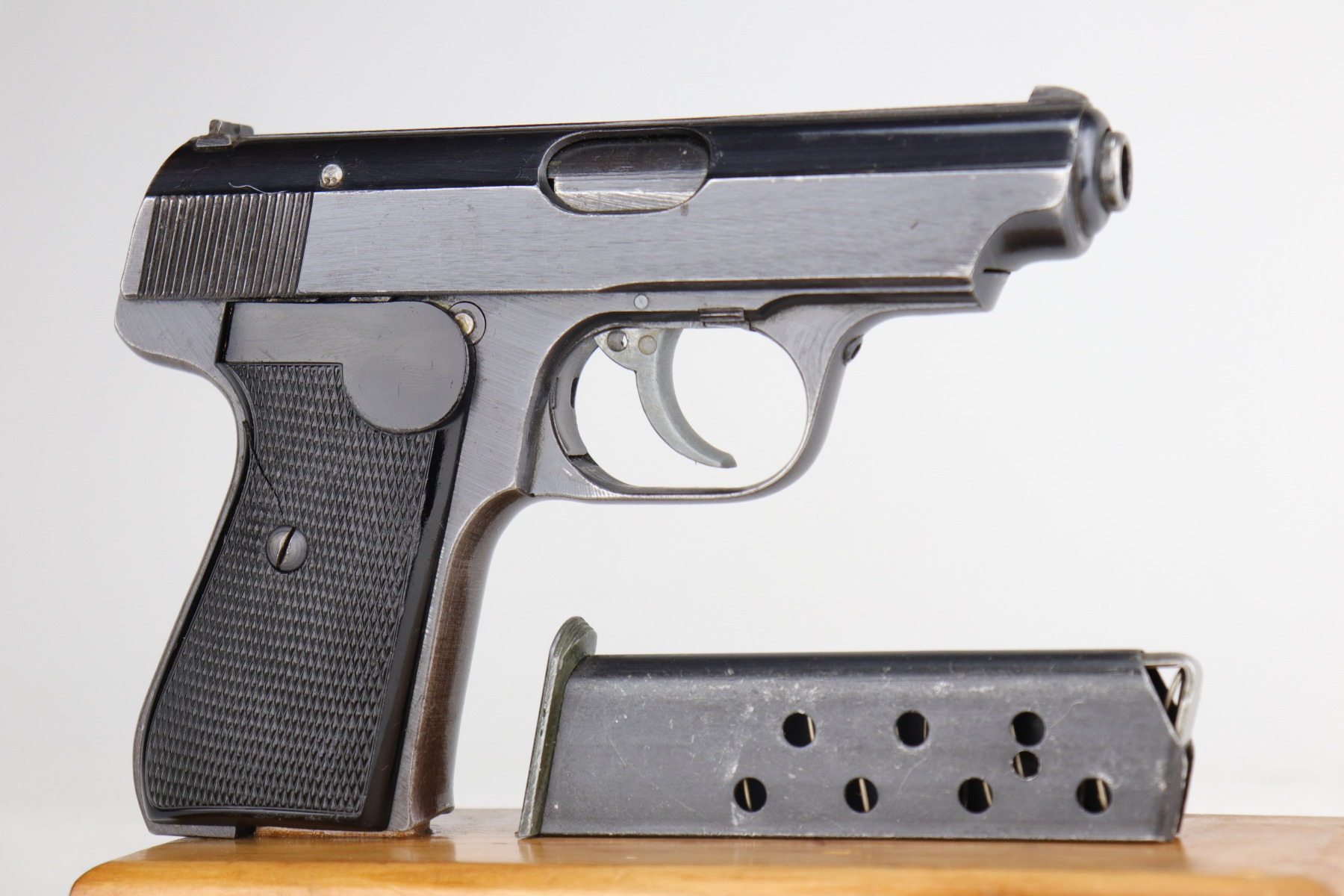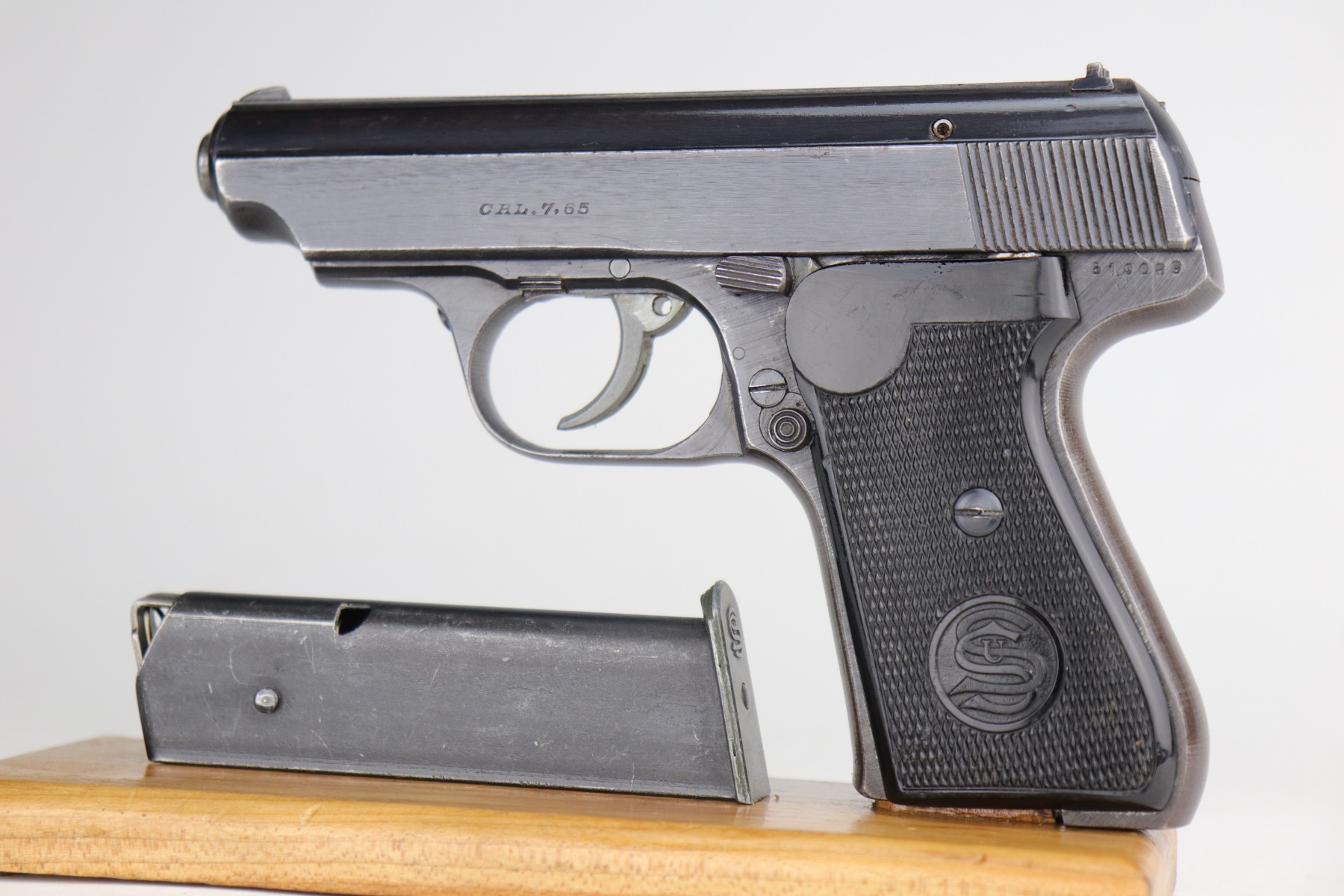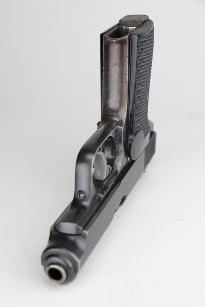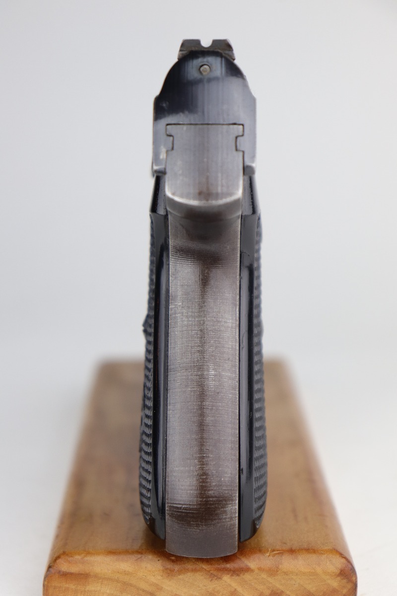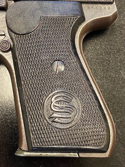 2/15/21 – This is an excellent example of a Sauer 38h sold in the commercial market during WW2. The gun is matching and in excellent condition. It has retained about 96% of its original bluing. There is very minor patina and thinning on the straps. Some very light spotty freckling on the slide here and there. It comes with excellent period-correct grips and a period-correct magazine. The bore is near-mint. NOTE: There’s a notable crack that was repaired in the left grip panel.
