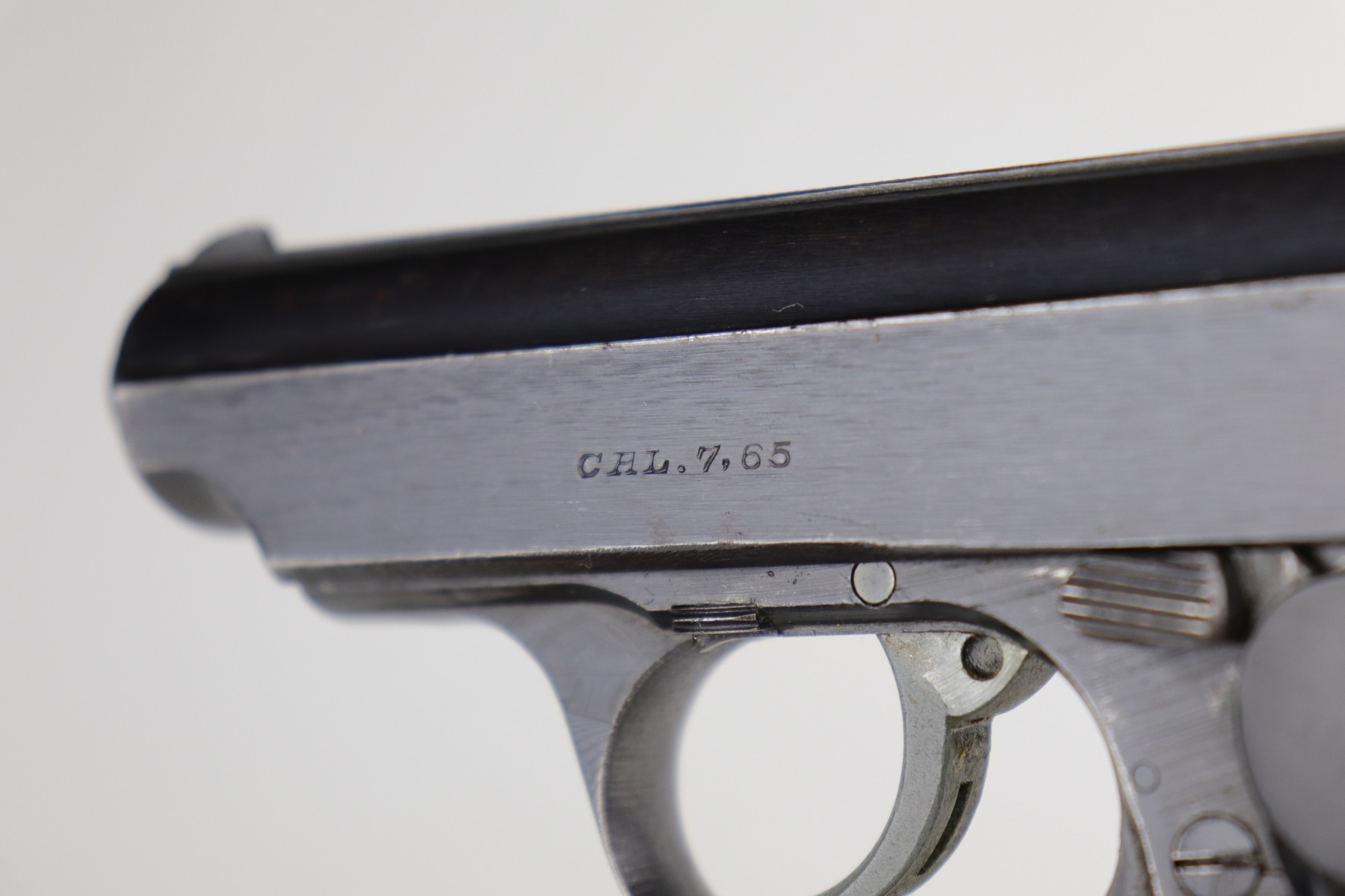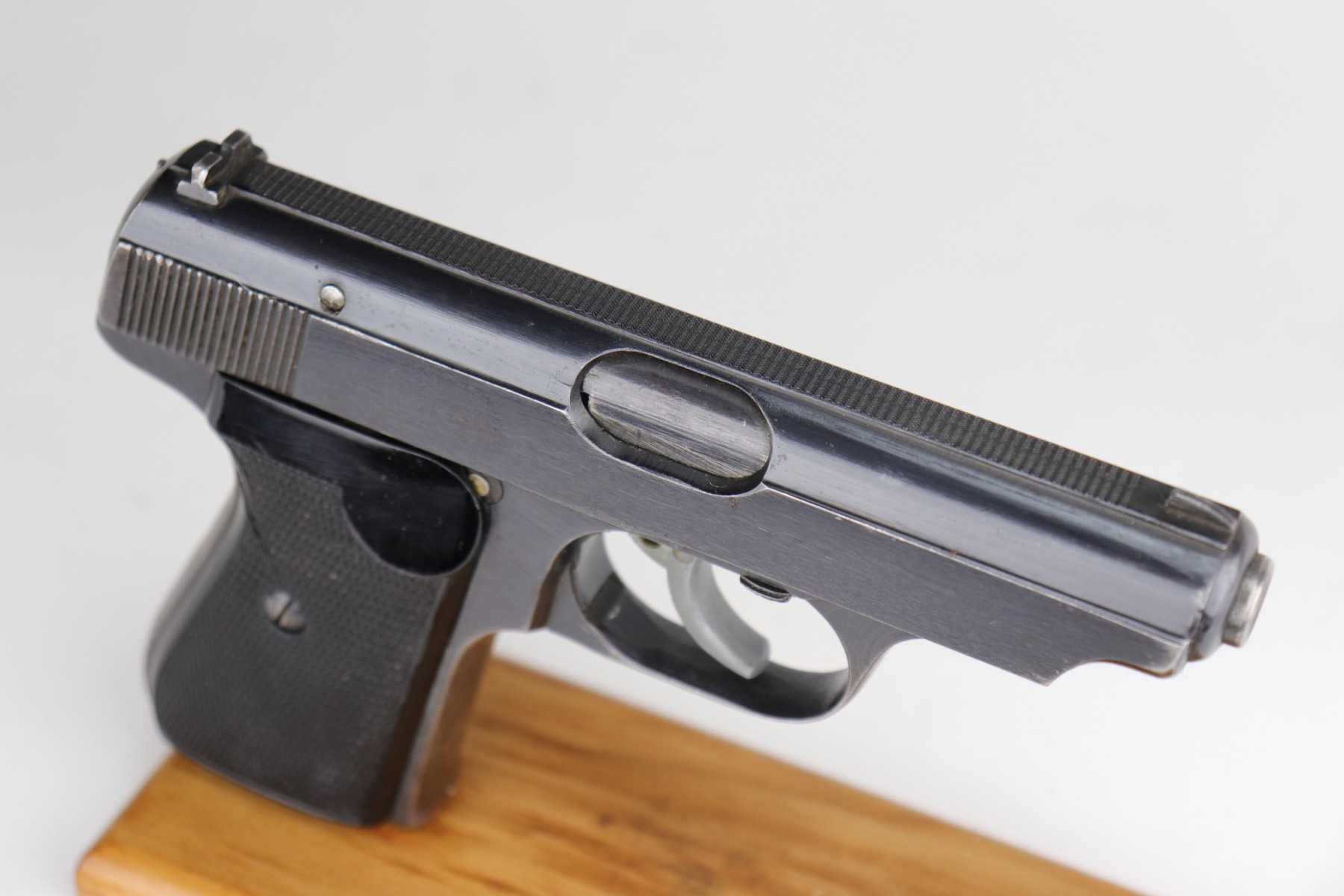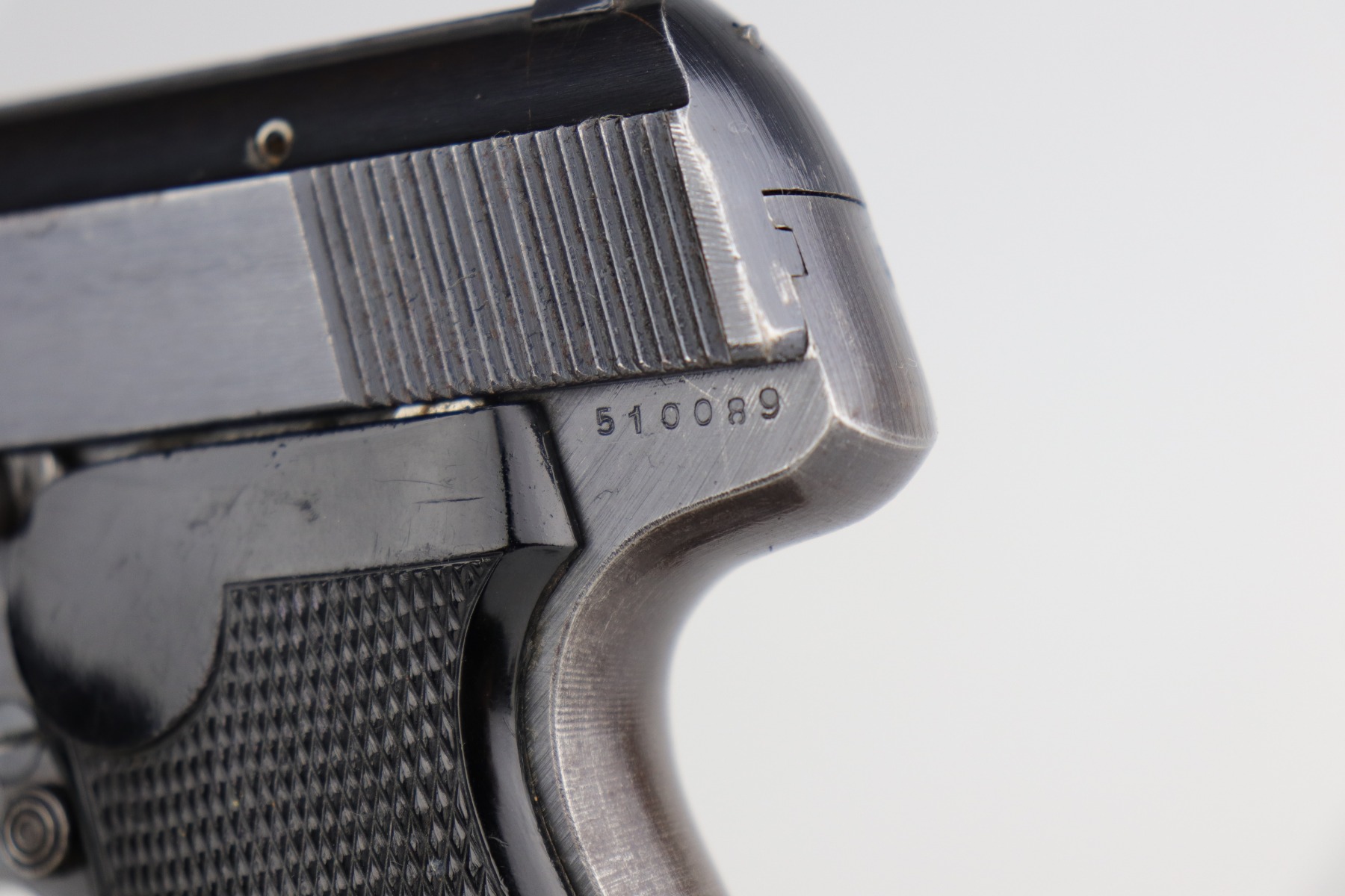 2/15/21 – This is an excellent example of a Sauer 38h sold in the commercial market during WW2. The gun is matching and in excellent condition. It has retained about 96% of its original bluing. There is very minor patina and thinning on the straps. Some very light spotty freckling on the slide here and there. It comes with excellent period-correct grips and a period-correct magazine. The bore is near-mint. NOTE: There’s a notable crack that was repaired in the left grip panel.