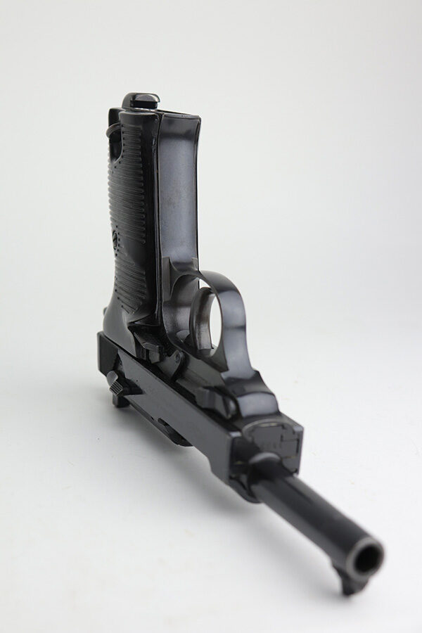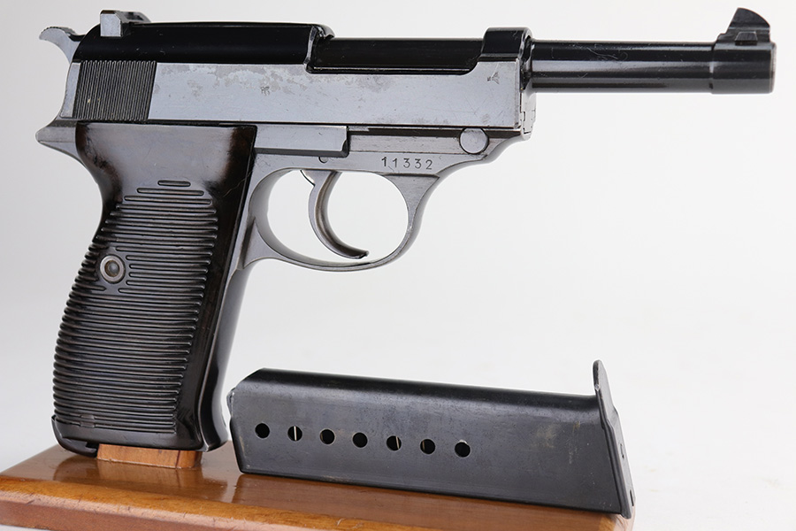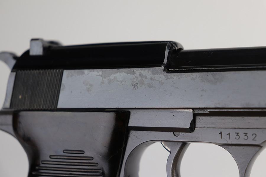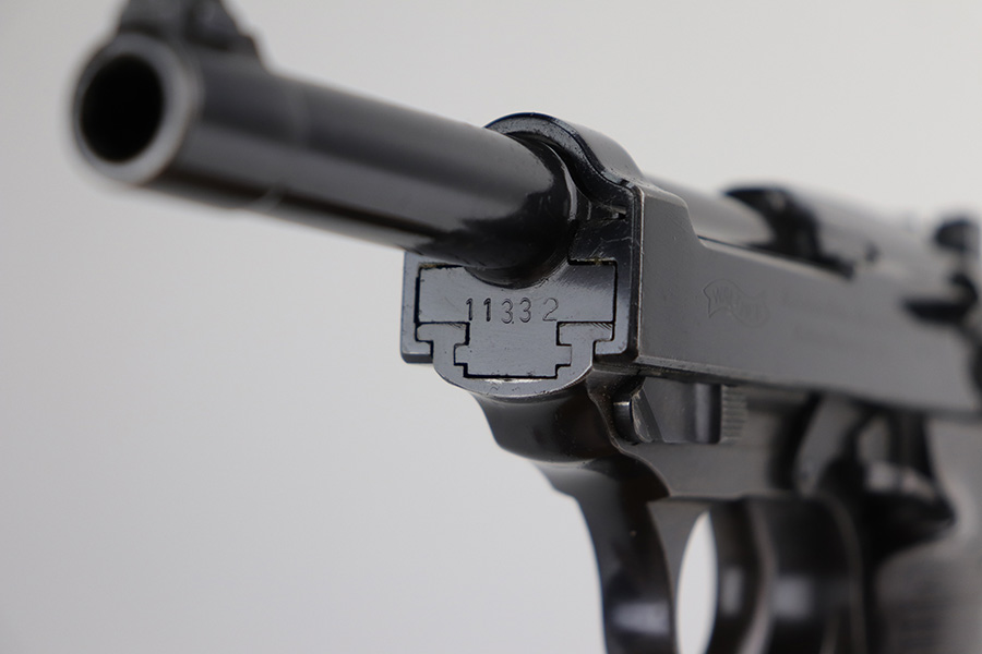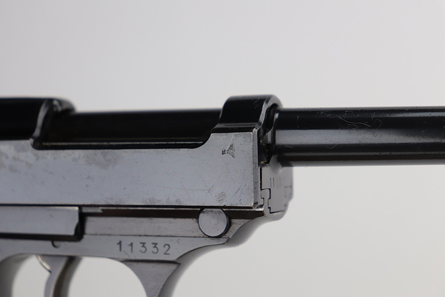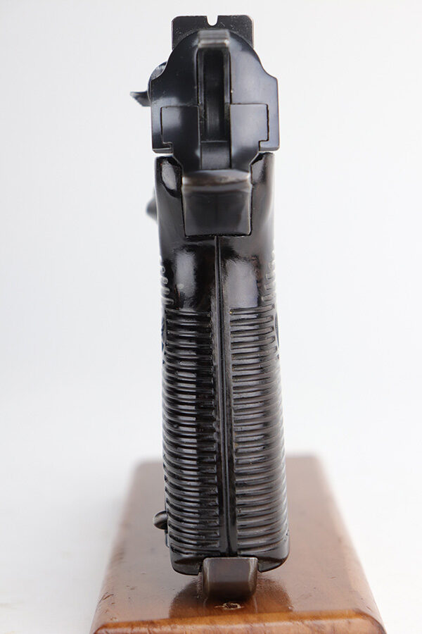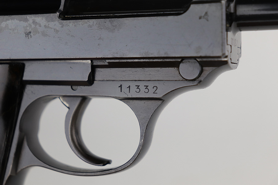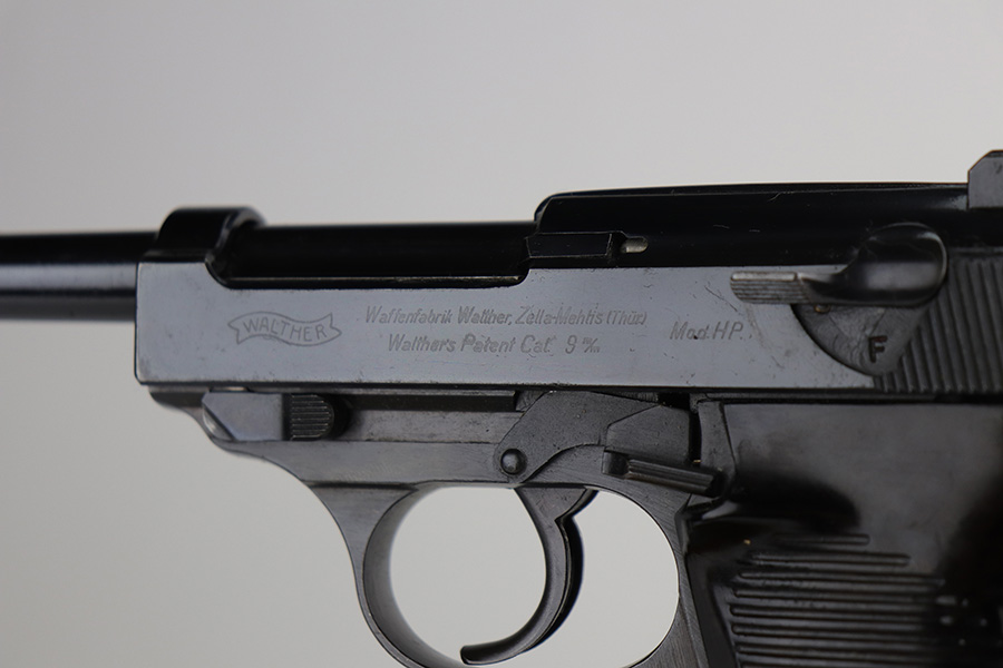 8/20/21 – This is an excellent example of a commercial Walther Mod HP that was delivered to the Nazi military. It is all matching, has the proper commercial “Eagle N” proofs, and has the proper “Eagle 359” military proof on the right side of the slide. Comes with excellent grips and an unmarked magazine. It has retained about 98% of its finish. We believe the slide has been refinished. There is minor wear around the high edges. Minor pin-pricking on the front strap. While there is very little actual finish loss, there is an area of discoloration and minor pitting on the right side of the slide. Excellent bore – shiny with strong rifling. De-cocker is functional. This gun is listed by serial number on page 140 of Krutzek’s P.38 book.