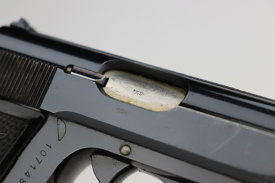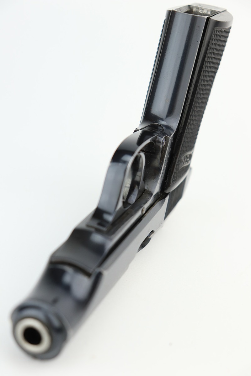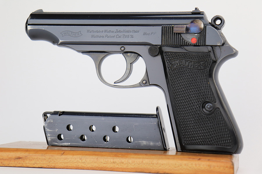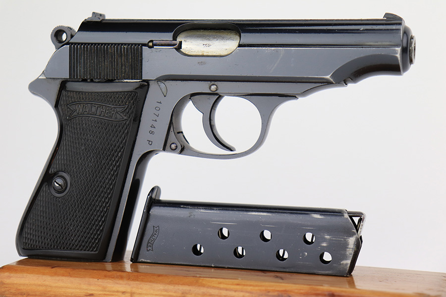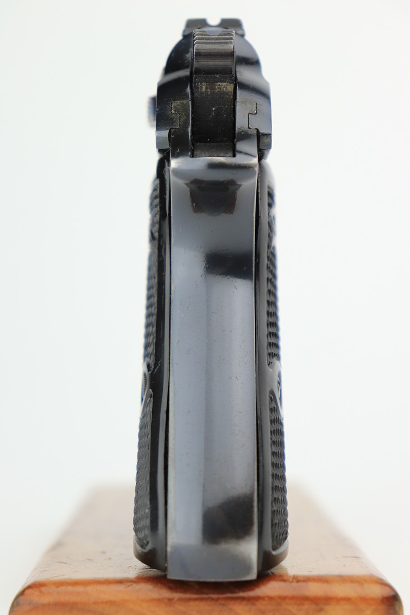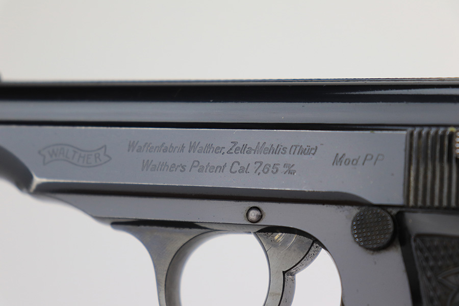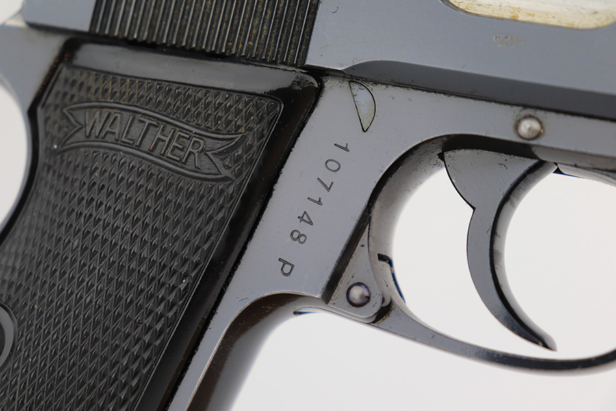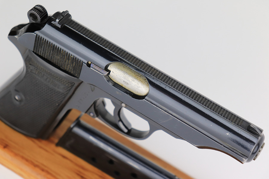 5/12/23 – This is an excellent example of a Walther PP sold in the commercial market in 1938. All matching with the proper “Crown N” commercial proofs. It has retained about 97% of its original high polish finish with minor muzzle wear and an area of wear at the base of the back strap. One tiny area of very minor wear around the ejection port. Fitted with excellent period-correct black bakelite grips and comes with a period-correct Walther banner-only magazine. Mint bore.